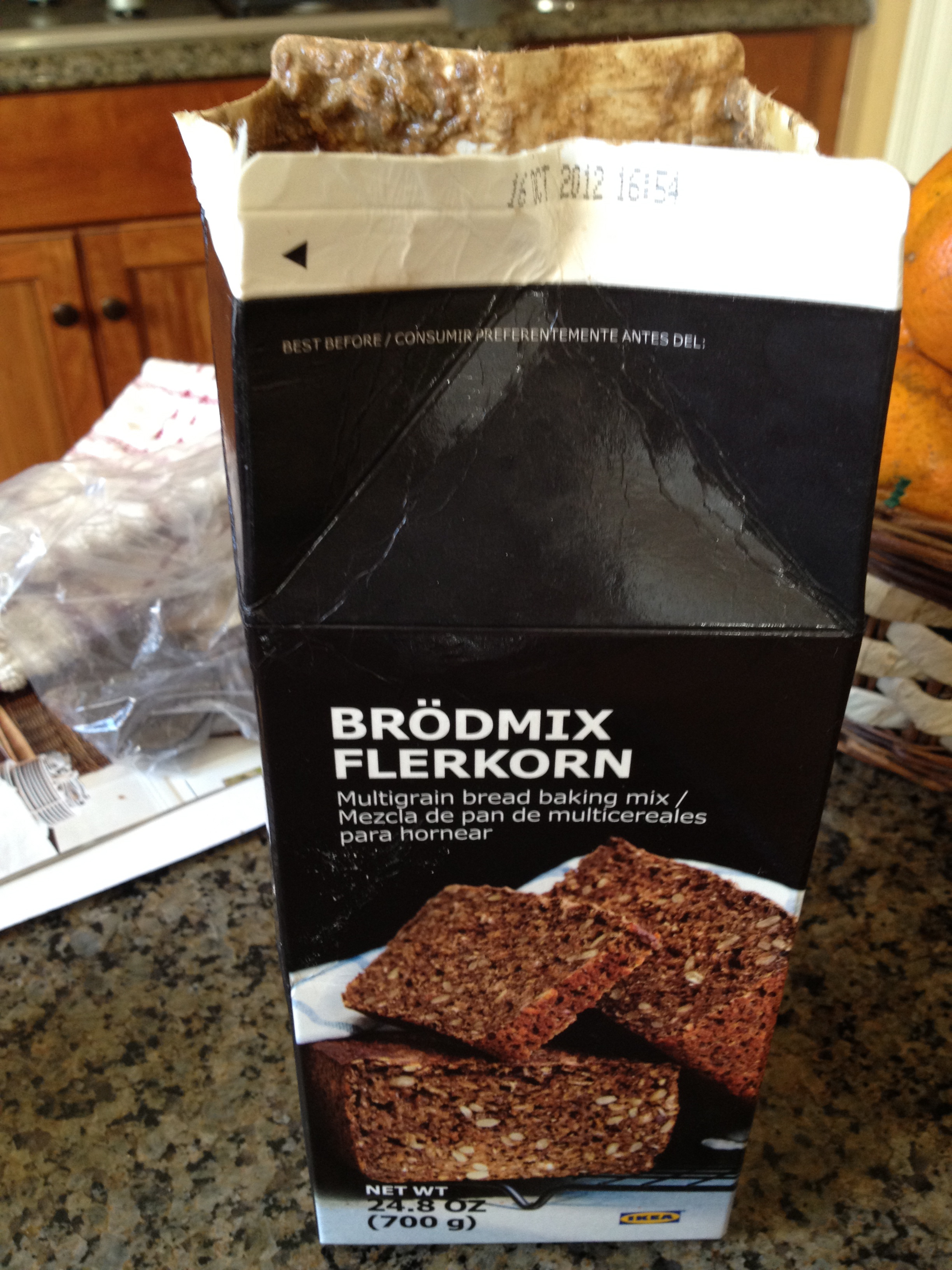När vi var på IKEA hittade jag brödmix där, på riktigt grovt mjöl så det var jag tvungen att köpa. Mjölet ligger i en tetrapack: