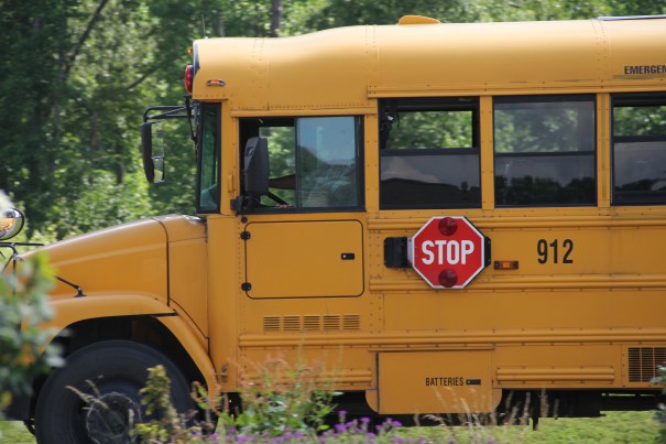 Morgonen börjar med att bussen hämtar kl 8.02. Prick! Den stannar med täta mellanrum i varje kvarter, vi har det extra bra eftersom den stannar nästan precis vid vår tomtgräns. Tess kan i princip stå och titta i fönstret och gå ut när hon ser att den kommer:
