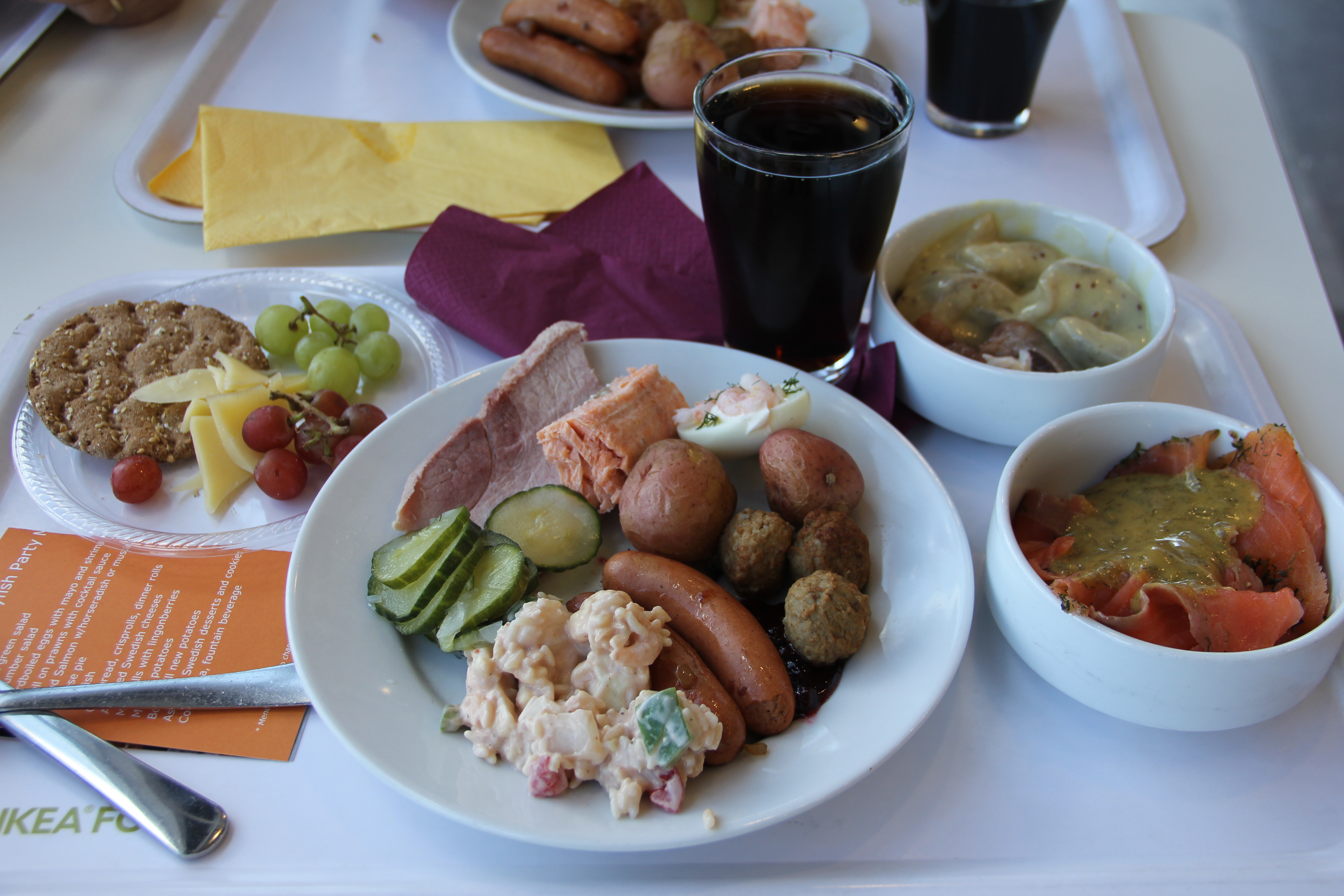 Buffé stod det i annonsen, och i Sverige hade ju det inneburit stora fat med mat där var och en tar det den vill ha. Men nu är vi i USA, och där skulle man inte komma på tanken att låta vem som helst kladda runt i maten och sprida baciller. Därför stod man i kö och fick sig tilldelat en tallrik där personalen lagt upp maten åt en. Åtminstone var det ju svenska IKEA så vi slapp plasttallrikar och -bestick och fick äta på riktigt porslin. Dock fick man ta lax och sill själv, och jag lassade på så mycket att Björn skämdes och gick… :mrgreen: Nubben lyste med sin frånvaro och tur var väl det annars kanske man shoppat upp halva varuhuset efteråt! 😉