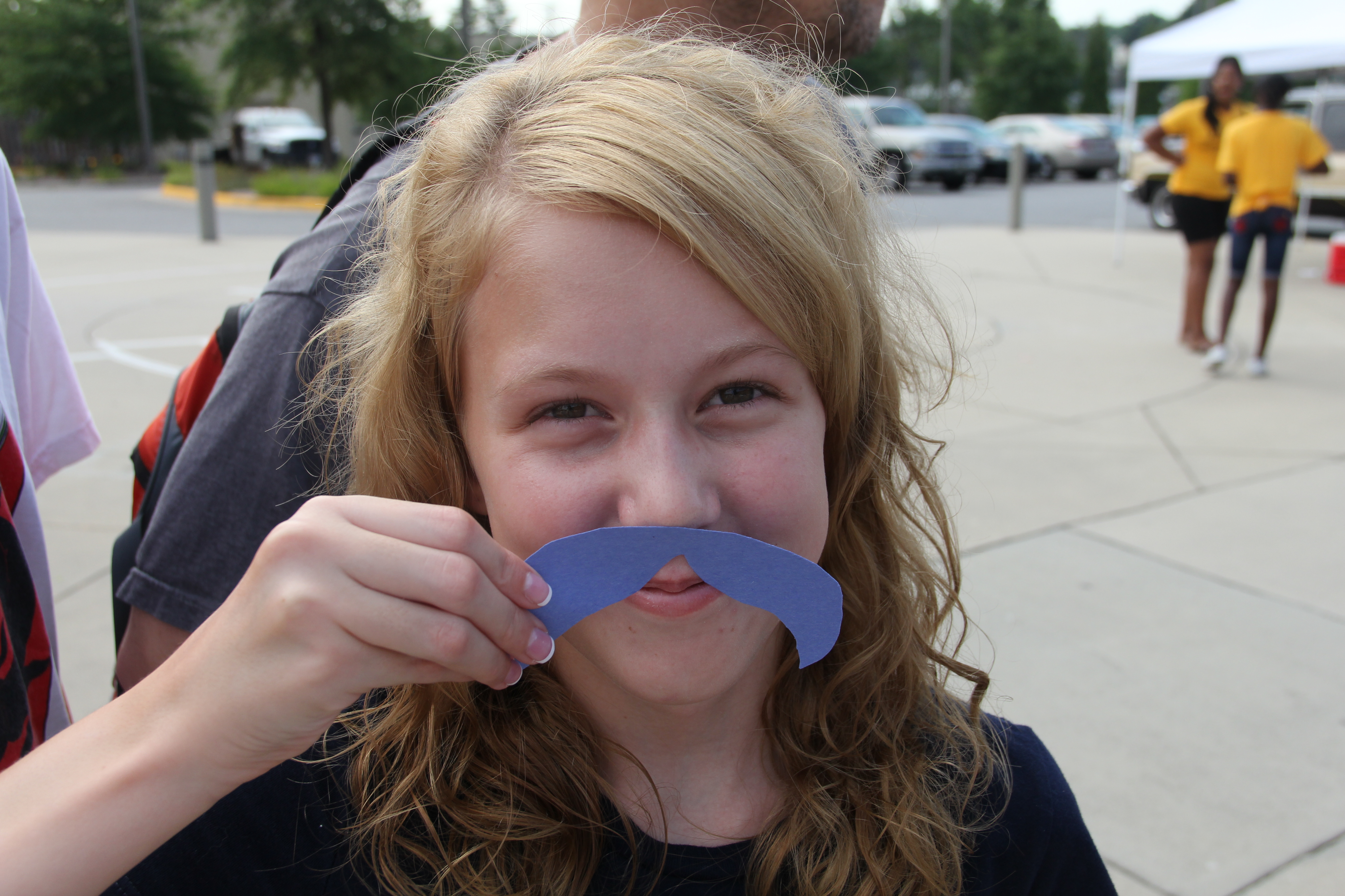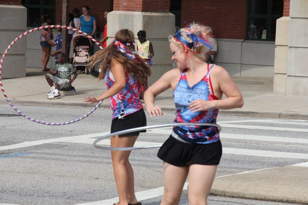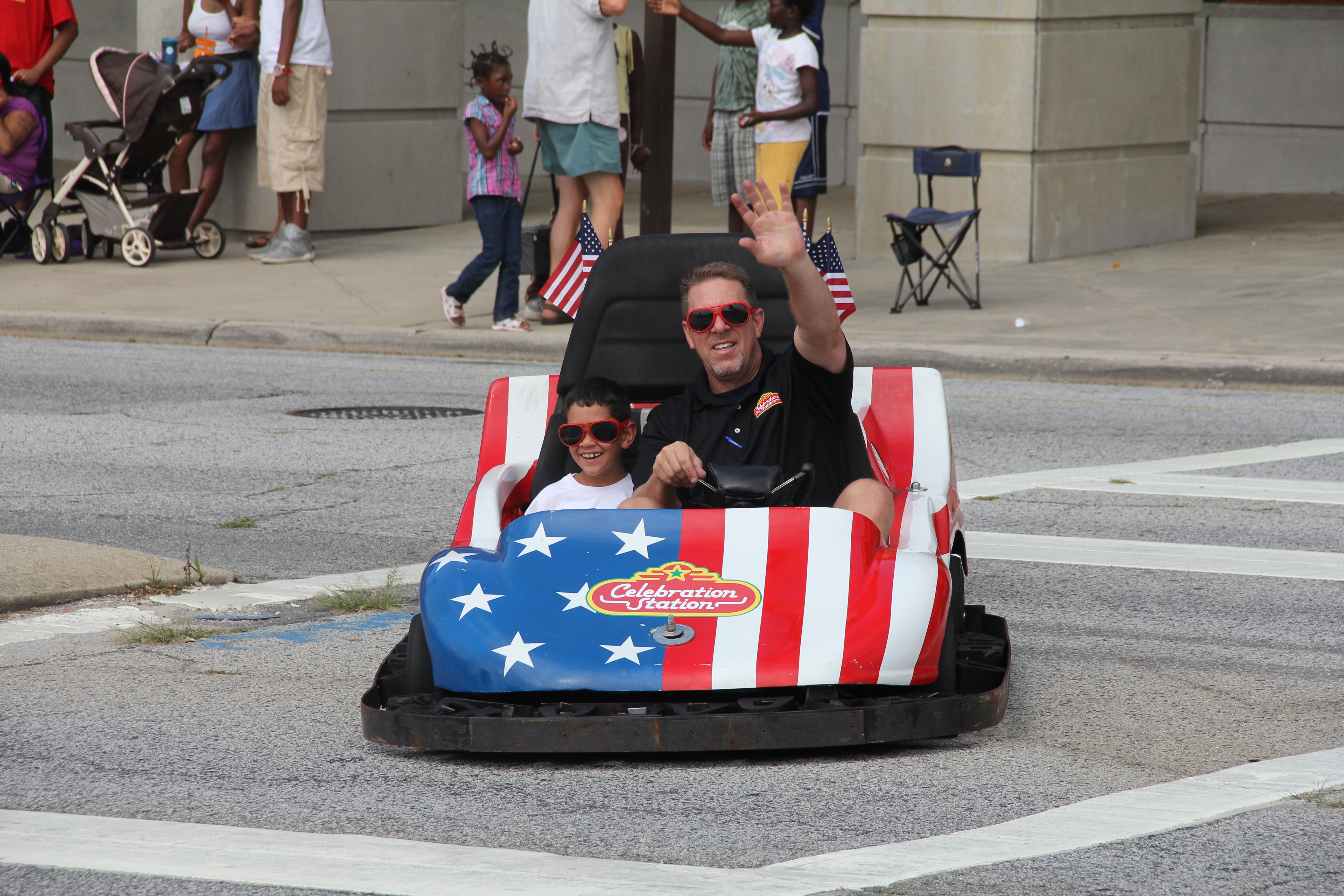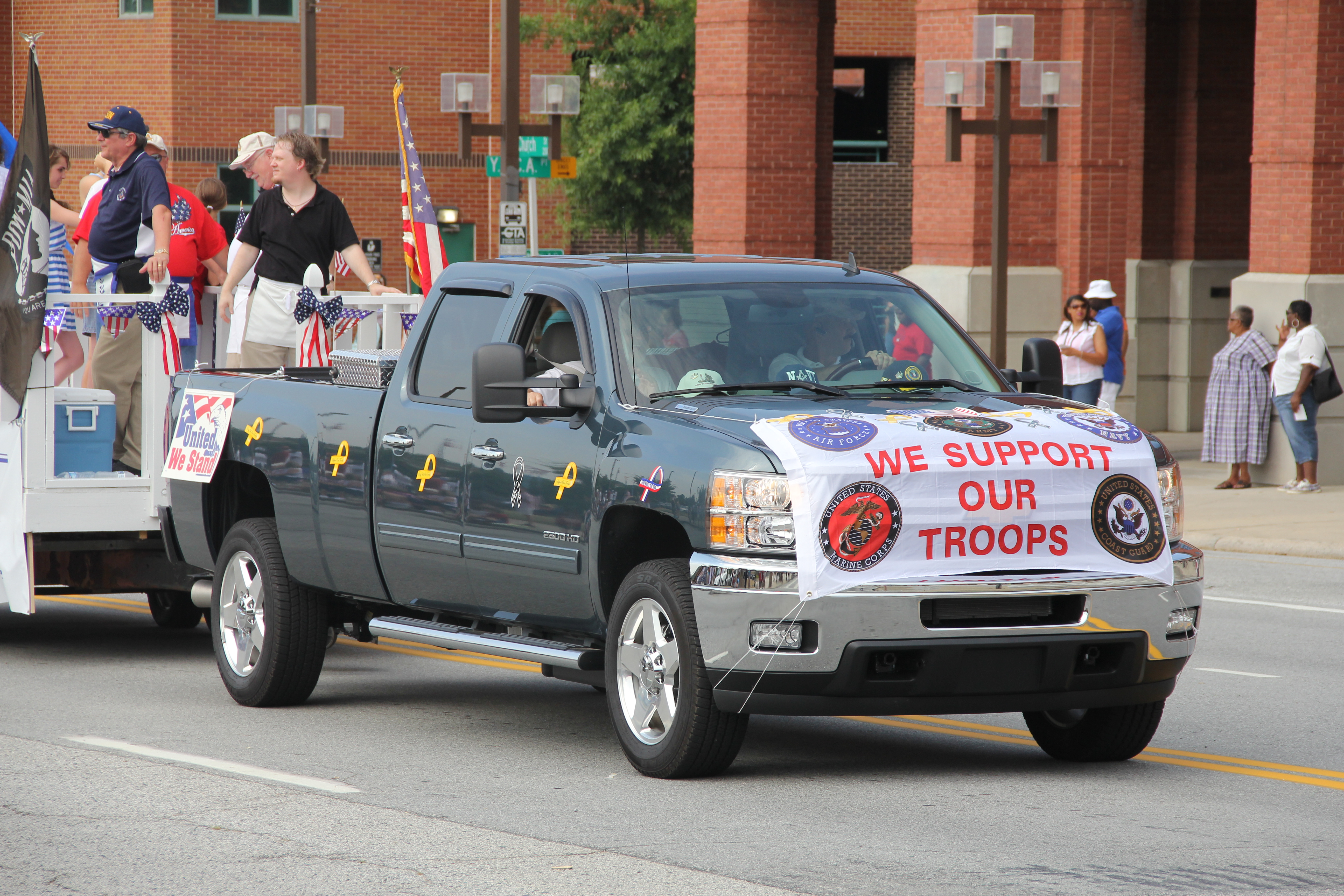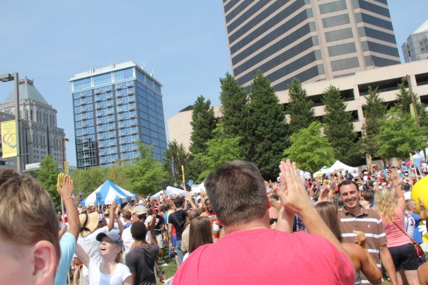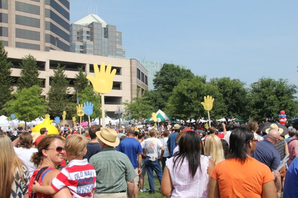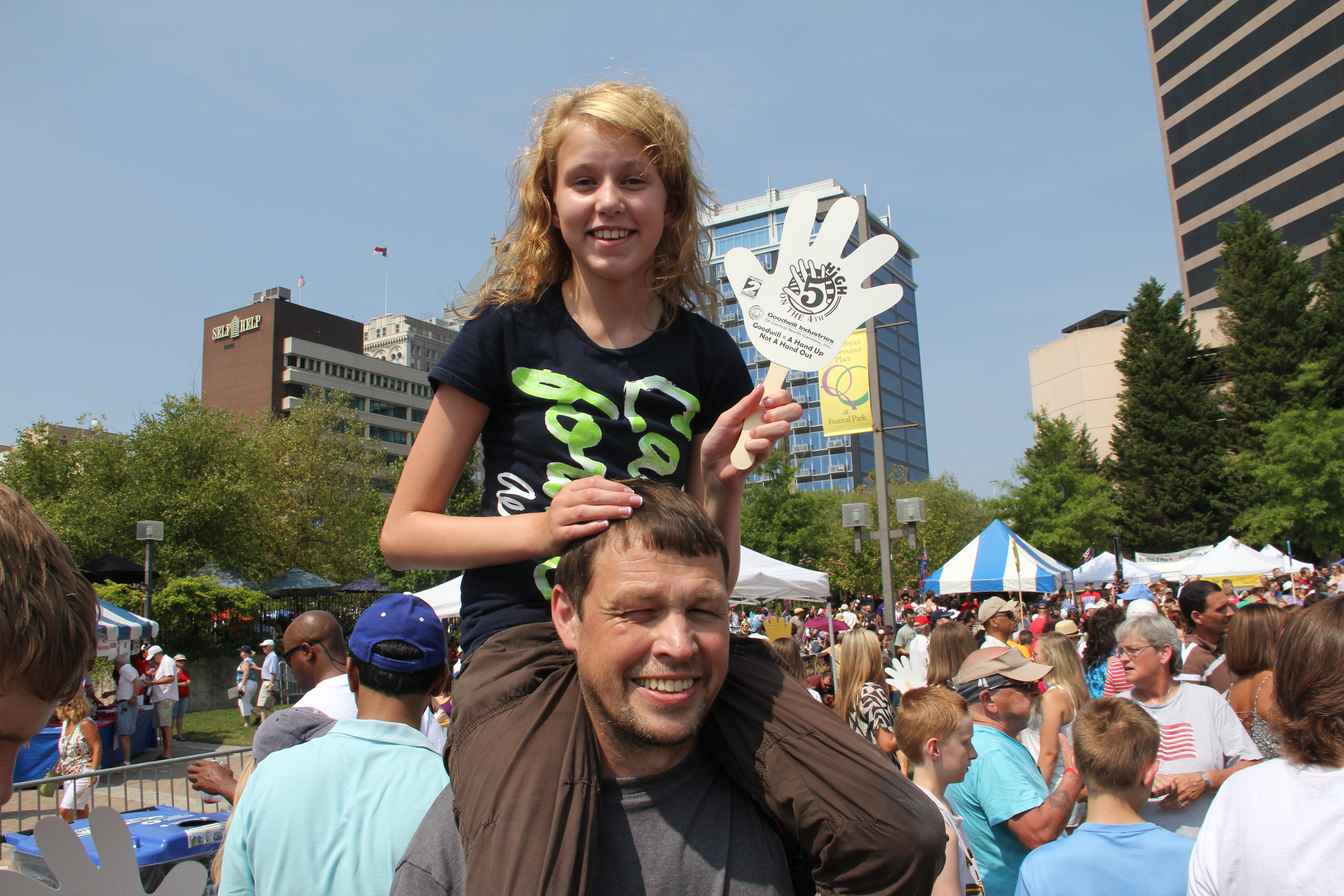Detta var en del av dem som var med i paraden, det var en hel del till… När detta var slut var det dags att försöka slå världsrekord! Lilla Greesnboro hade bestämt sig för att man skulle försöka slå Las Vegas världsrekord från i våras på flest människor som gjorde high five samtidigt 🙂 Det ville vi ju självklart vara med på. 3502 personer var rekordet på, vi behövde alltså toppa det med två personer (eftersom man ju inte kan göra high five med sig själv som Max så riktigt påpekade när jag var inne på att det räckte med 3503 personer… 🙂 ). Varmt så in i bänken var det, runt 40 grader som det varit de senaste dagarna så det var en svettig väntan på att det skulle bli dags. Det delades ut händer för att göra reklam för evenemanget, de var jättebra att använda till att fläkta sig med!
