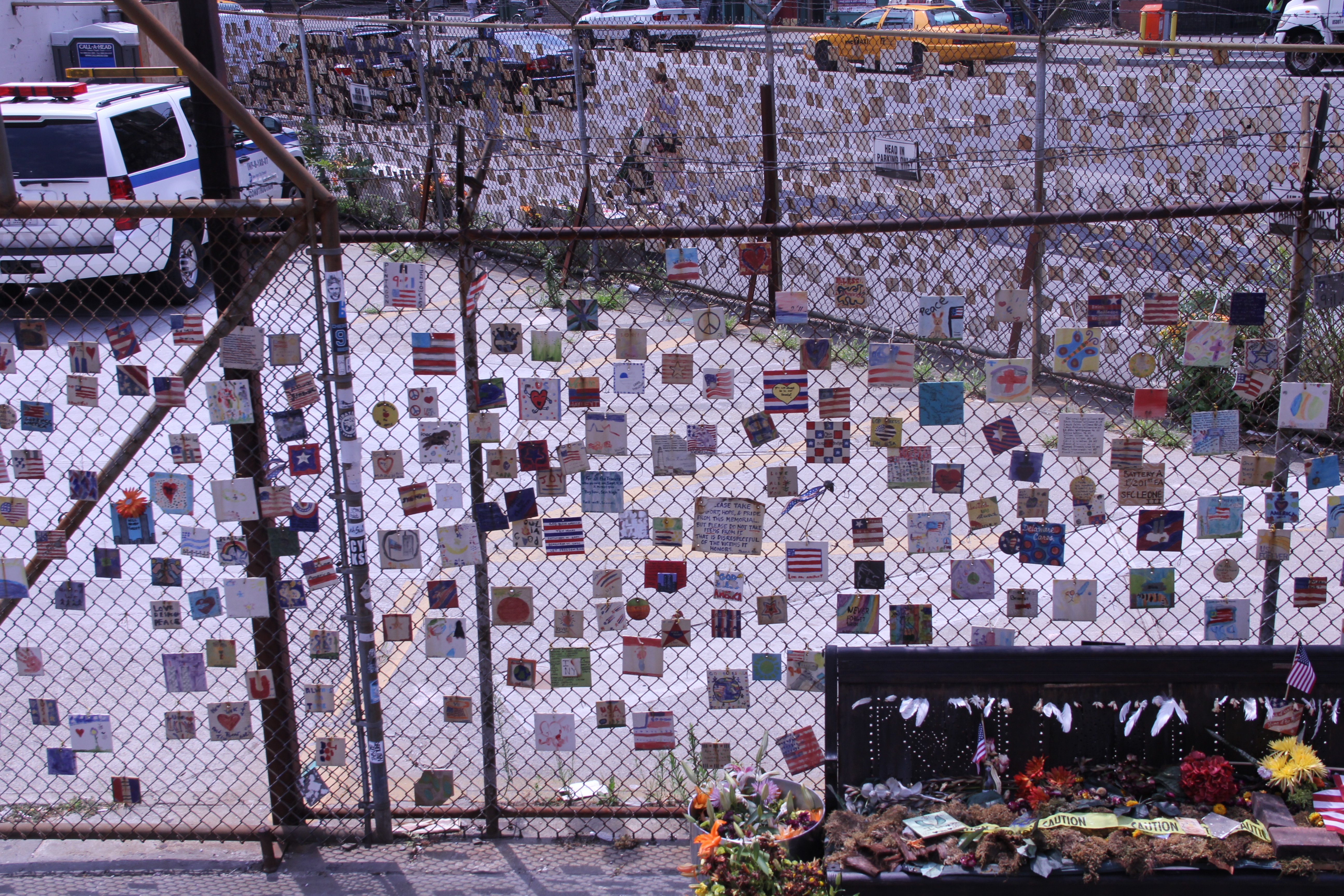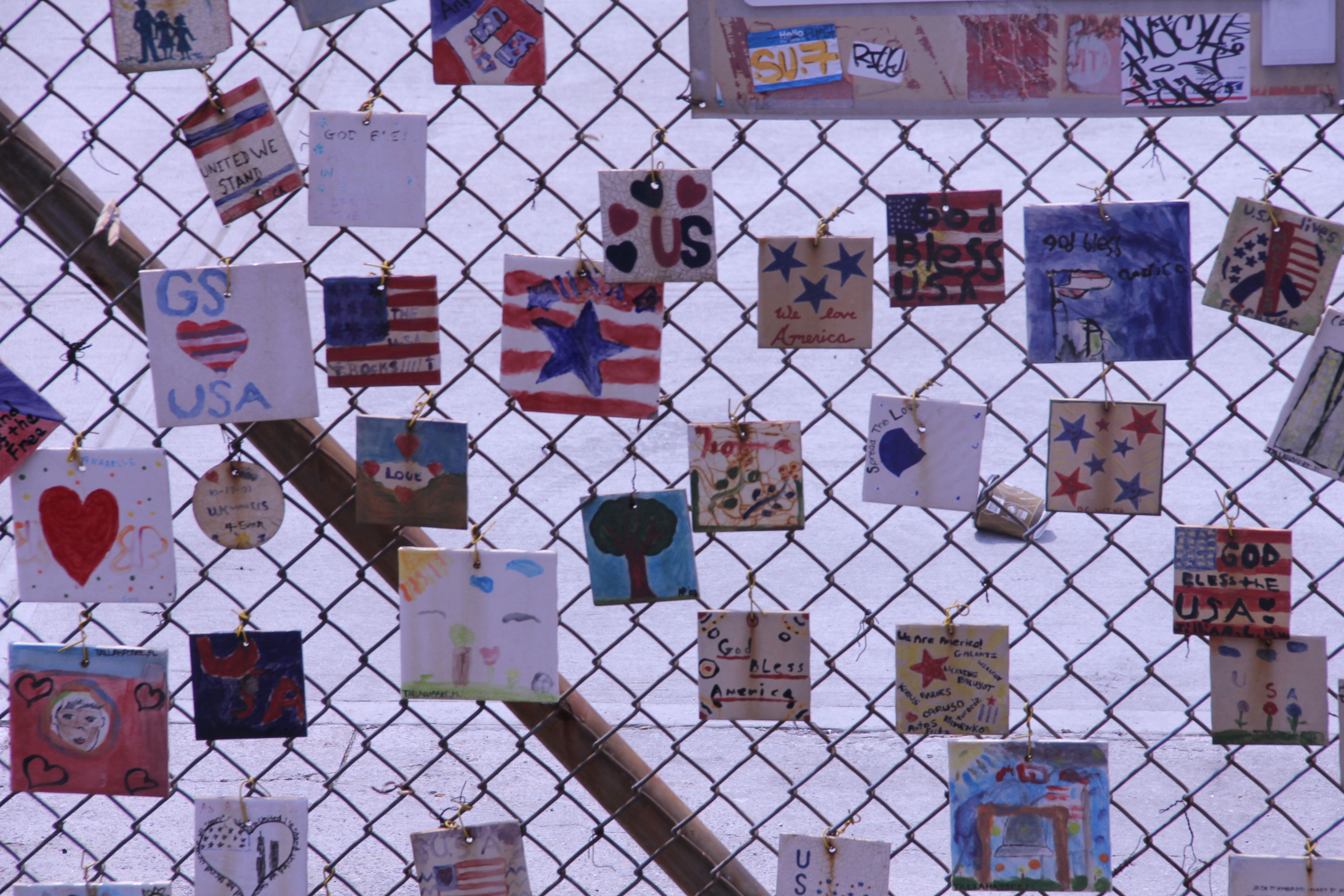 På vägen passerade vi även ett ställe där man hängt upp kort med hälsningar till de som blev offer för 11 september-attacken. Jag hade gärna gått runt där och läst på korten men nu fick vi nöja oss med att fotografera i farten när vi åkte förbi med bussen: