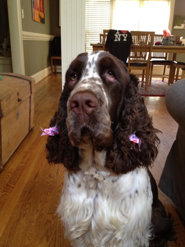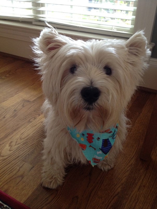 När jag senare kom och skulle hämta henne höll jag på att få en chock. Vi är ju i USA nu, vilket ibland märks mer än annars. När Morris blivit trimmad och jag kommer och hämtar honom så har de alltid hängt på honom en snusnäsduk runt halsen: