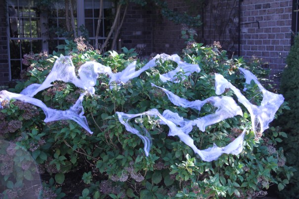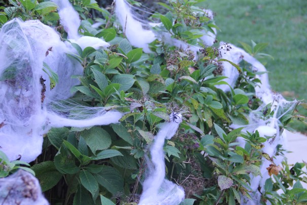Tess tyckte att spindelnäten mest såg ut som om någon lindat toapapper runt buskarna, och lite ligger det väl i det… 😳 Å andra sidan kunde ju barnen tro att någon redan gjort ”bus” hos oss så att vi slapp mer av den varan! 🙂 Fast det vete sjutton om någon skulle ha gjort bus även om vi vägrat ge dem godis, vi bor i ett välartat område där man inte sysslar med sånt! 😉