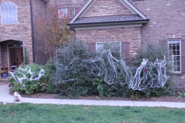 Vi hade förstås dekorerat huset och trädgården, det finns miljoner saker att köpa så man får väl samla på sig och köpa nån ny grej varje år. I år blev det spindelnät i buskarna: