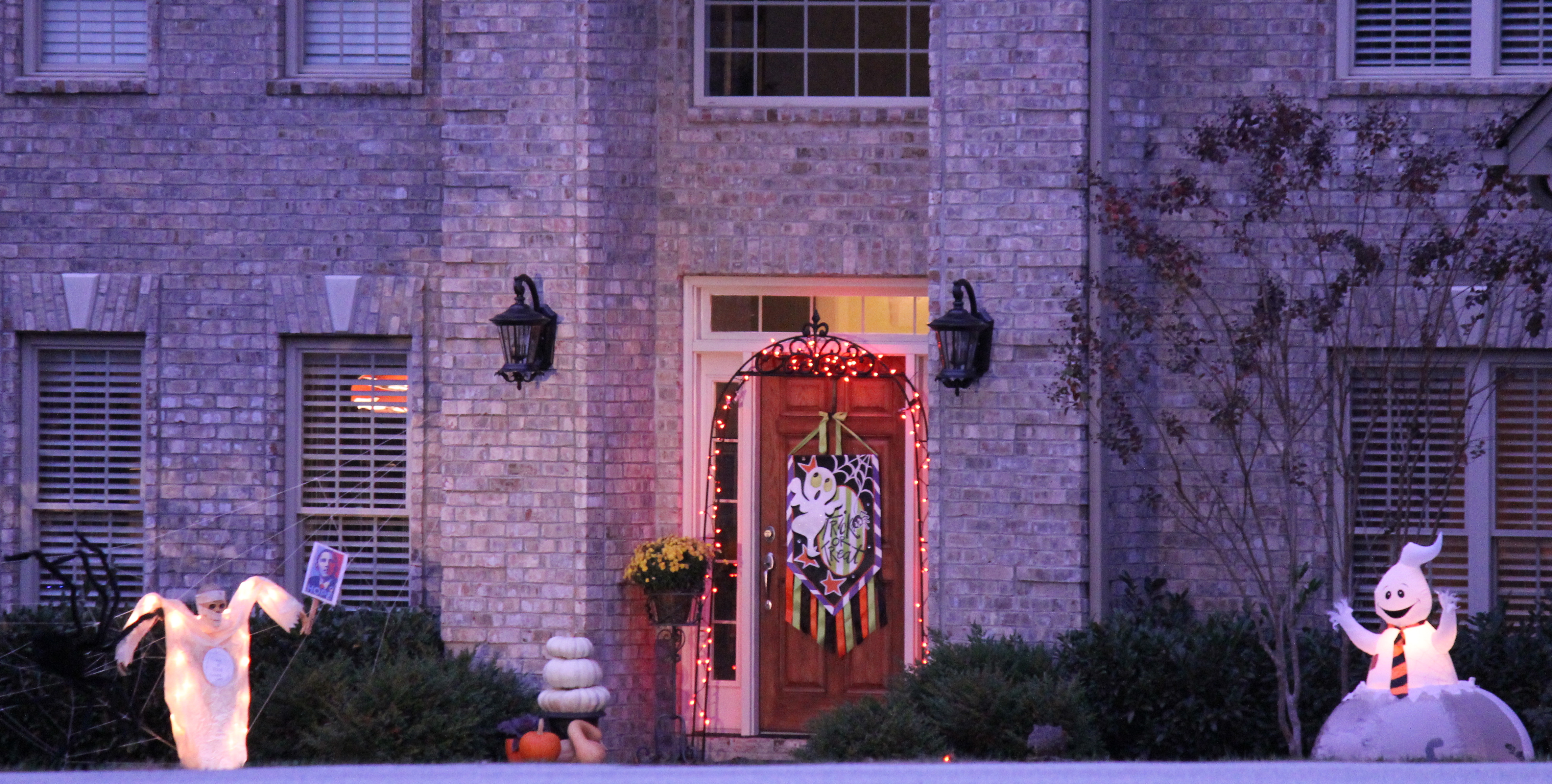 Igår var det halloween, vår första amerikanska halloween! Vi visste ju förstås att det skulle vara en större grej här än i Sverige, det kommer ju ändå härifrån och dessutom är ju inte amerikanarna kända för att vara minimalister direkt, men vi blev ändå förvånade. Jösses, vilket hålligång! 🙂