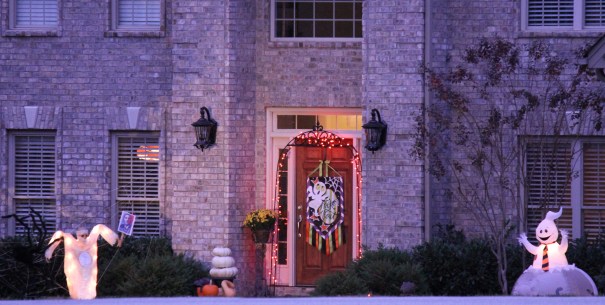 Däremot låg vi ju i lä när man jämförde sig med grannarna. Det märktes att de hållit på med detta några år och hade en hel arsenal med läskiga grejer att pynta trädgården med. Gravstenar med benknotor kringströdda runt omkring, spöken i träden, diverse monster med lysande ögon, you name it… Här är till exempel vår närmsta grannes hus: