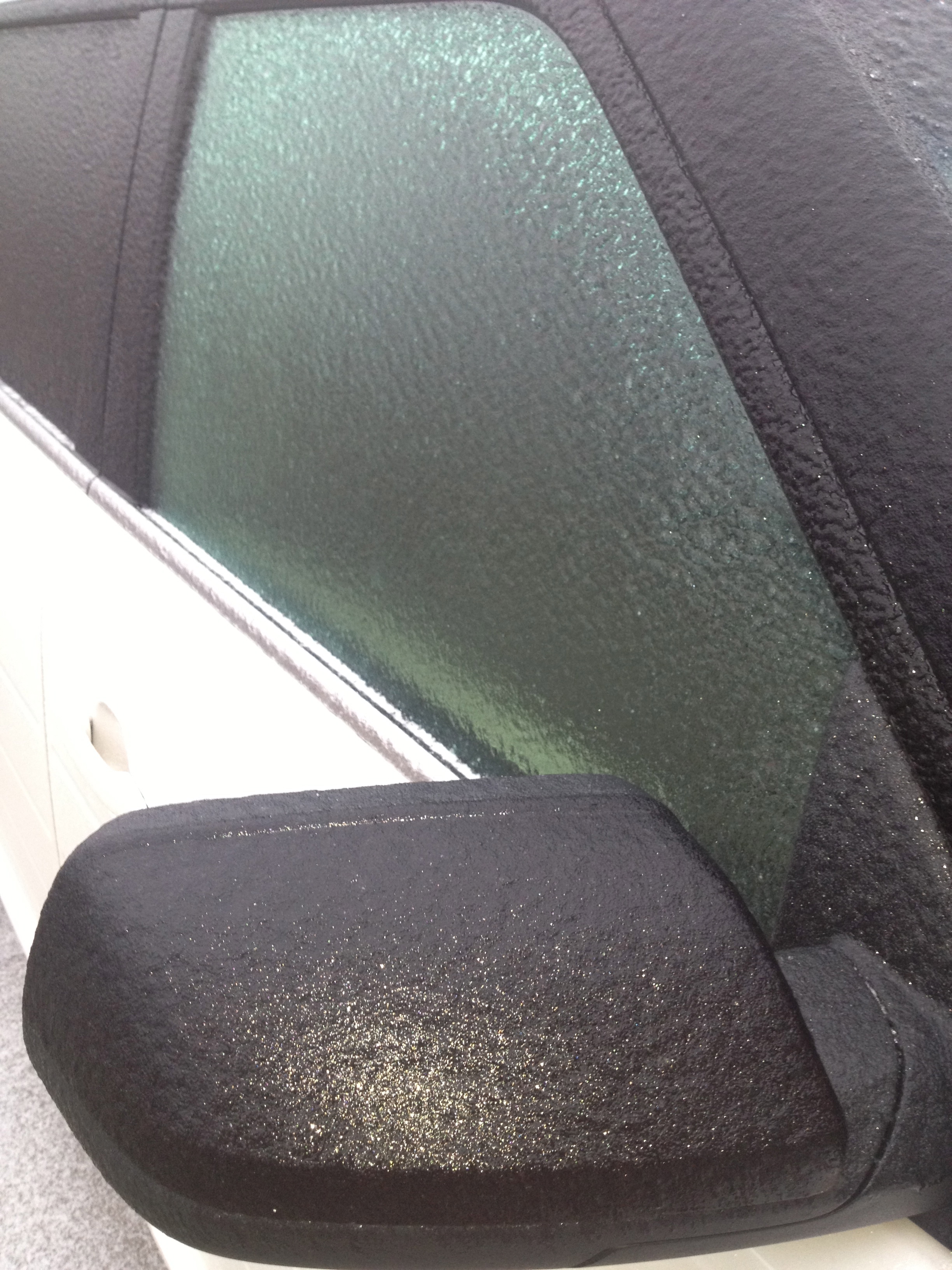 Det gjorde inte det minsta ont så som hagel gör utan det var som ett fint duggregn, men man hörde i träden hur det liksom rasslade ner genom grenarna. Sedan la det sig som ett tjockt istäcke på precis allting. Så här såg bilen ut på eftermiddagen: