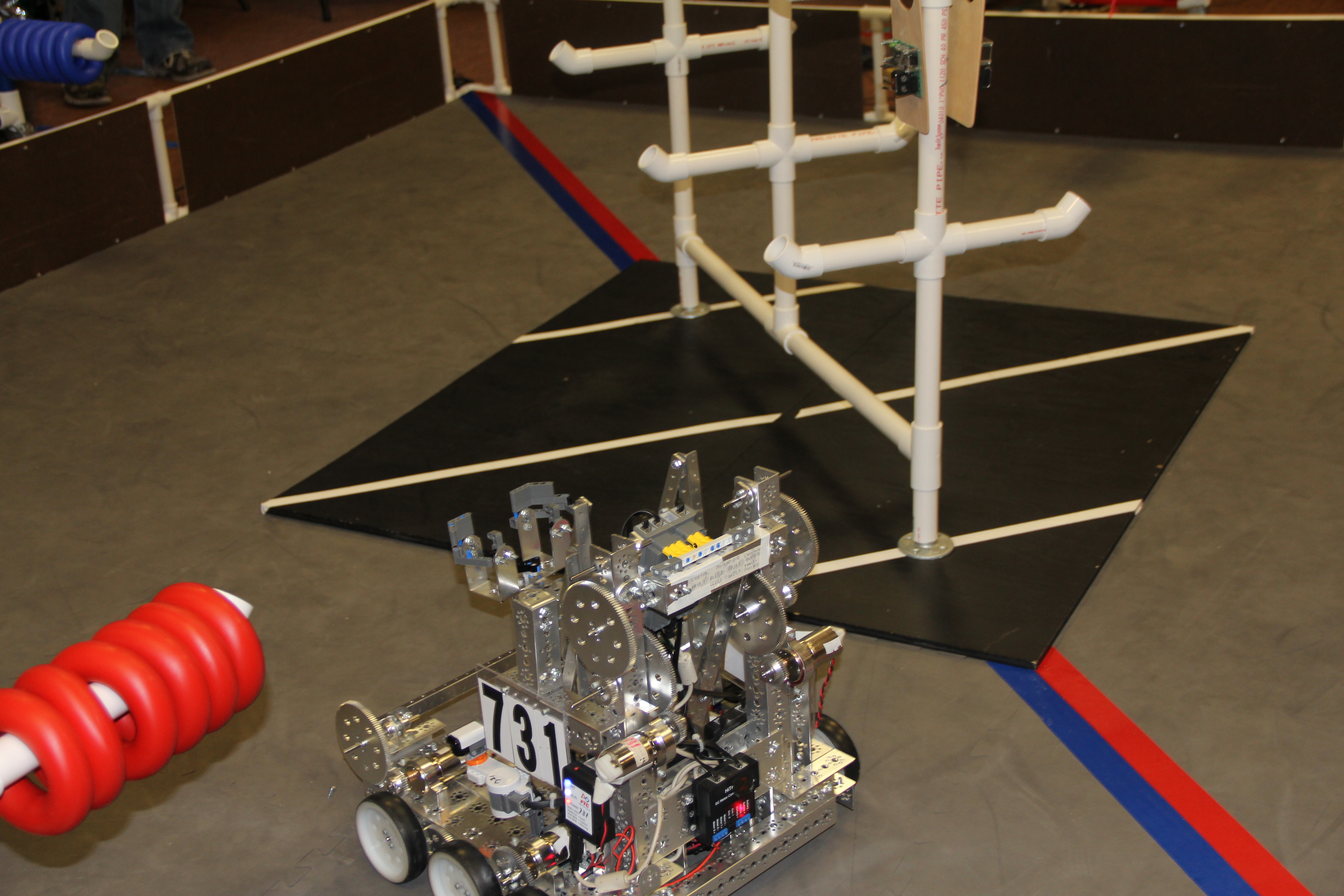 I år har det gått ut på att bygga en robot som ska klara av att plocka ner ringar från en ställning, och sedan hänga upp dem på en annan ställning. Låter kanske inte så avancerat, men är svårare än man tror. Roboten måste kunna röra sig i alla riktningar, stå stadigt, ha en arm som sträcks ut och kan gripa tag i den lilla ringen, lyckas trä på den på pinnen och sedan även släppa den på ett smidigt sätt. Här ser man Max teams robot, i förgrunden ställningen där ringarna hämtas och i bakgrunden ställningen de ska hängas upp på: