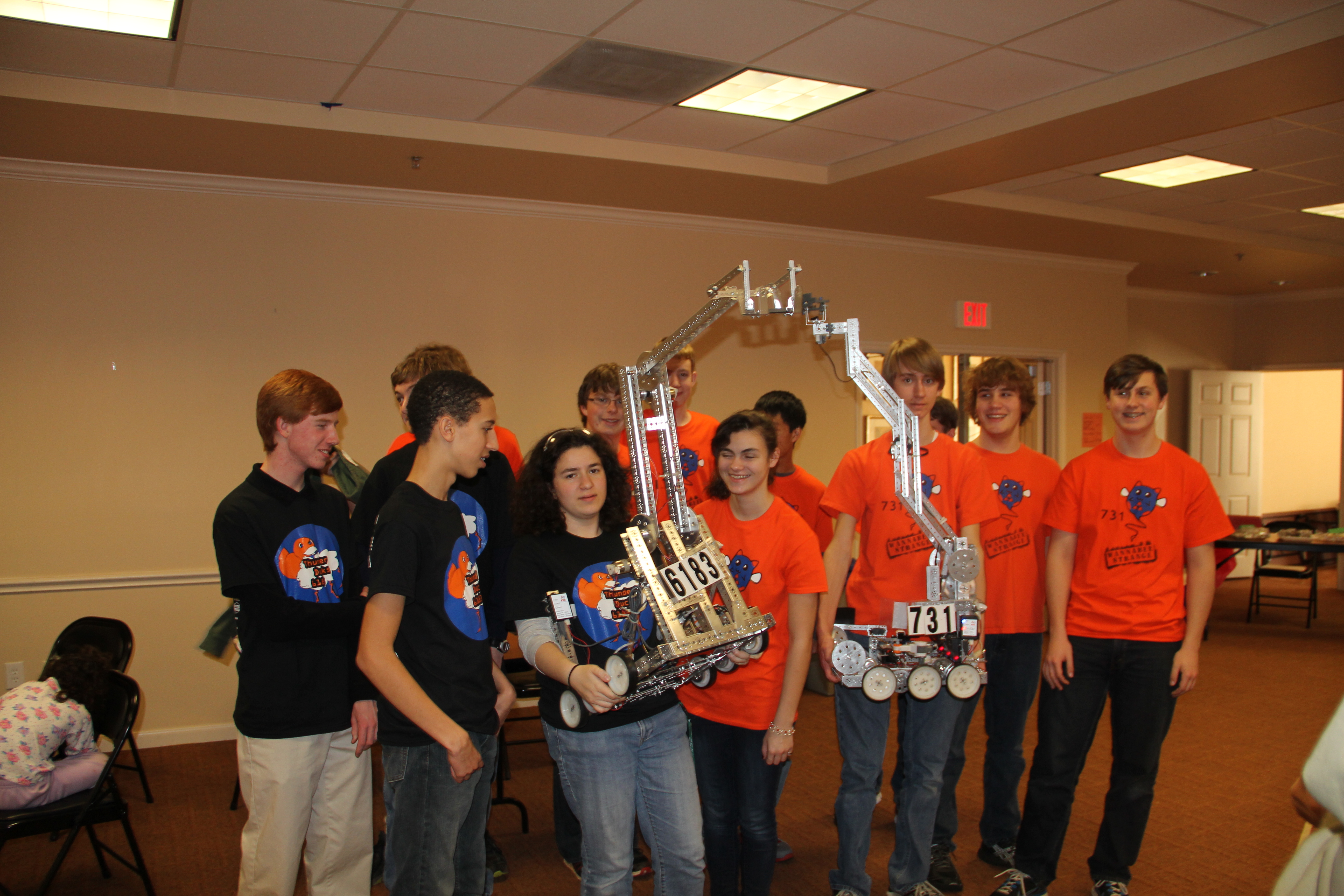 Hela hösten har de byggt på en robot med avsikt att tävla med den nu under våren. Det ordnas tävlingar runt om i hela landet, och Max och hans team, som kallar sig Wannabee Strange 🙂 , kommer att tävla i North Carolina och möjligtvis någon grannstat som Virginia till exempel. Wannabee Strange i orangea tröjor: