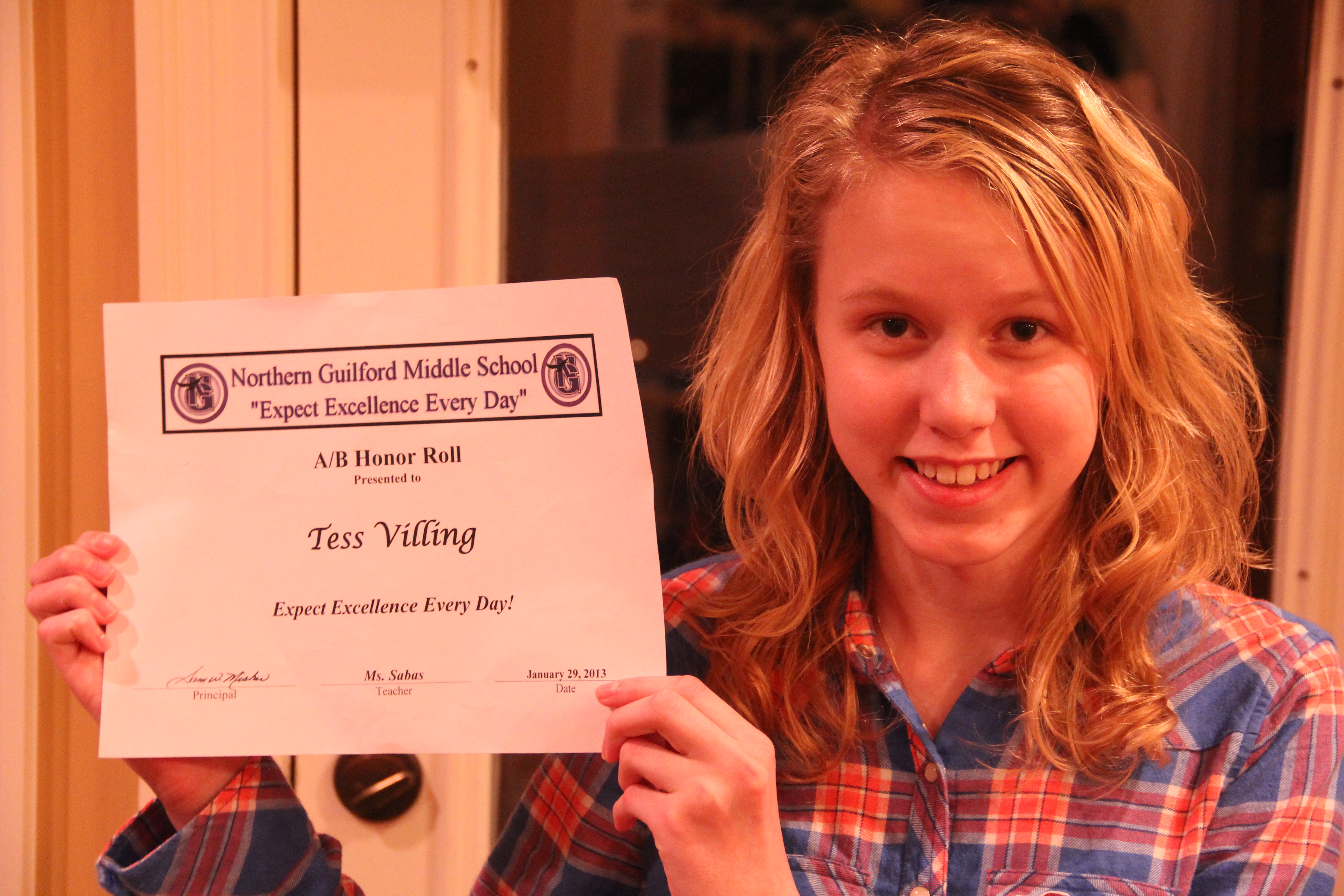 I amerikanska skolor har man nånting som kallas ”honor roll”. Det innebär att man uppmärksammar de elever som presterat extra bra med diplom vid en särskild ceremoni som man har efter varje kvartstermin. Igår var det dags att dela ut diplom till de elever som lyckats bra under höstterminen. På Tess skola finns tre ”kategorier”: ”A honor roll” (de elever som har A i betyg i samtliga ämnen), ”A/B honor roll” (de som har A eller B i samtliga ämnen) och ”perfect attendance” till de som inte haft någon frånvaro. Tess har A eller B i samtliga ämnen, och därför fick hon ta emot diplom: