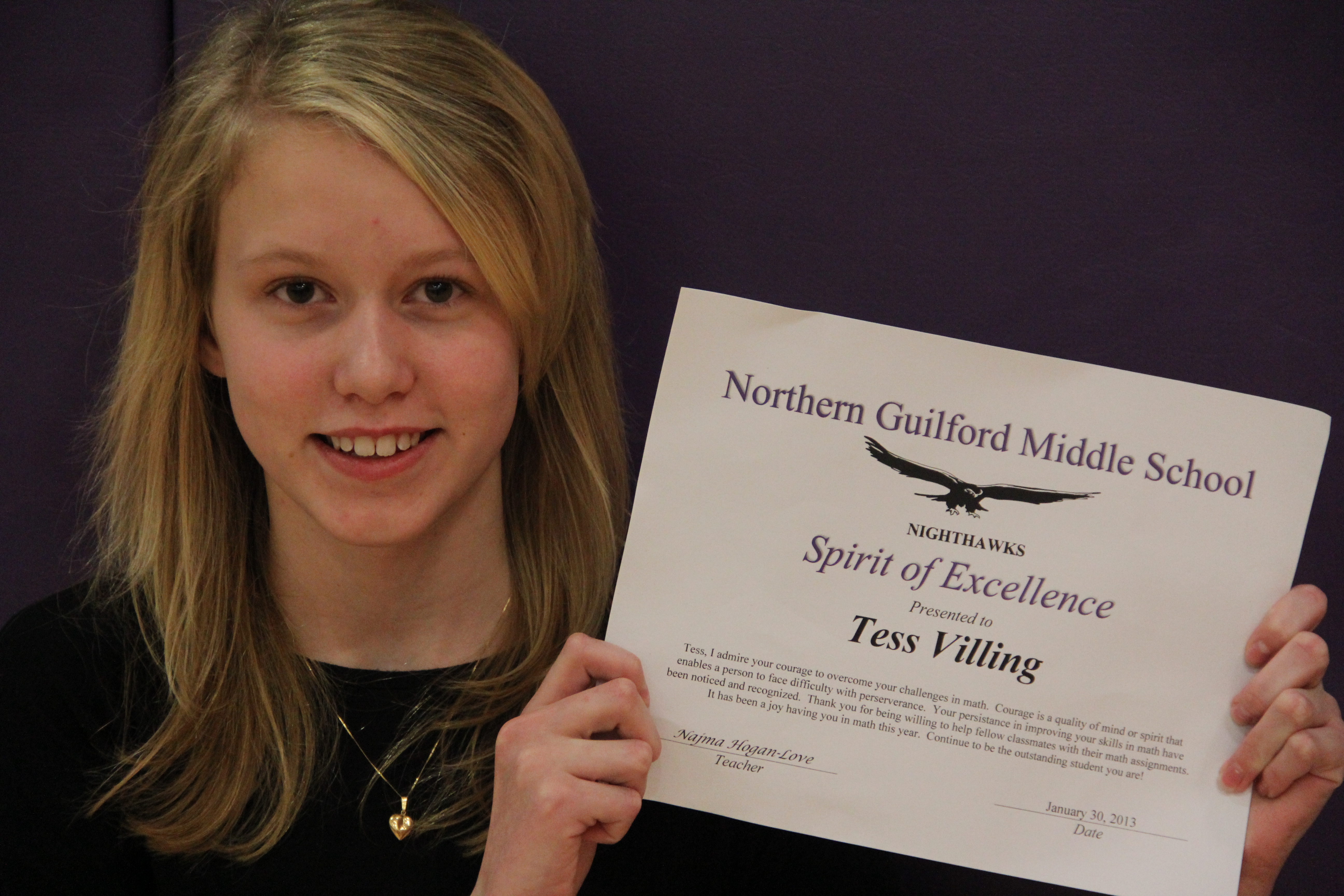 Men i alla fall. Förutom honor rolls så har Tess skola även något som kallas ”spirit of excellence” (som då alltså anspelar på deras valspråk), vilket innebär att varje lärare får utse en eller ett par elever som de tycker har gjort något lite extra. Det behöver inte vara akademiskt, utan kan vara ungefär vad som helst men som är lite mer än vad man ”behöver” göra för att klara skolan. Det kan vara att man är en bra kompis, att man vågar ha åsikter och kan argumentera för dem, att man är en typisk ledargestalt som andra ser upp till m.m. För ett par veckor sedan ringde Tess mattelärare och berättade att hon hade nominerat Tess till detta award! Anledningen var att hon gjort en så fantastisk prestation med matten som var en sån kamp från början. Detta kändes otroligt roligt, förstås!