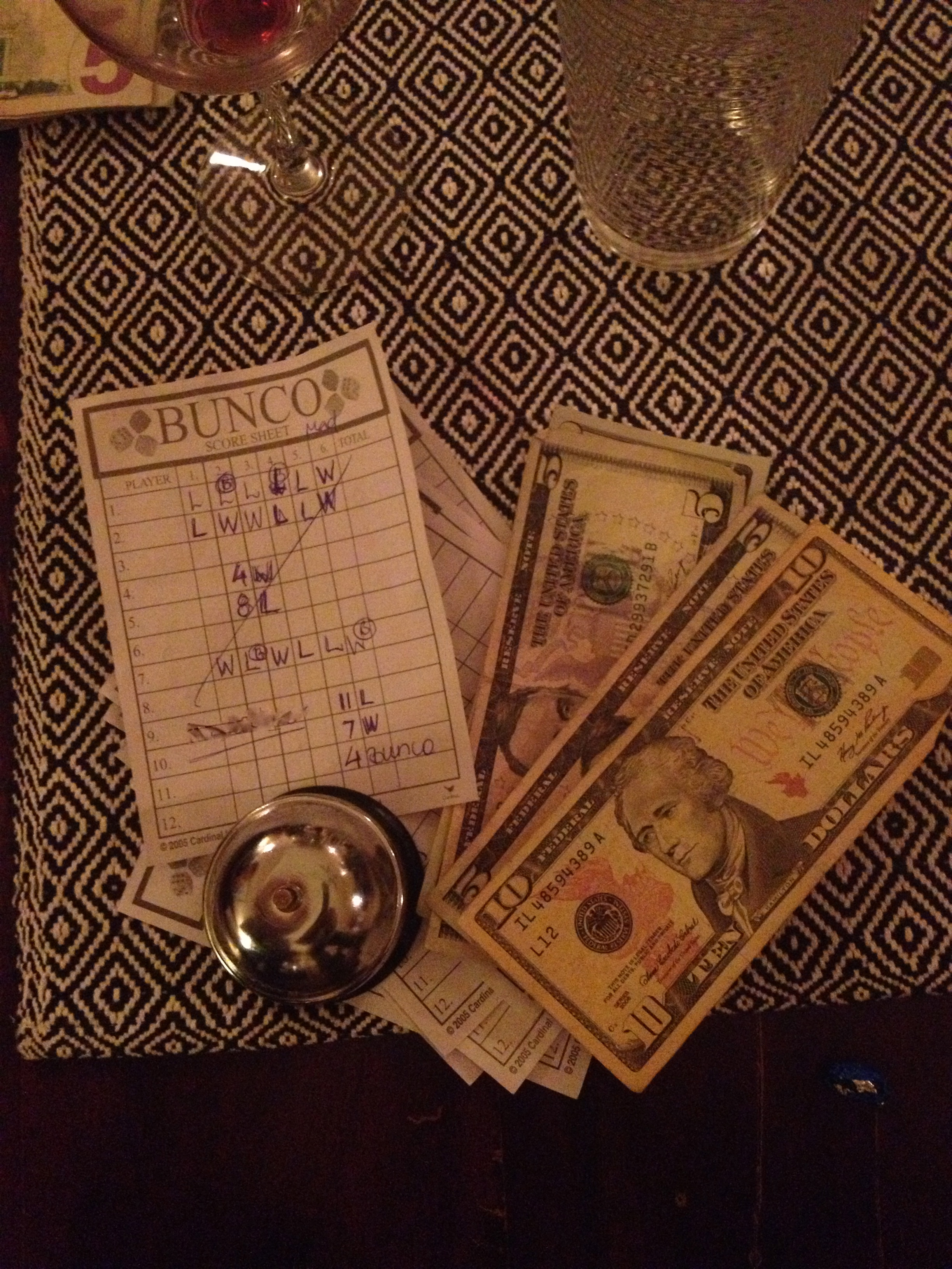 Vi hade en jättemysig kväll med en massa prat, förstås, och för min del var det även premiär vad gäller att spela Bunco. Det är ett tärningsspel som går ut på att samla så många som möjligt av samma valör. Man spelar minst 6 omgångar, första gången ska man ha så många 1:or som möjligt, andra omgången 2:or osv. Man har tre tärningar och får man rätt valör på alla tre får man Bunco. Man satsar 5 dollar var , den som får flest Bunco vinner 20 dollar, den som har flest förluster får tillbaka sin insats på 5 dollar och den som har flest vinster får resten av potten. Jag var länge aspirant på jumboplatsen men lyckades vinna ett antal gånger och hamnade nånstans i mitten och blev därmed utan vinst. Men kul var det!
