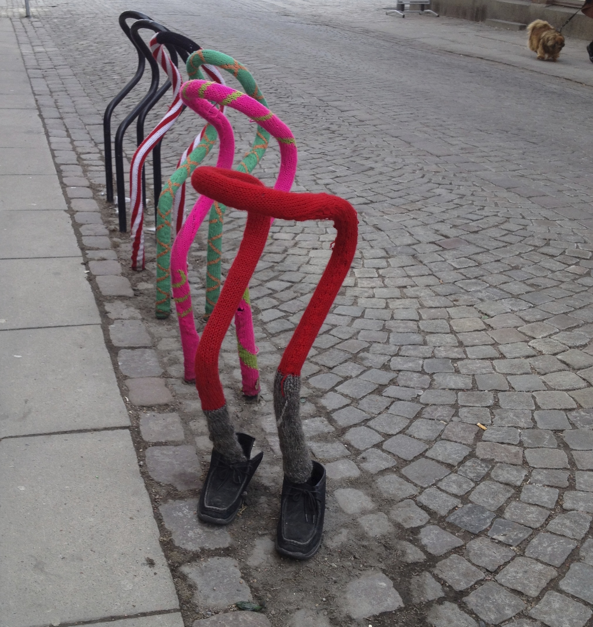 Åter på Kungsgatan såg vi några cykelställ som fått fina stickade vintersockor och till och med skor! 🙂