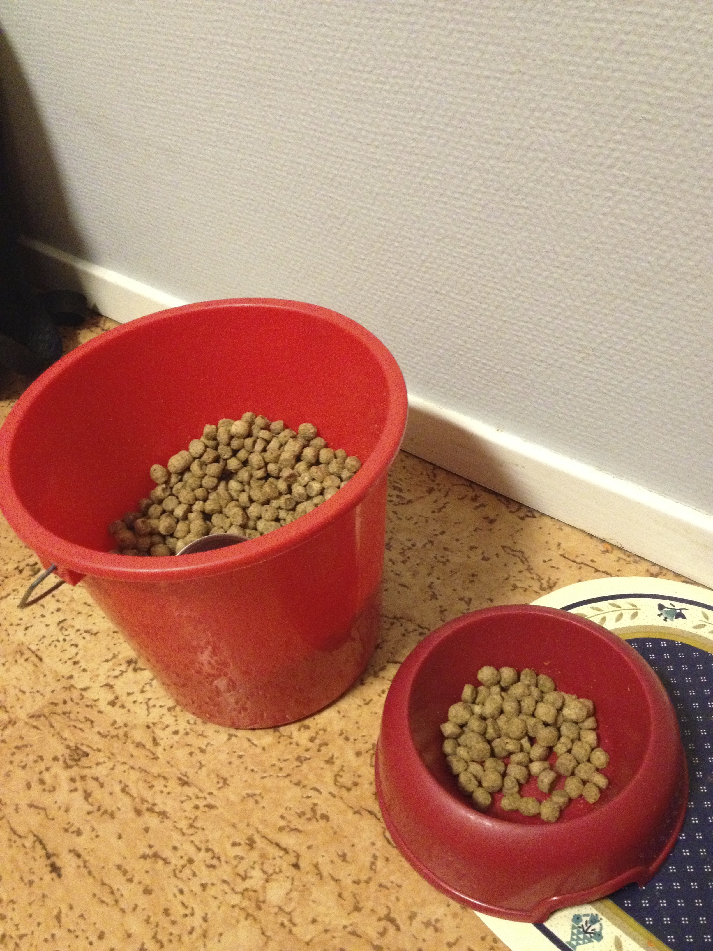 Slutligen var jag bara tvungen att ta en bild på hur det ser ut hemma i köket hos mamma och pappa. De har en westie som inte är sådär jätteförtjust i mat, i alla fall inte när det gäller hennes eget torrfoder. Då kan man förvara maten såhär, vilket onekligen ser väldigt praktiskt ut!