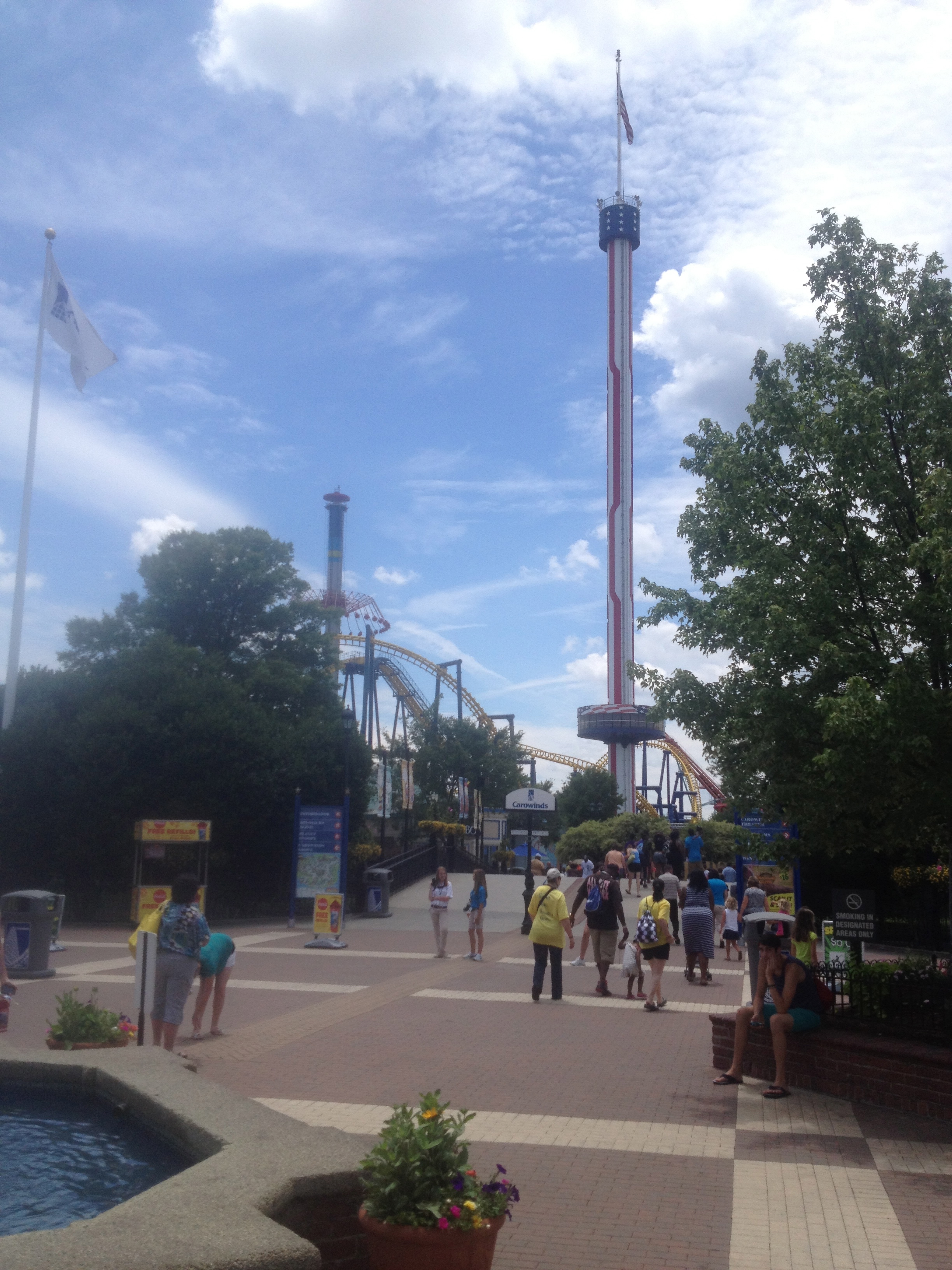 För att sammanfatta det hela var det en rolig dag och Carowinds är helt klart värt ett besök tycker jag. Allra helst om man är lite modigare än jag förstås och faktiskt vågar åka saker… 🙂 Men jag rekommenderar bra skor eftersom man går jättemycket (området är rätt stort) och att man inte åker dit när det är som mest högsäsong. Charlotte är varmt på sommaren och det är jobbigt nog att stå i långa köer. Juni verkar vara en bra månad att åka dit på, eller också hade vi tur den dan vi var där. Man kan köpa familjebiljett på nätet för fyra personer där kostnaden blir 37,50 dollar per person (normalpriset är 54 dollar), men obs att man i så fall måste köpa den senast dan innan man ska dit. Det går inte att boka samma dag, vilket jag inte visste utan det kom som en ”glad” överraskning när jag gick in och skulle boka biljetter på morgonen. Efter lite surfande hittade jag en kupongkod (älskar detta landet och alla deras kuponger!) som gjorde att jag kunde köpa biljetter för 36,99 dollar styck istället. Klart prisvärt tycker jag, det inkluderar inträde plus obegränsat antal åkturer med allt utom spökhuset.
