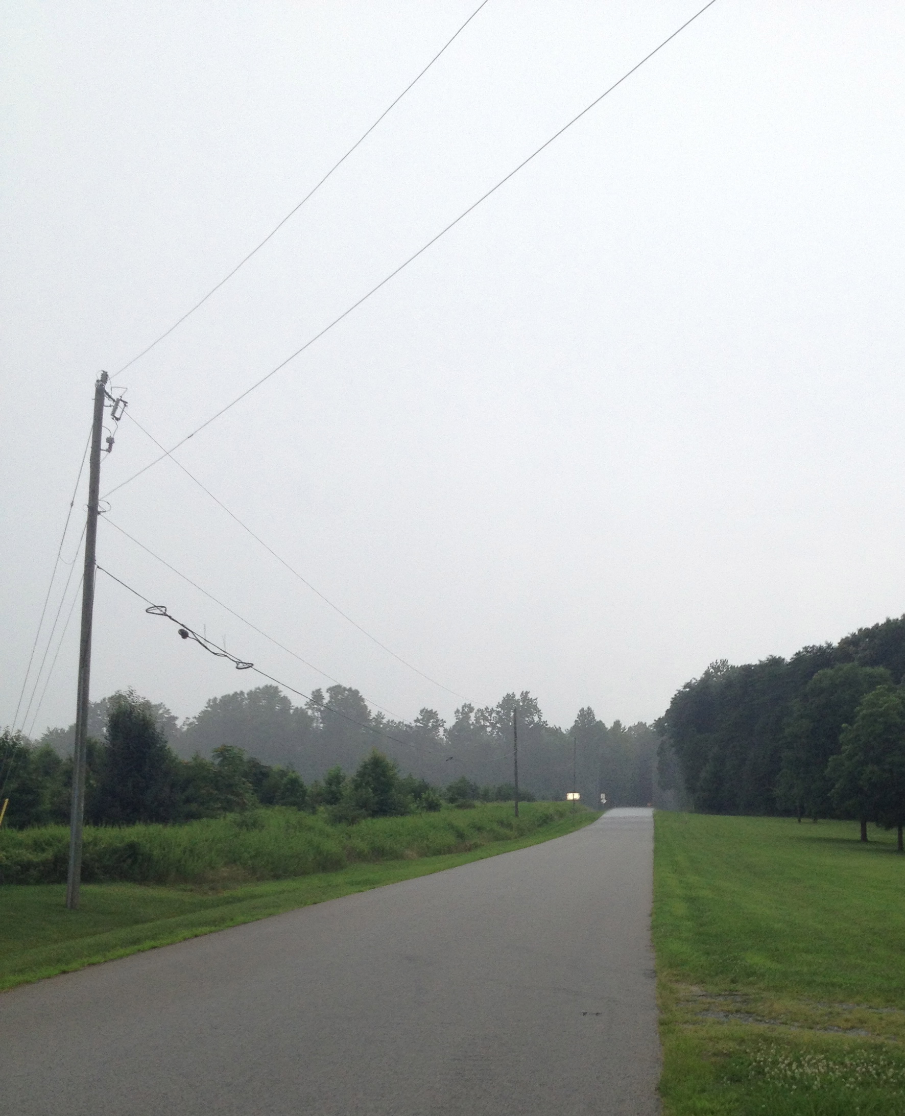 När jag går längs vägen hör jag plötsligt hur det susar i träden, men inser efter ett tag att det inte var vinden utan att det faktiskt var regnet jag hörde. Trots att det inte regnade en droppe där jag var, och att träddungen bara var kanske 10o meter ifrån mig. Samtidigt såg jag en blixt så jag vände om för säkerhets skull och gick hemåt. Då kommer en pickup, och det här är så typiskt för hur människorna är här i Greensboro/Summerfield: han som körde stannade bredvid mig, pekade bakåt och varnade för att regnet var på väg och jag kunde se att hans bil var alldeles dyblöt. Jag sa att jag kunde höra hur det kom, men att jag nästan var hemma. Ok vad bra sa han då, annars kunde jag skjutsat dig sista biten. En vilt främmande människa som jag inte kan komma ihåg att jag nånsin sett förut, men för honom var det självklart att stanna och erbjuda skjuts åt både mig och hundarna!