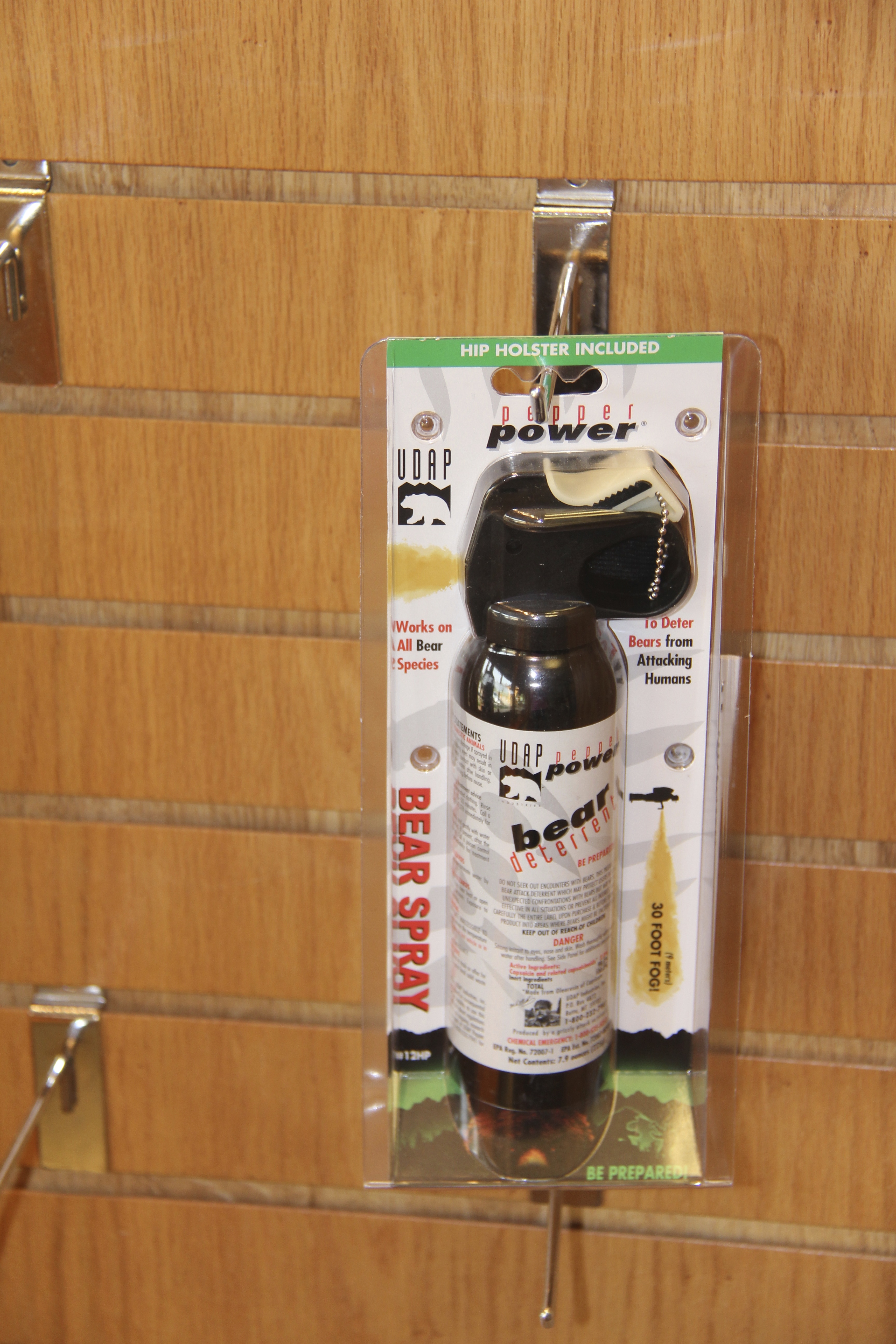 När vi checkade in fick vi stränga förhållningsorder att inte lämna någon mat ute, inte ens i bilen, på grund av björnfaran. När vi kom in i den lilla shopen som fanns bredvid receptionen förstod vi att det verkligen var allvar bakom, där fanns ett stort lager med ”björnspray” som man använder för att skrämma bort björnar när man är ute på hajk: