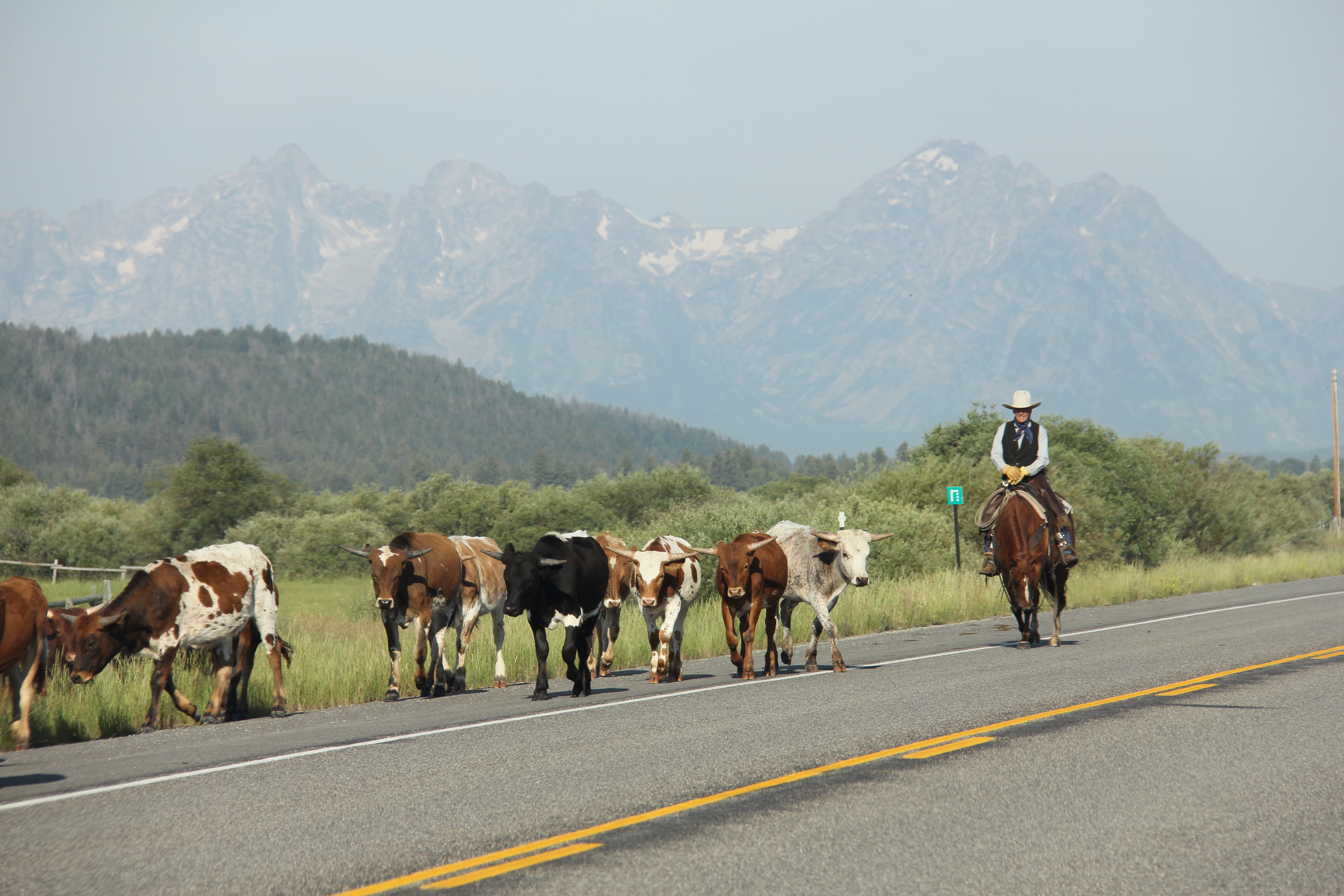 Redan kl 8 morgonen därpå hade vi fått i oss frukost och satt i bilen. På vägen ut från Jackson Hole fick vi bevis på att vi faktiskt var i Vilda Västern nu, cowboysarna var uppe tidigt de också och flyttade kossorna till nya hagen:
