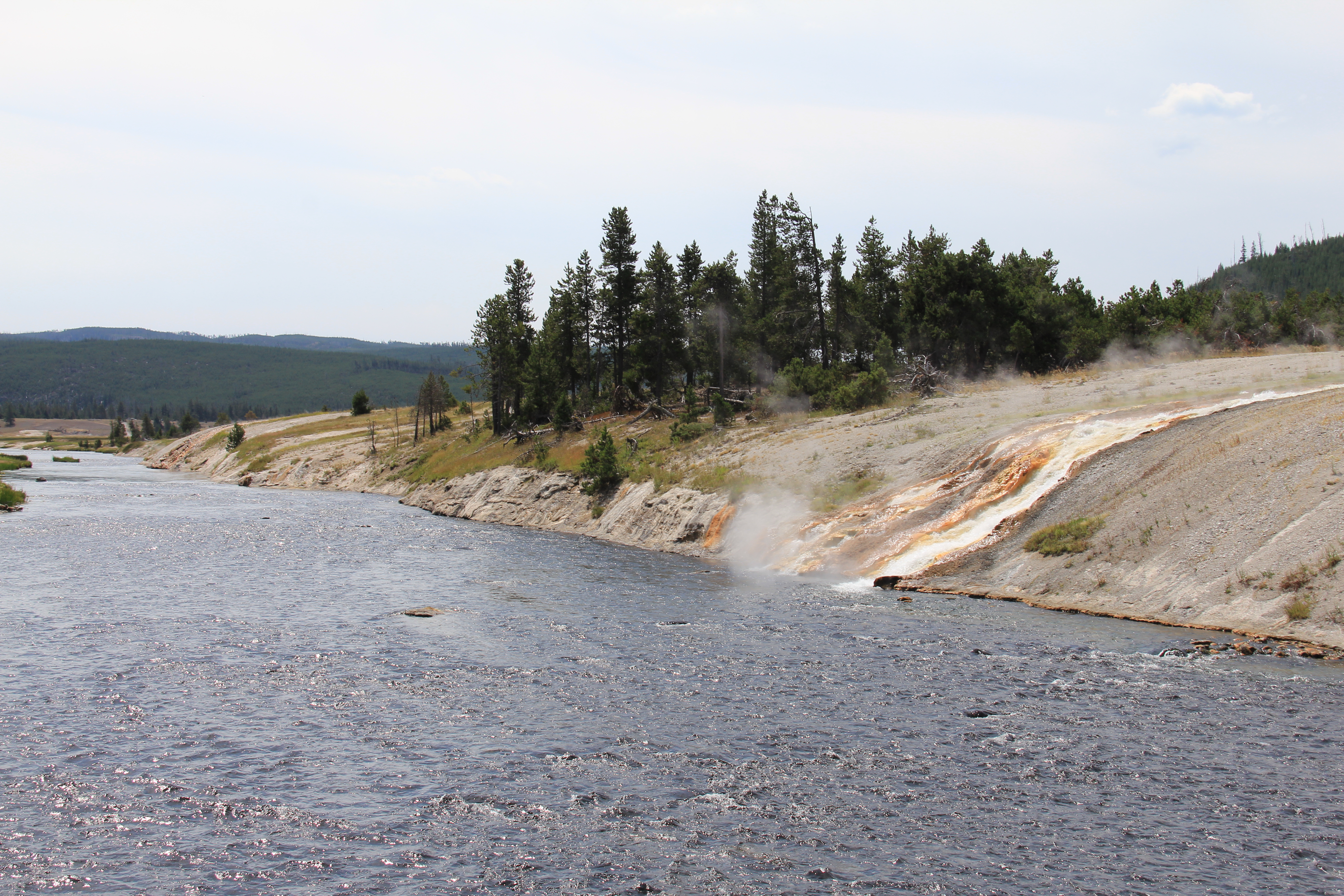 Redan innan man kommer fram till källan ser man det varma vattnet som rinner ner i floden som ligger strax intill: