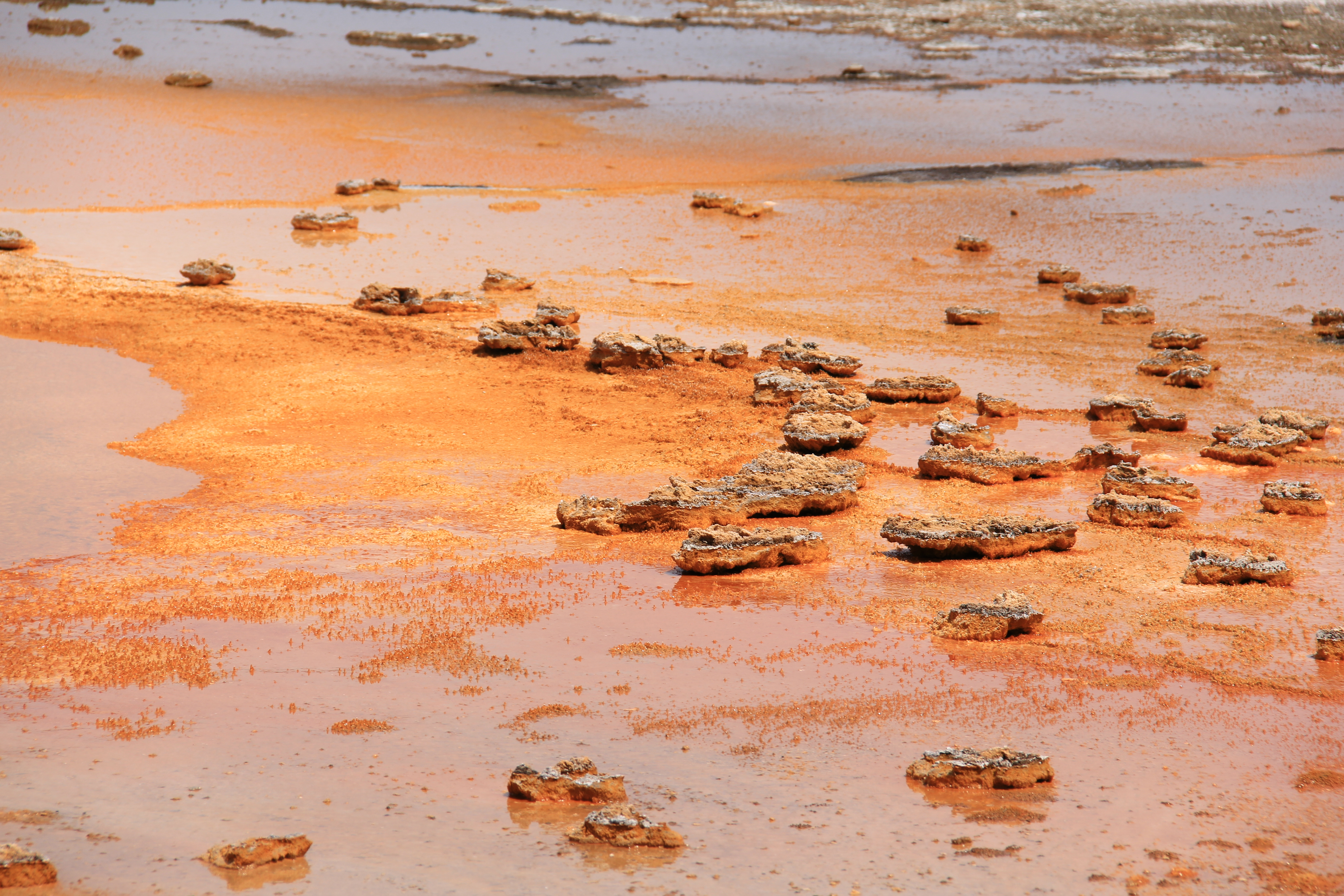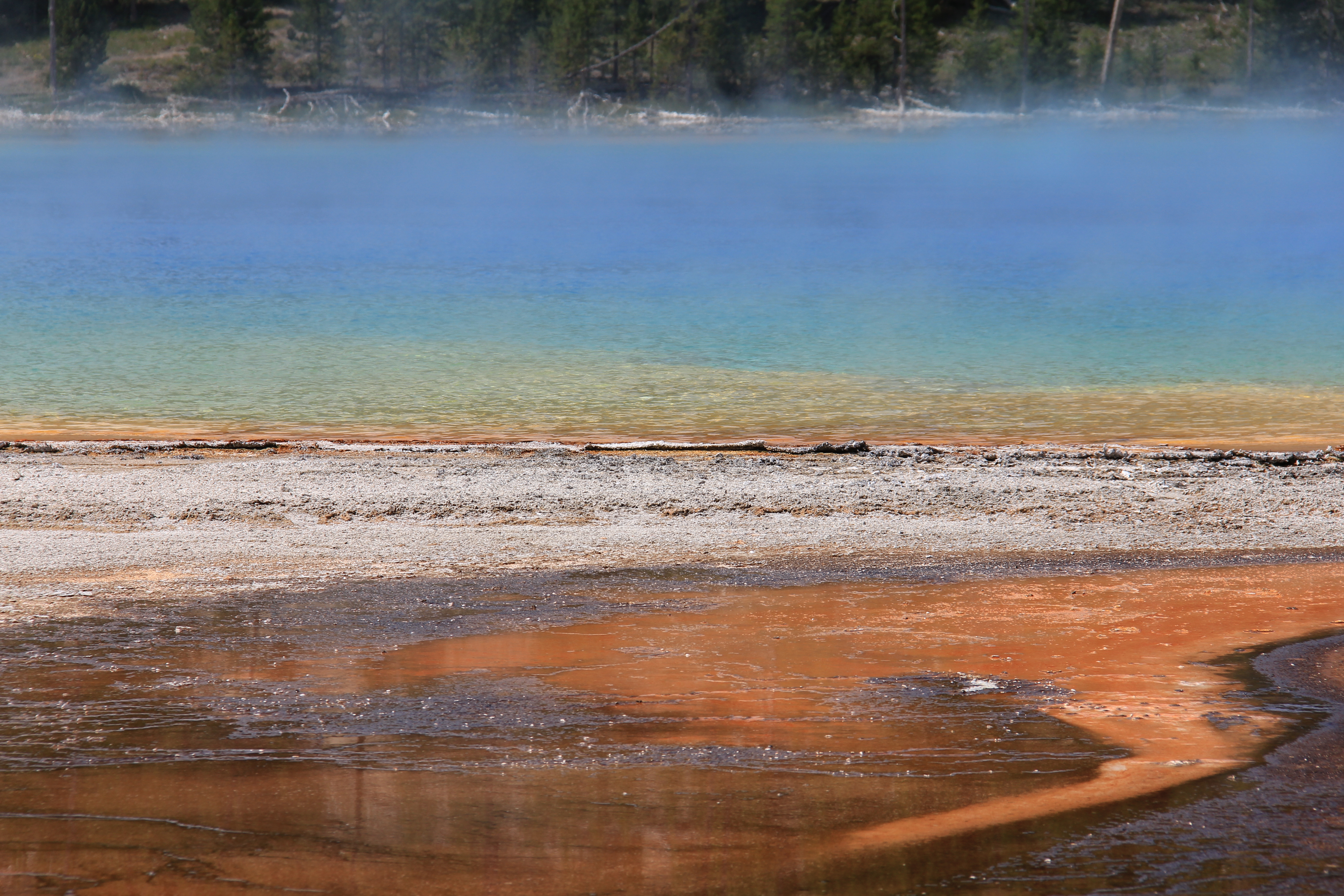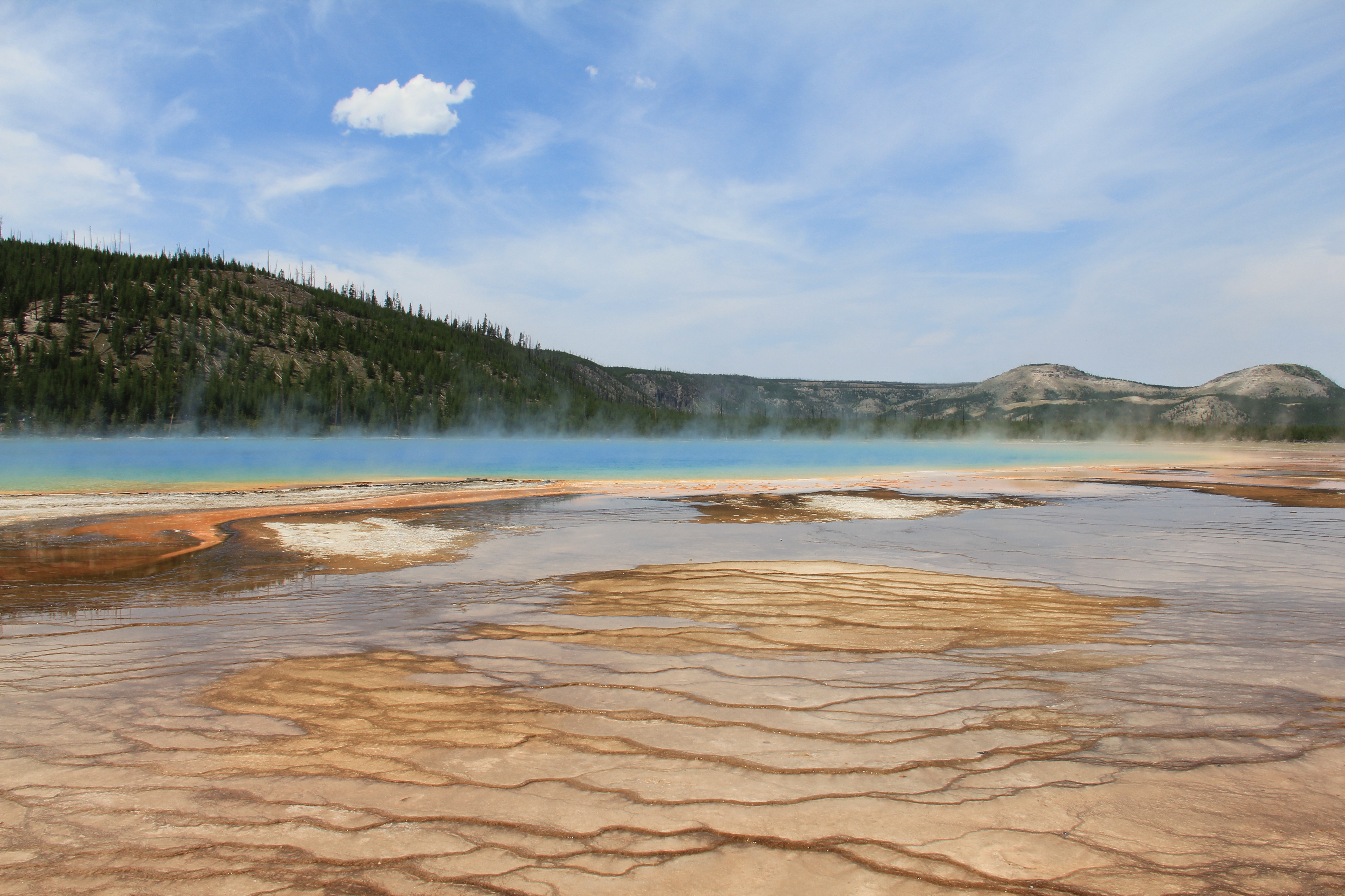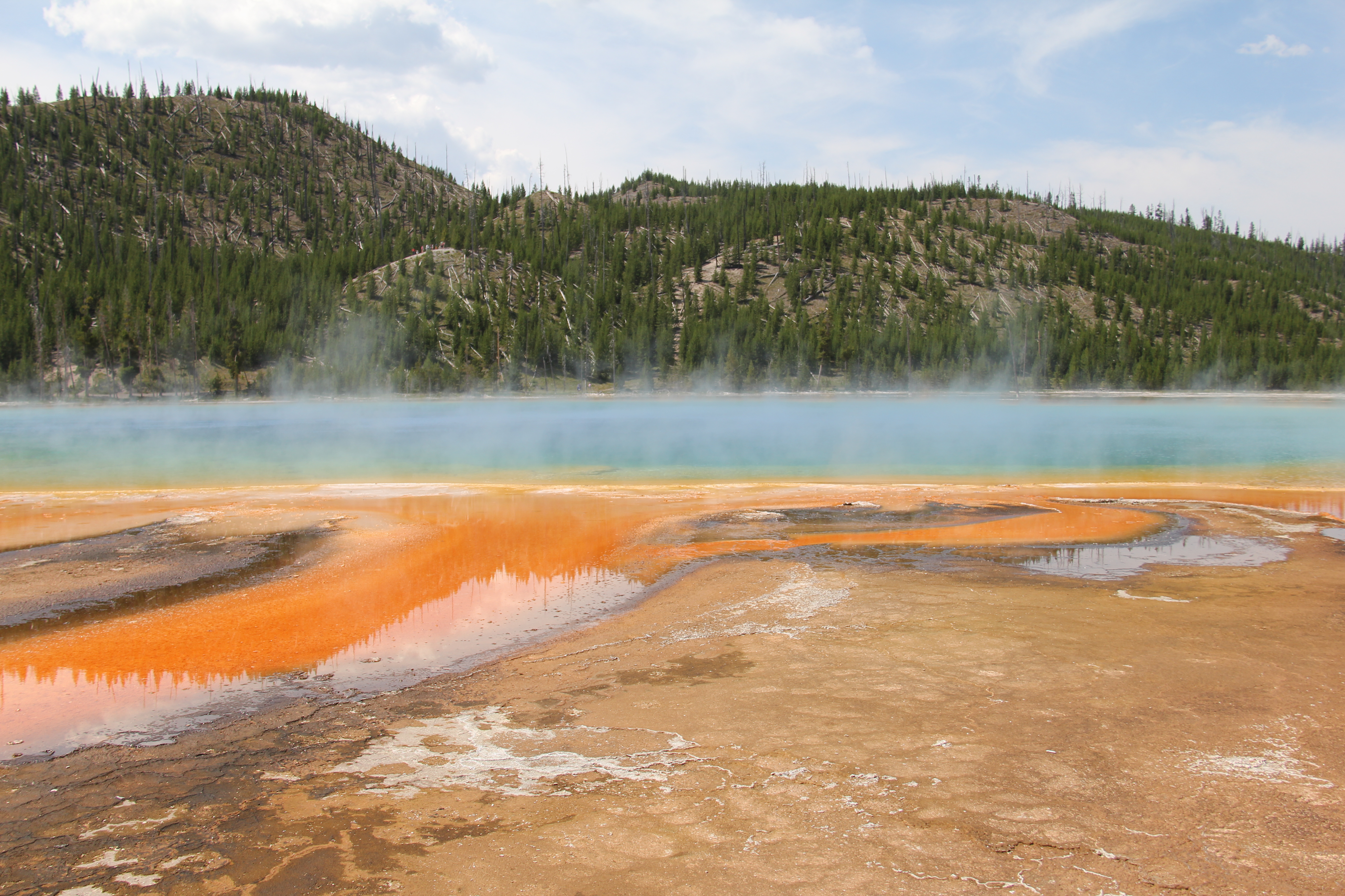 Inte så långt från Old Faithful ligger Grand Prismatic Spring. Helt fantastiskt, ett måste om man kommer till Yellowstone! Det går att parkera bilen alldeles intill om man vill, eller också parkerar man vid Fairy Falls och går ett par miles. Prismatic Spring är alltså en varm källa, vattnet är c:a 70°C så man får akta sig för att doppa tårna i vattnet. I mitten av källan är vattnet knallblått av solens strålar som bryts mot vattenytan, men runt kanterna har mikroorganismer i det varma vattnet färgat det gult, orange och brunt. Otroligt vackert och märkligt att se. Enligt informationsskylten som finns där tror man att om man hittar liv på andra planeter är det troligtvis liknande mikroorganismer man i så fall kommer att hitta, eftersom miljön är så ogästvänlig att inget annat liv är möjligt.