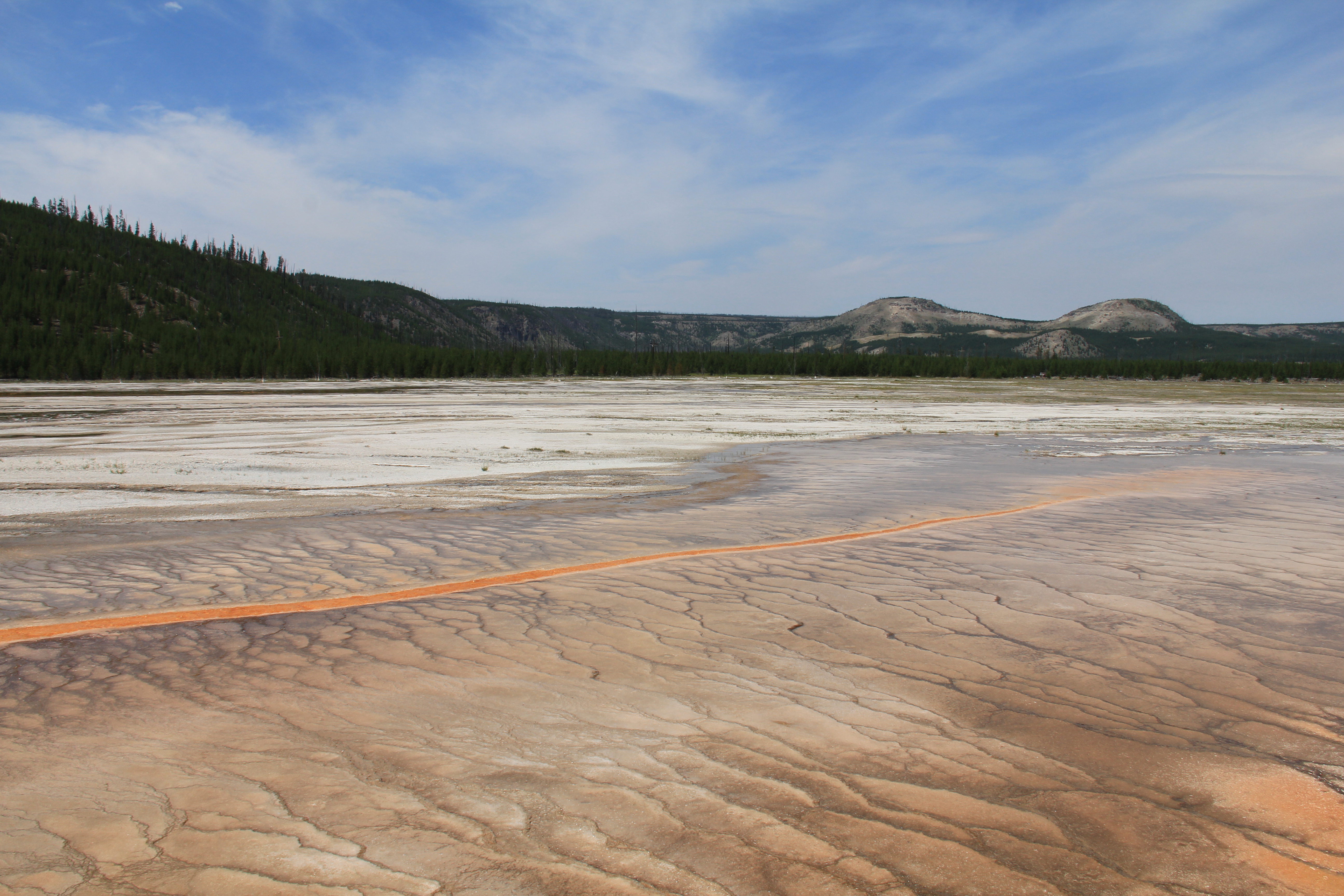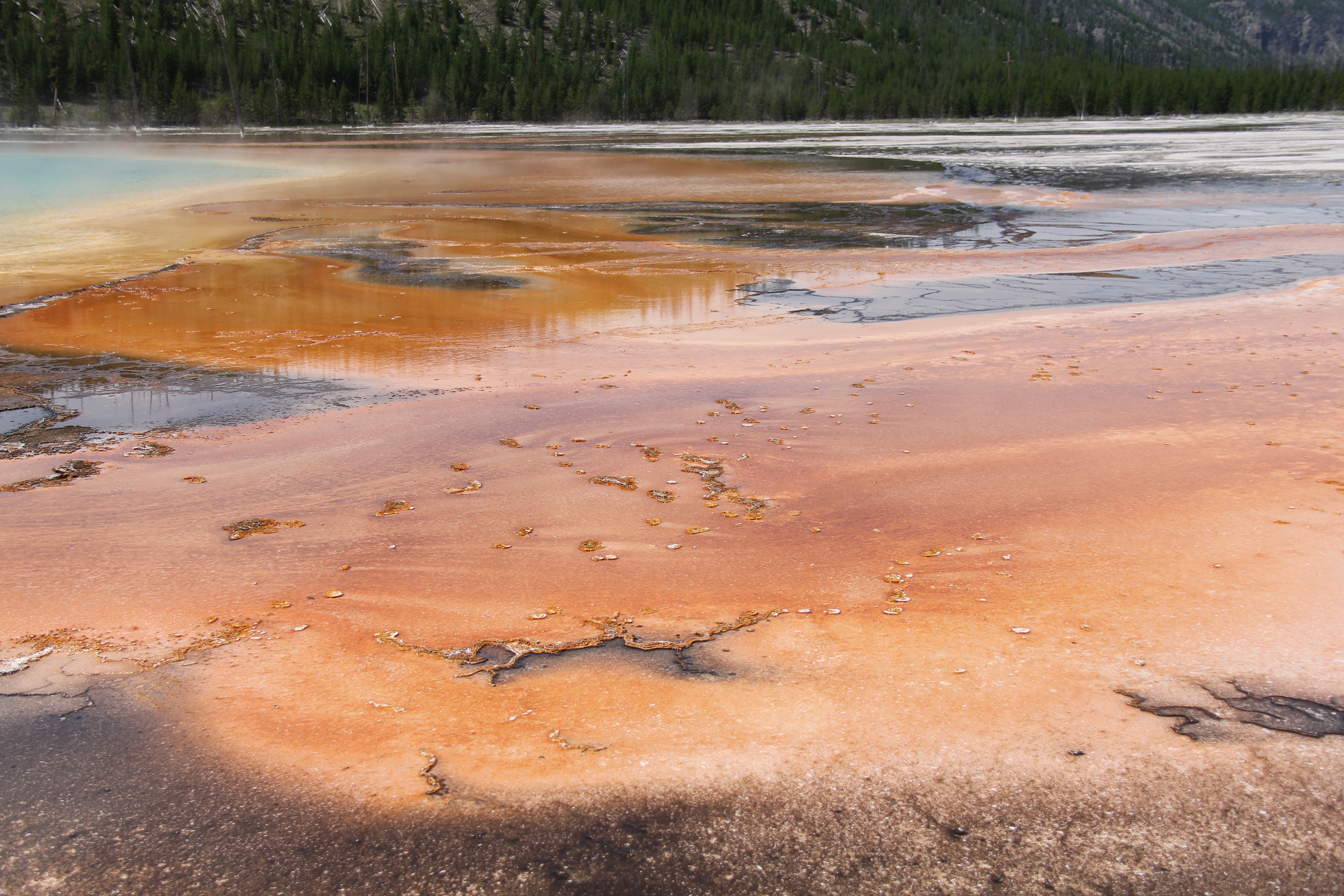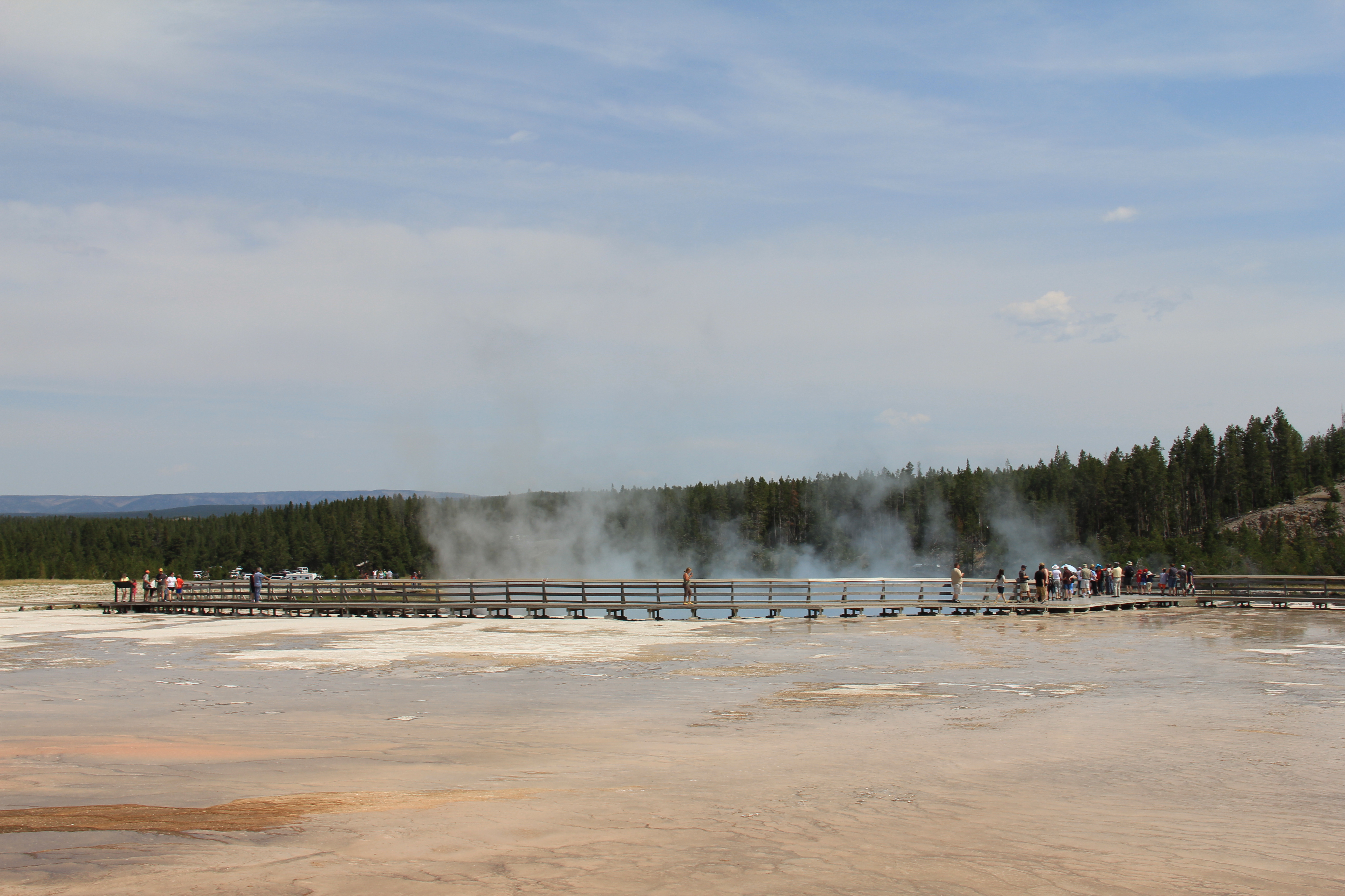 Sedan kommer man till Grand Prismatic Spring. Glöm inte kameran! 🙂 Dock är det inte så lätt att ta vettiga kort, man är i precis samma höjd som vattnet och väldigt nära, och källan är såpass stor att man inte kan få med hela om man inte möjligtvis har rejäl vidvinkel. Ett litet utsiktstorn hade inte varit fel, så att man kom upp några meter. Jag gjorde mitt bästa i alla fall, håll till godo: