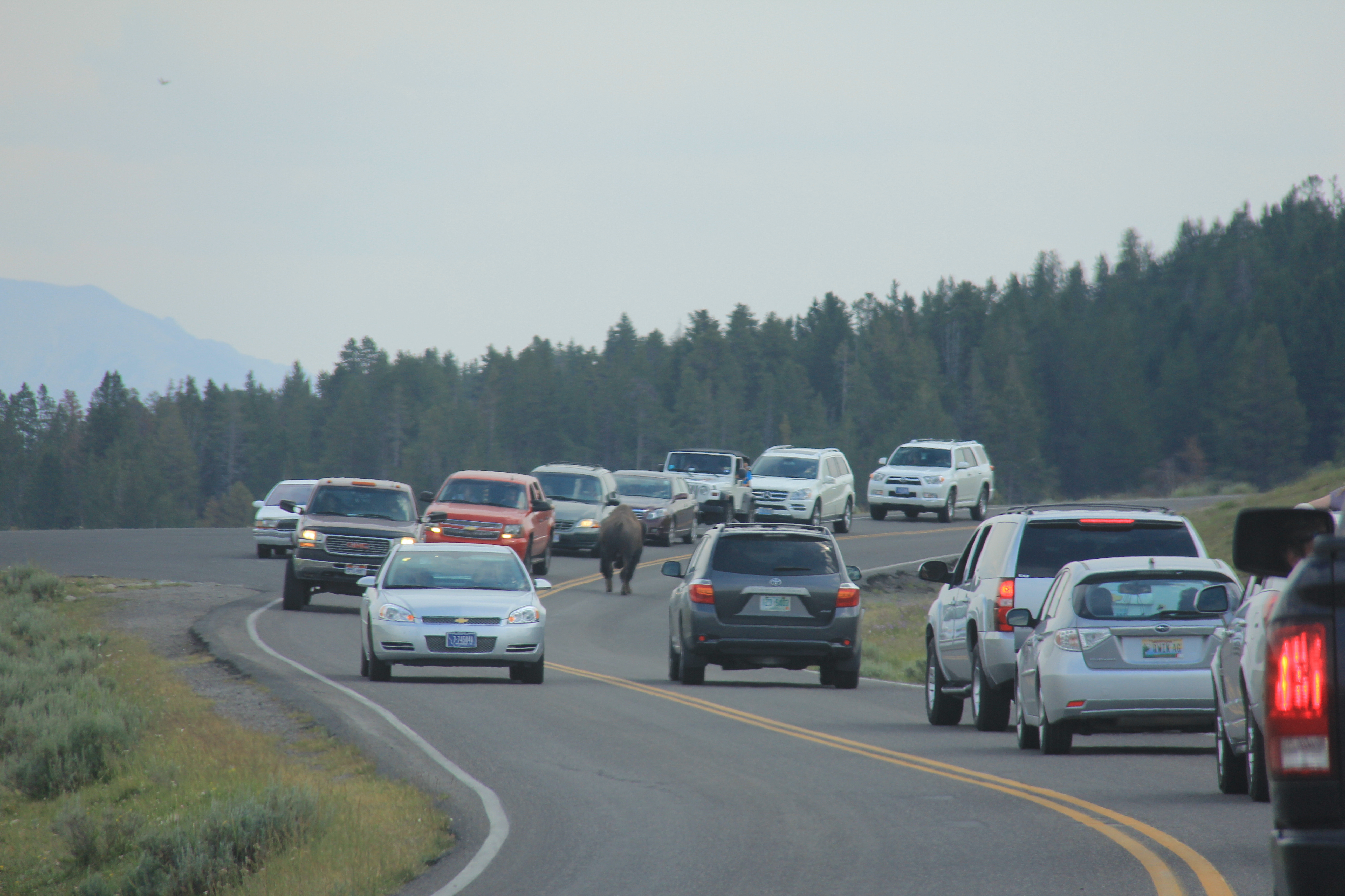 Så häftigt att få se en buffalo, alldeles livs levande och i vilt tillstånd dessutom! Och så nära! Däremot fick vi reda på av en kvinna som stod bredvid att det inte var buffalos, utan bisonoxar. De ser ungefär likadana ut, men bisonoxar är större än buffalos. Så nu vet vi det! Vi var jätteglada att ha fått se dem (det var tre stycken sammanlagt), och efter att ha tagit ett antal kort på dem satte vi oss i bilen och körde vidare. Efter en liten bit hamnade vi plötsligt i en bilkö, i förstod inte varför först men sen såg vi vad det var, eller vem det var, som stoppade upp trafiken: