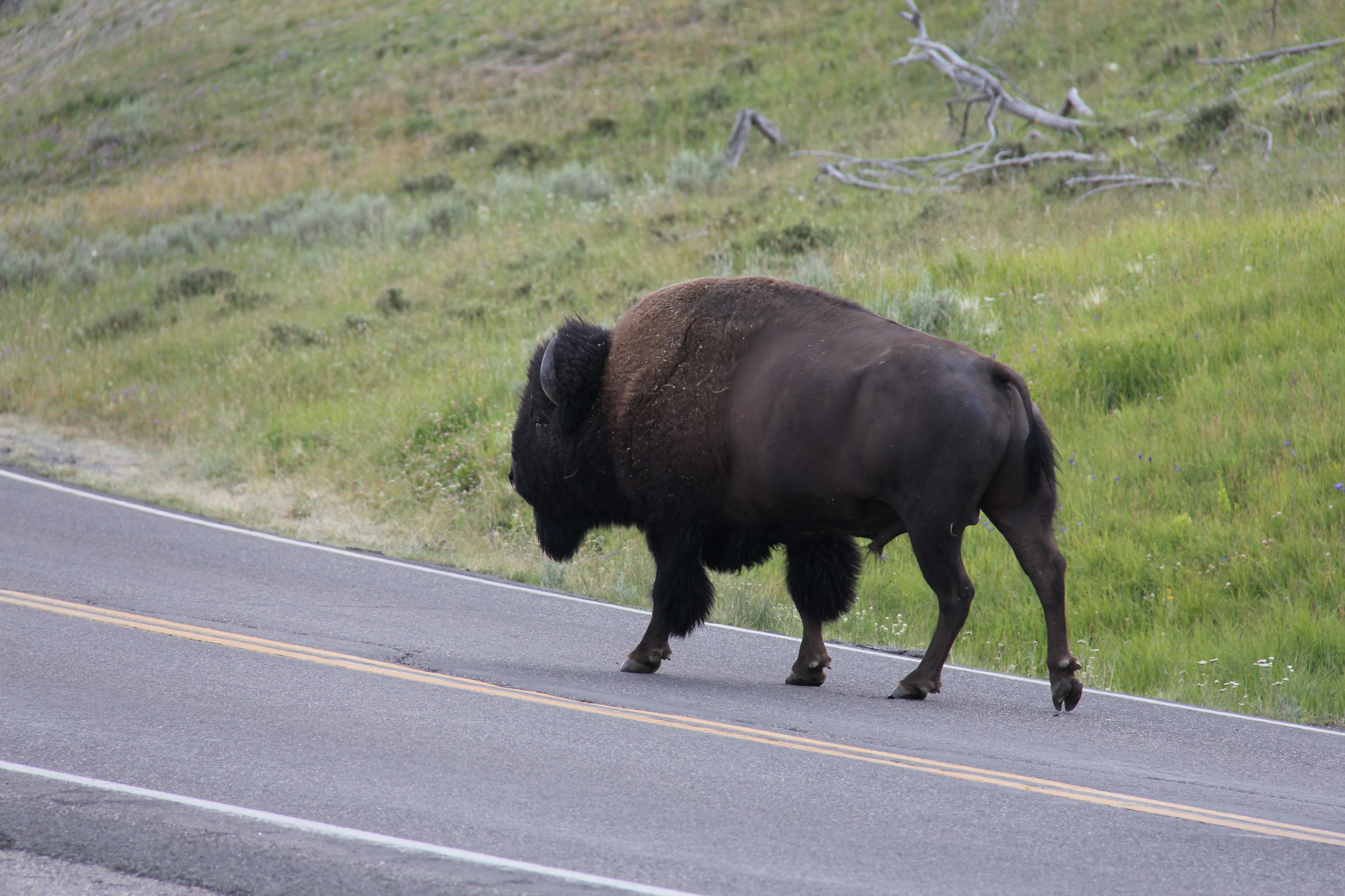 Han hade inte bråttom direkt, utan gick i godan ro mitt i vägen. Vi stannade till, förstås, och jag vågade mig försiktigt ut ur bilen för att ta ett par kort när jag såg att en buss hade stannat och massor av folk stod bara några meter från oxen och fotograferade. Han brummade hela tiden, och någon sa att det var brunsttjut eftersom han var på väg till honorna som fanns längre bortåt vägen. Jag litade väl inte helt och hållet på att han var att lita på i det läget, så jag höll avståndet men vissa gick nästan ända fram till honom för att ta ett bra kort. Amerikaner! 🙄 🙂 Det är trots allt vilda djur det handlar om… Björn kom i alla fall med rådet att om man blir jagad av en bisonoxe ska man springa i nedförsbacke eftersom de inte klarar att följa efter då, framtunga som det är. Bra att veta! 🙂