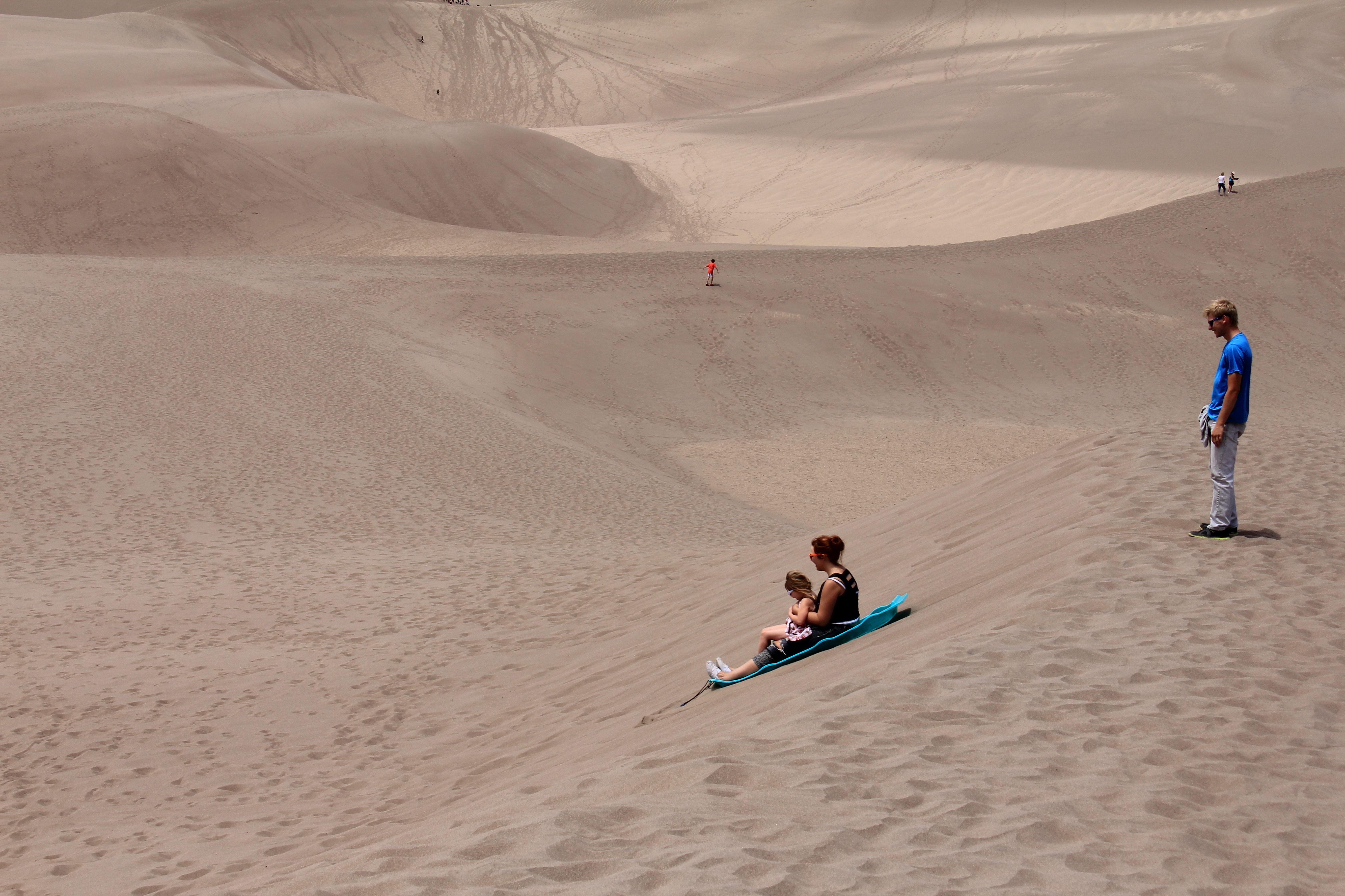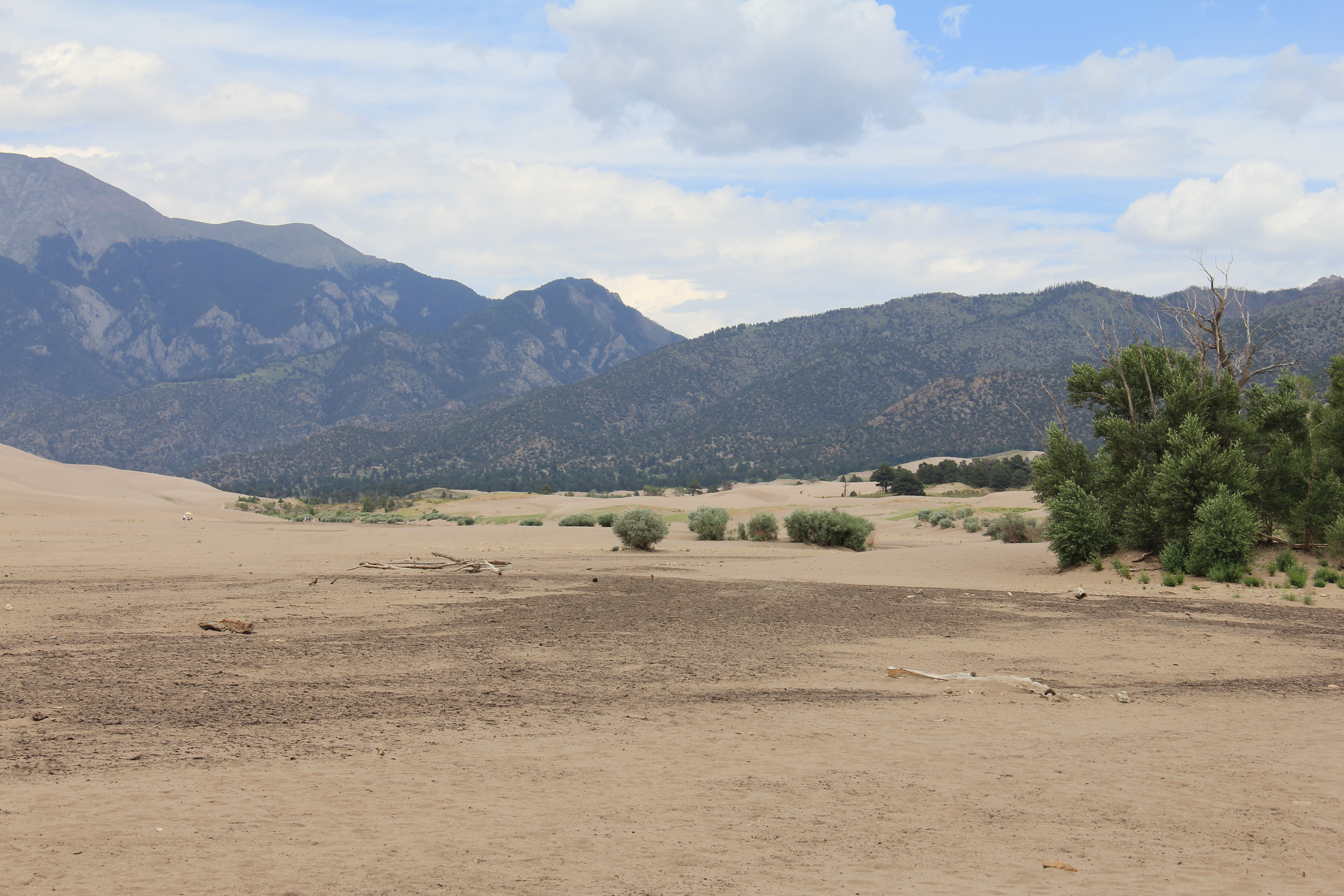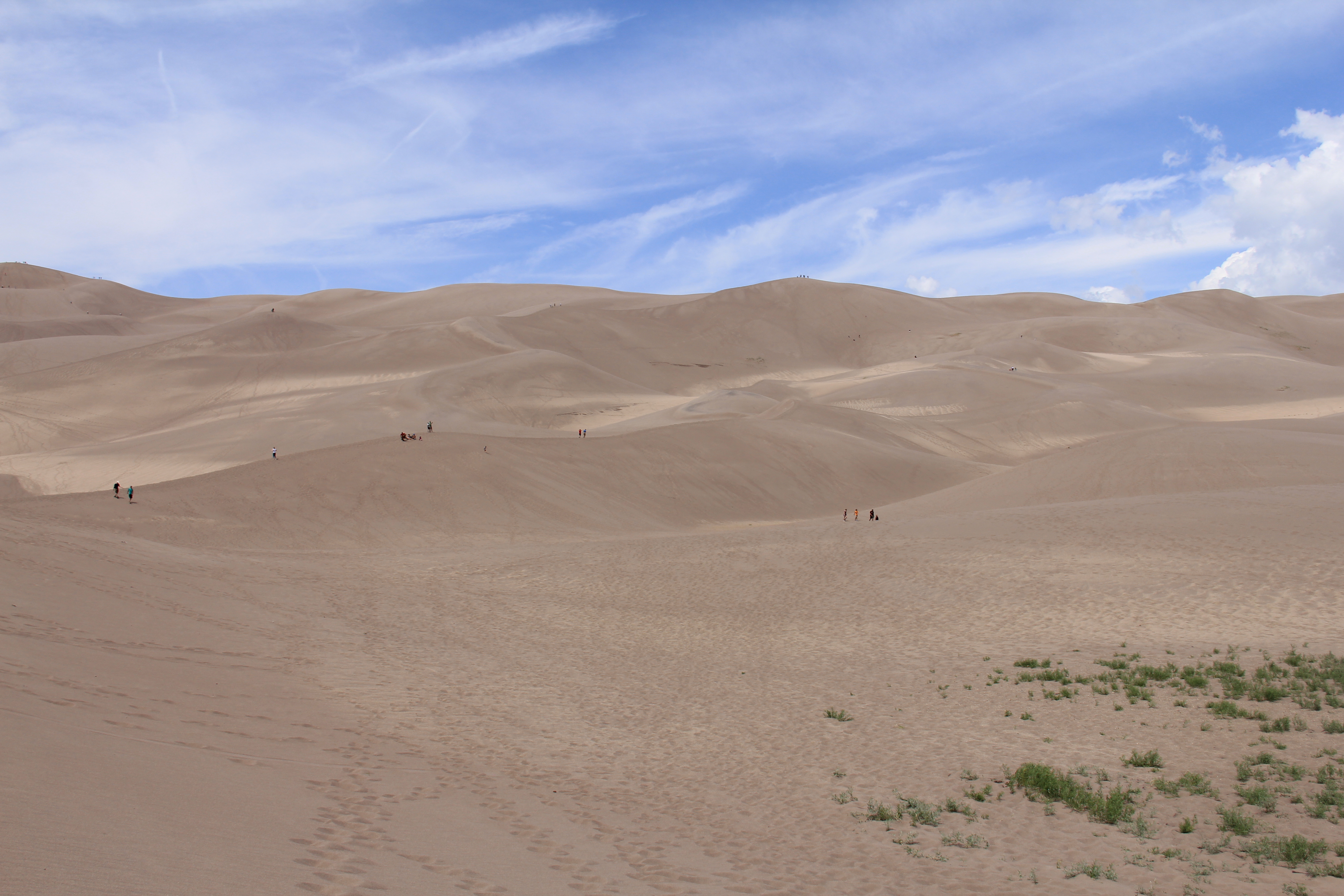 Innan vi åkte hade vi köpt några Lonely Planet-böcker för att få lite tips. När vi satt och bläddrade i Colorado-boken upptäckte vi nånting som hette Great Sand Dunes och som låg längs vår resrutt, det var bara en liten avstickare på nån kilometer. Great Sand Dunes är som en öken, fast en väldigt liten en, som verkar bara ha råkat hamna mitt ute i det vanliga landskapet. Det måste vi ju se förstås!