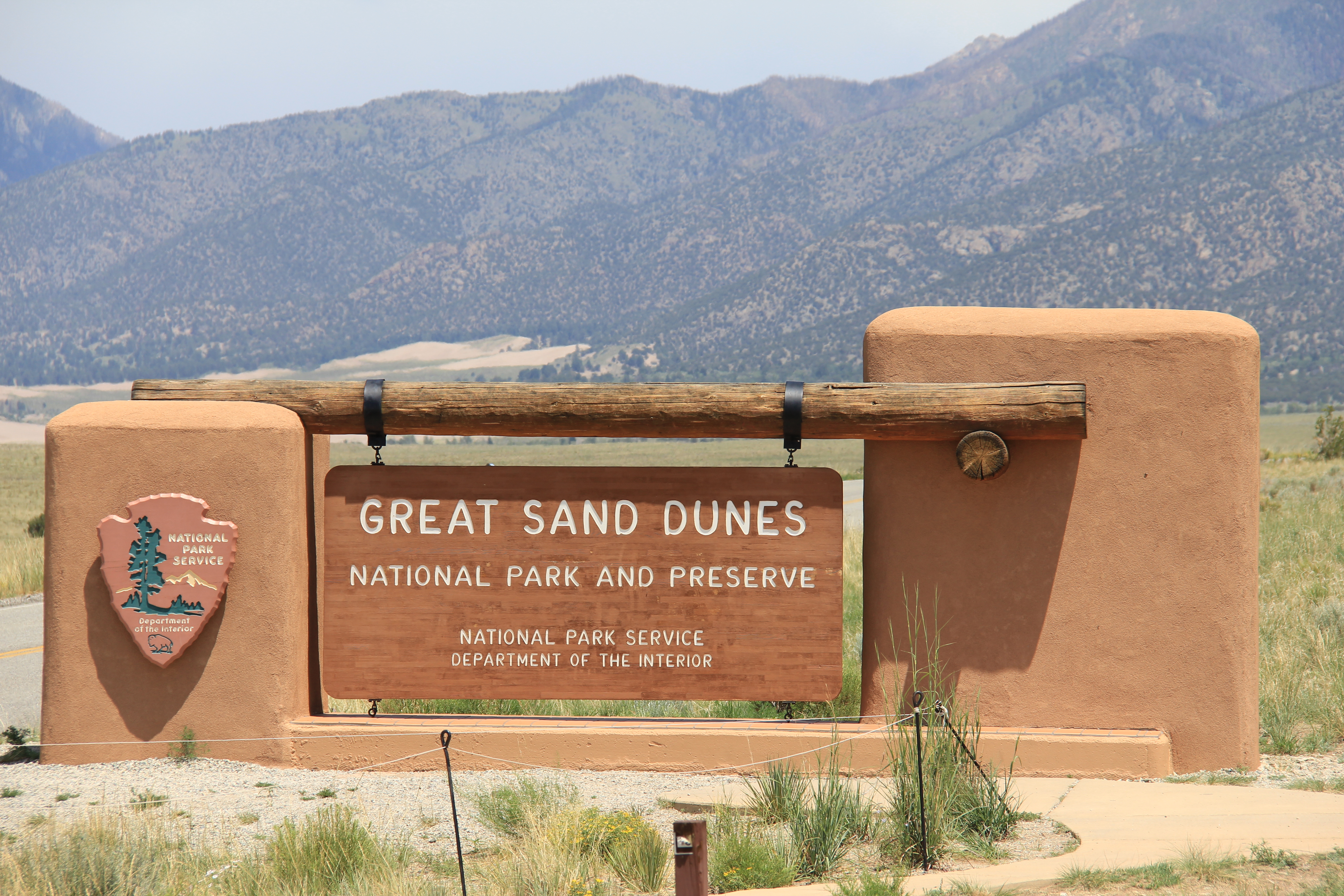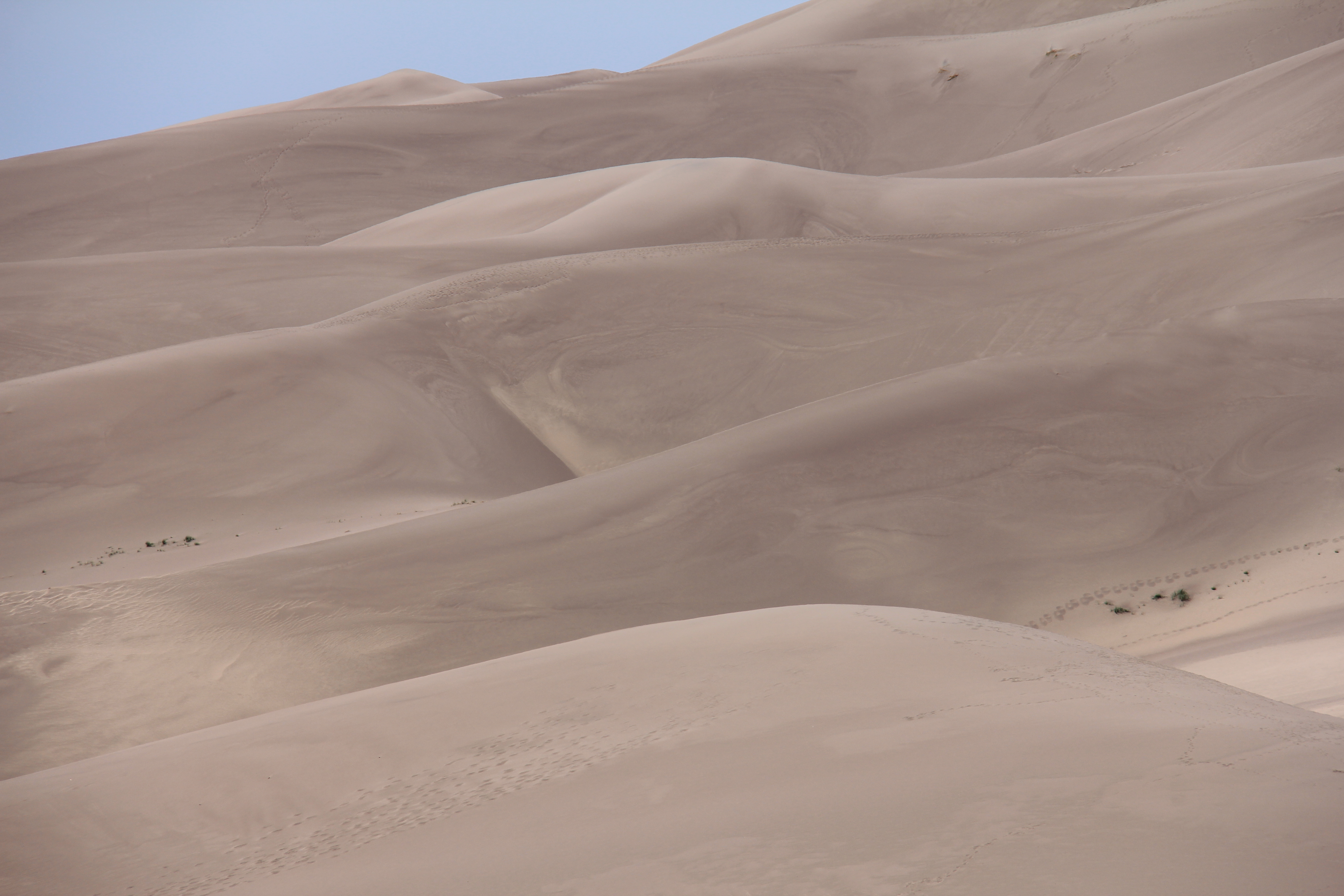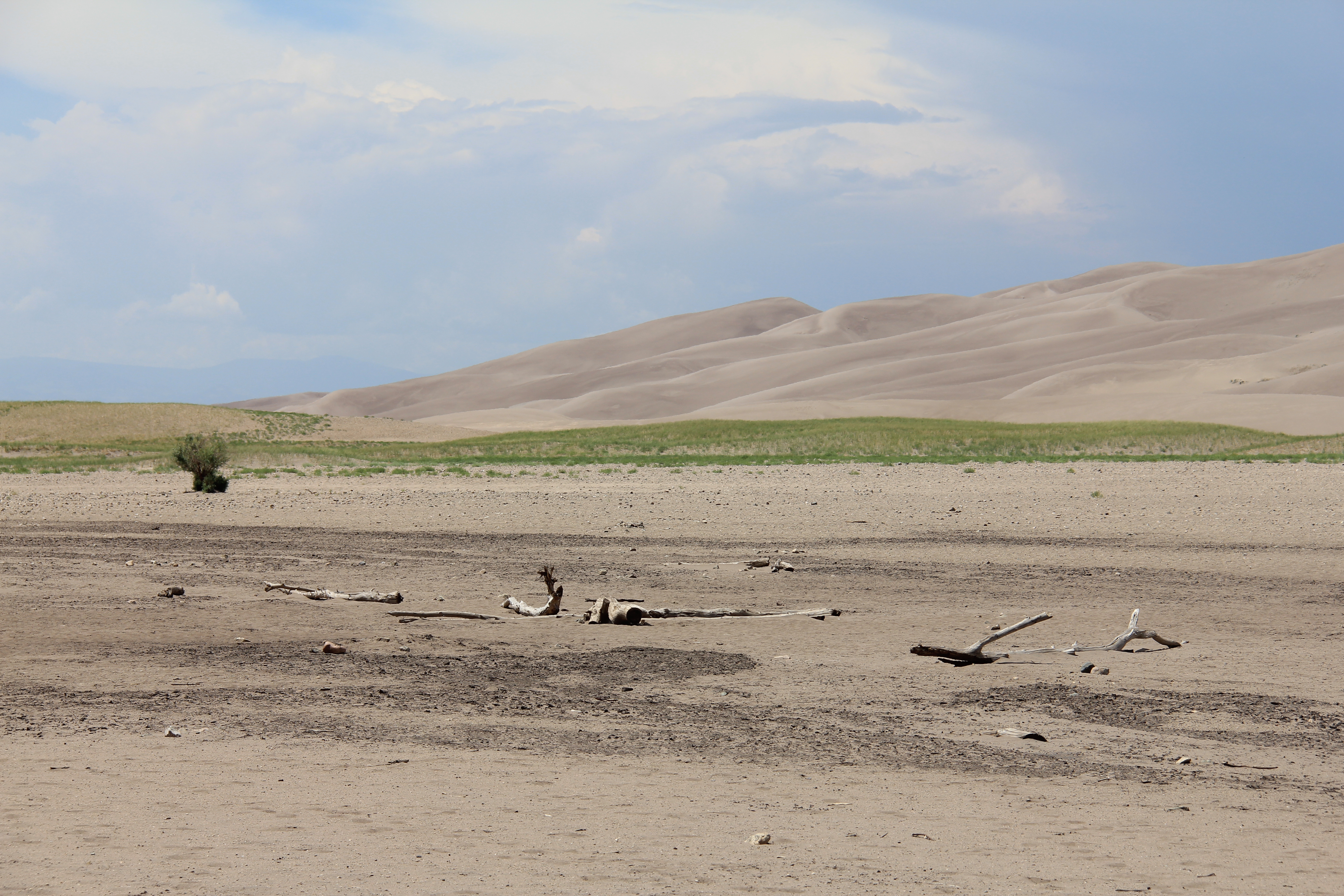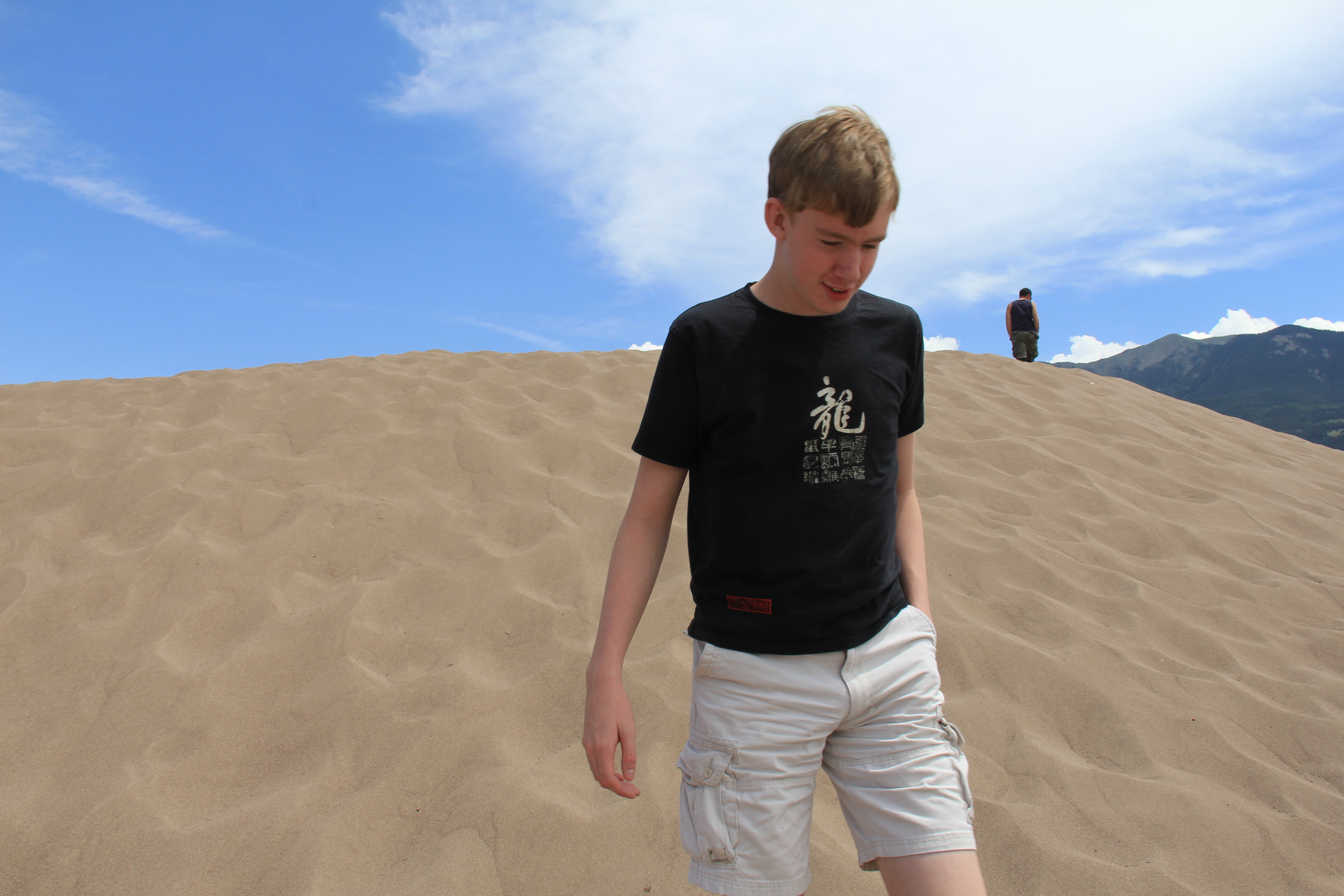 Innan vi åkte hade vi köpt några Lonely Planet-böcker för att få lite tips. När vi satt och bläddrade i Colorado-boken upptäckte vi nånting som hette Great Sand Dunes och som låg längs vår resrutt, det var bara en liten avstickare på nån kilometer. Great Sand Dunes är som en öken, fast en väldigt liten en, som verkar bara ha råkat hamna mitt ute i det vanliga landskapet. Det måste vi ju se förstås!