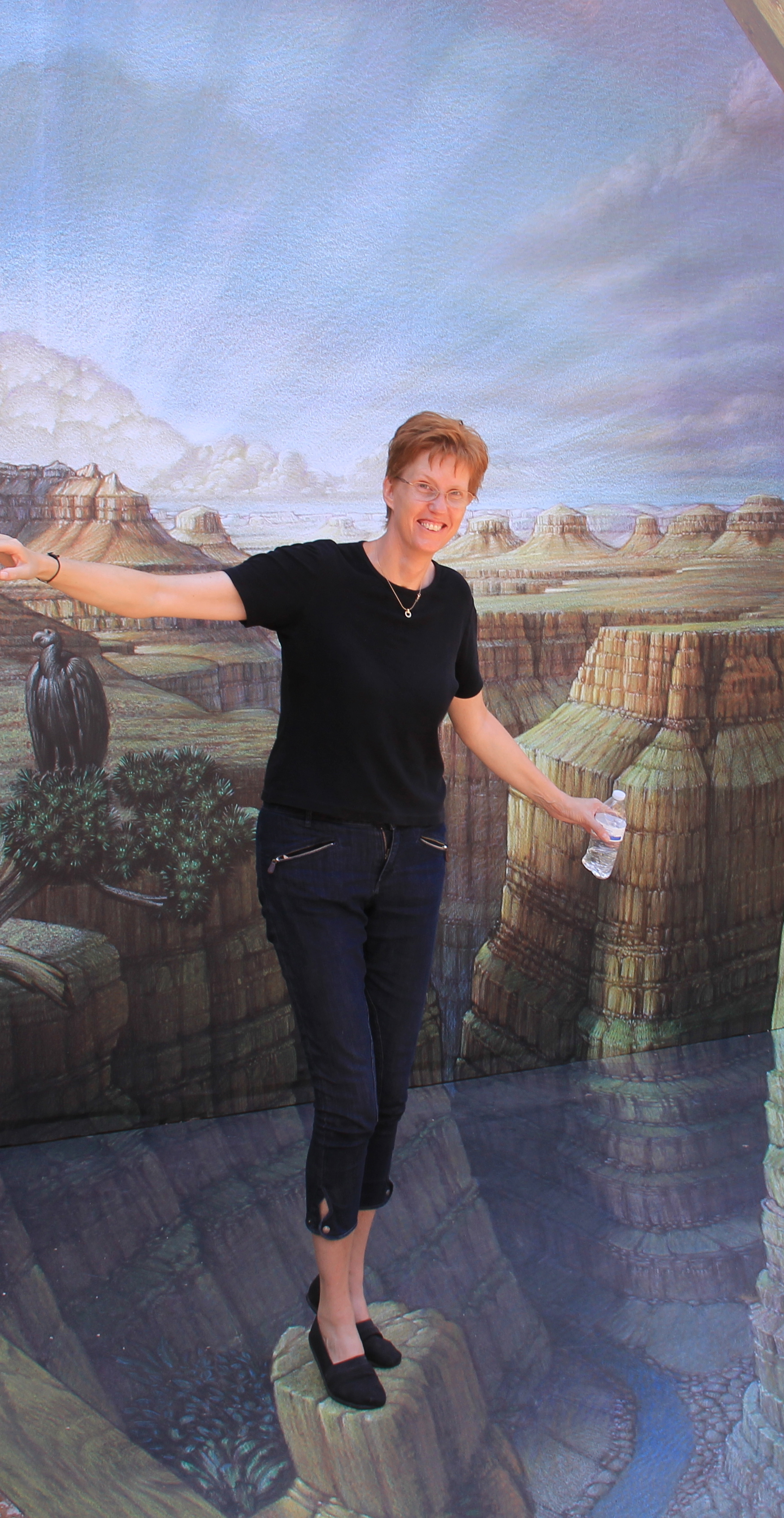 Efter att ha lämnat canyonen åkte vi till National Geographics center, där de har en utställning om Grand Canyon och även en biovisning om Grand Canyons historia. Mycket sevärd, se den om ni kommer dit! Där fanns även såna där tredimensionella målningar som man sett bilder av på bland annat facebook, där man knappt ser att det är en målning på gatan utan det ser ut som om det är t.ex ett vattenfall mitt på en trottoar. Här var det ju Grand Canyon som var avbildat förstås, och det var markerat med ett kryss i marken var man skulle stå och ta kort för att det skulle se verkligt ut. Jag vet inte om vi fick till det helt och hållet men på ett ungefär blir det såhär i alla fall: