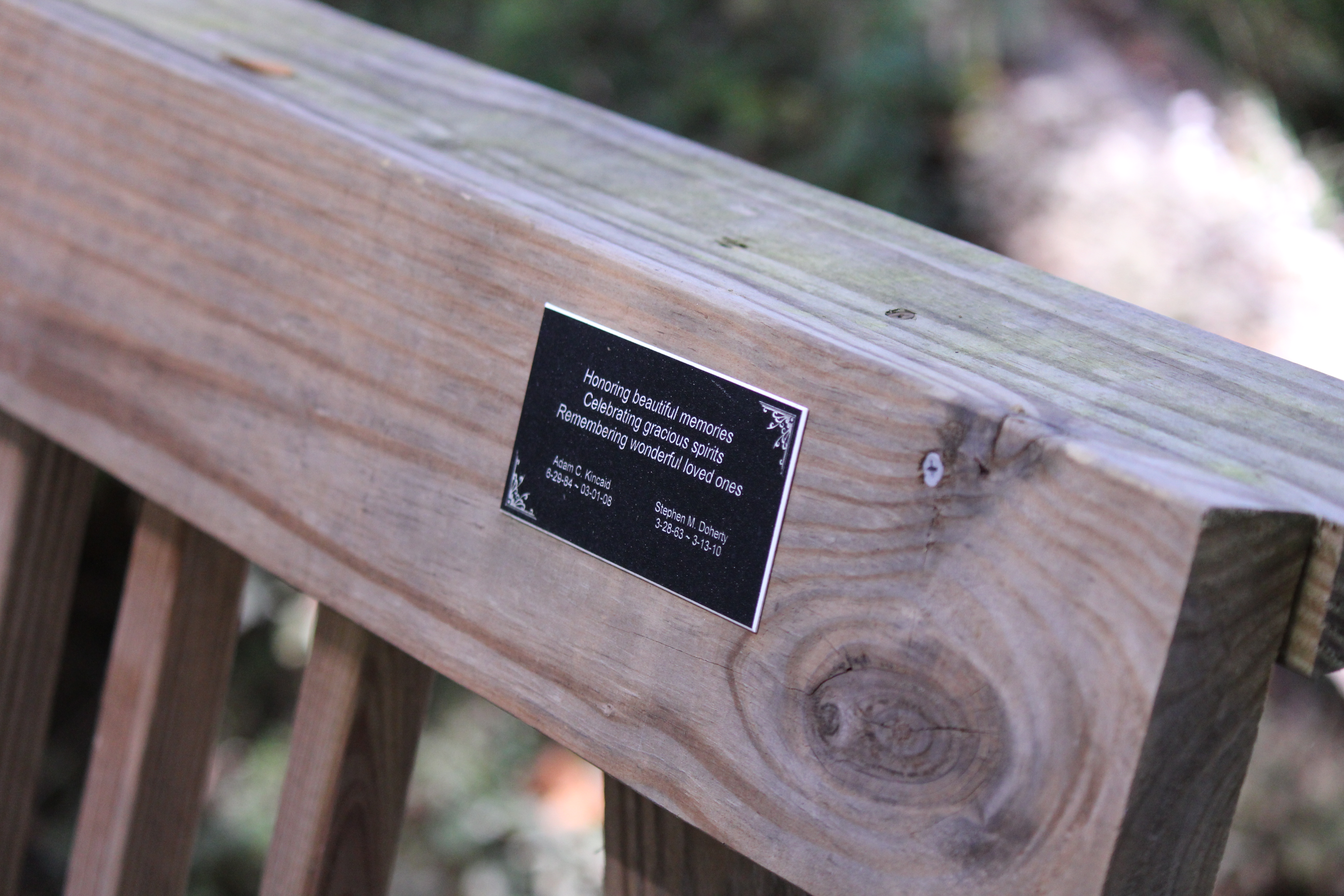 Här händer nästan inget om inte folk donerar pengar till det. Går man ut och går längs en trail och det står en parkbänk där så kan man ge sig på att där finns en liten skylt som talar om vem som skänkt den. Eller – som här – om man byggt en liten bro över en bäck (min favorit för övrigt, så vacker inskription):