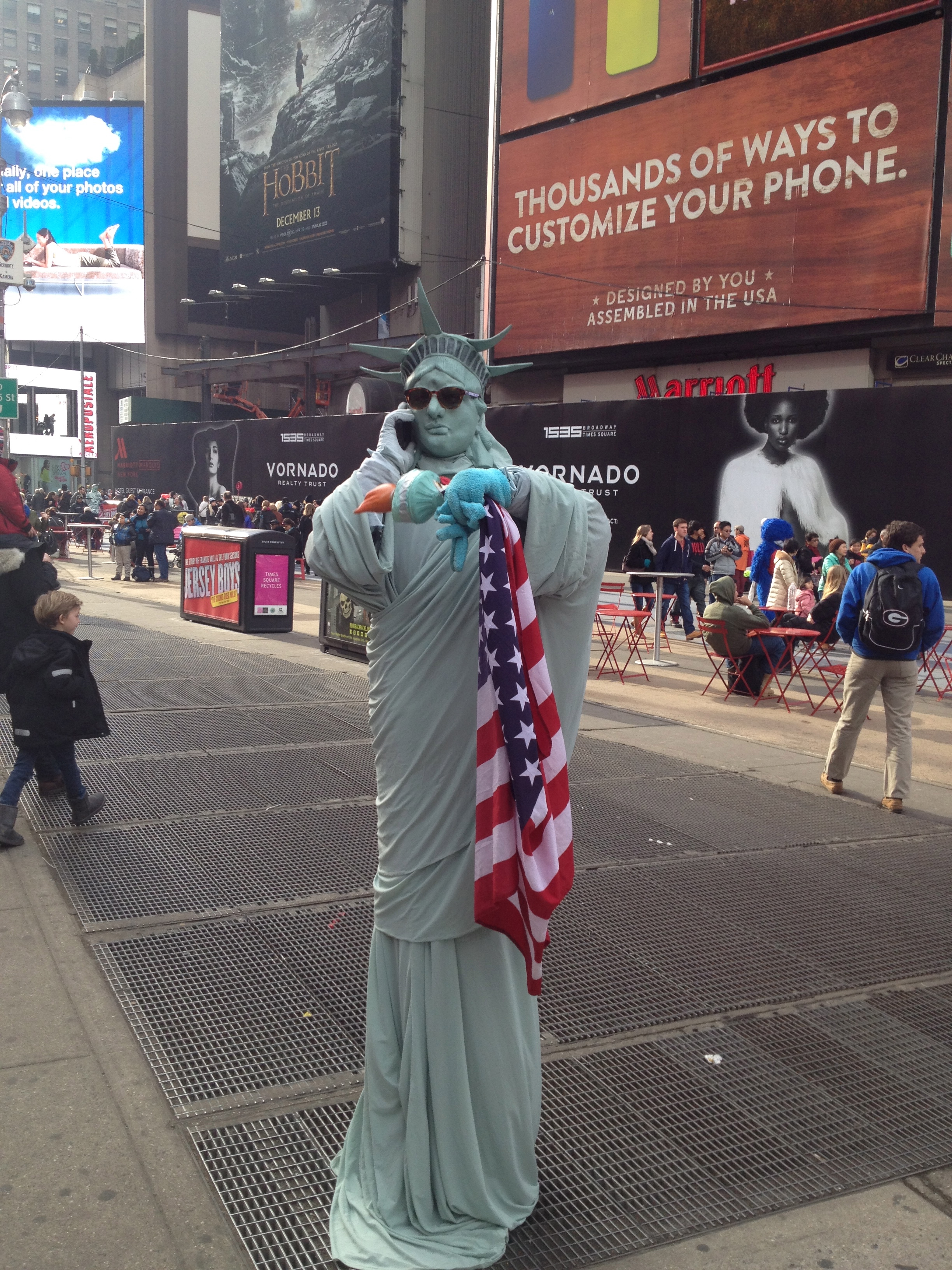 Samt frihetsgudinnan, ivrigt pratandes i telefon…