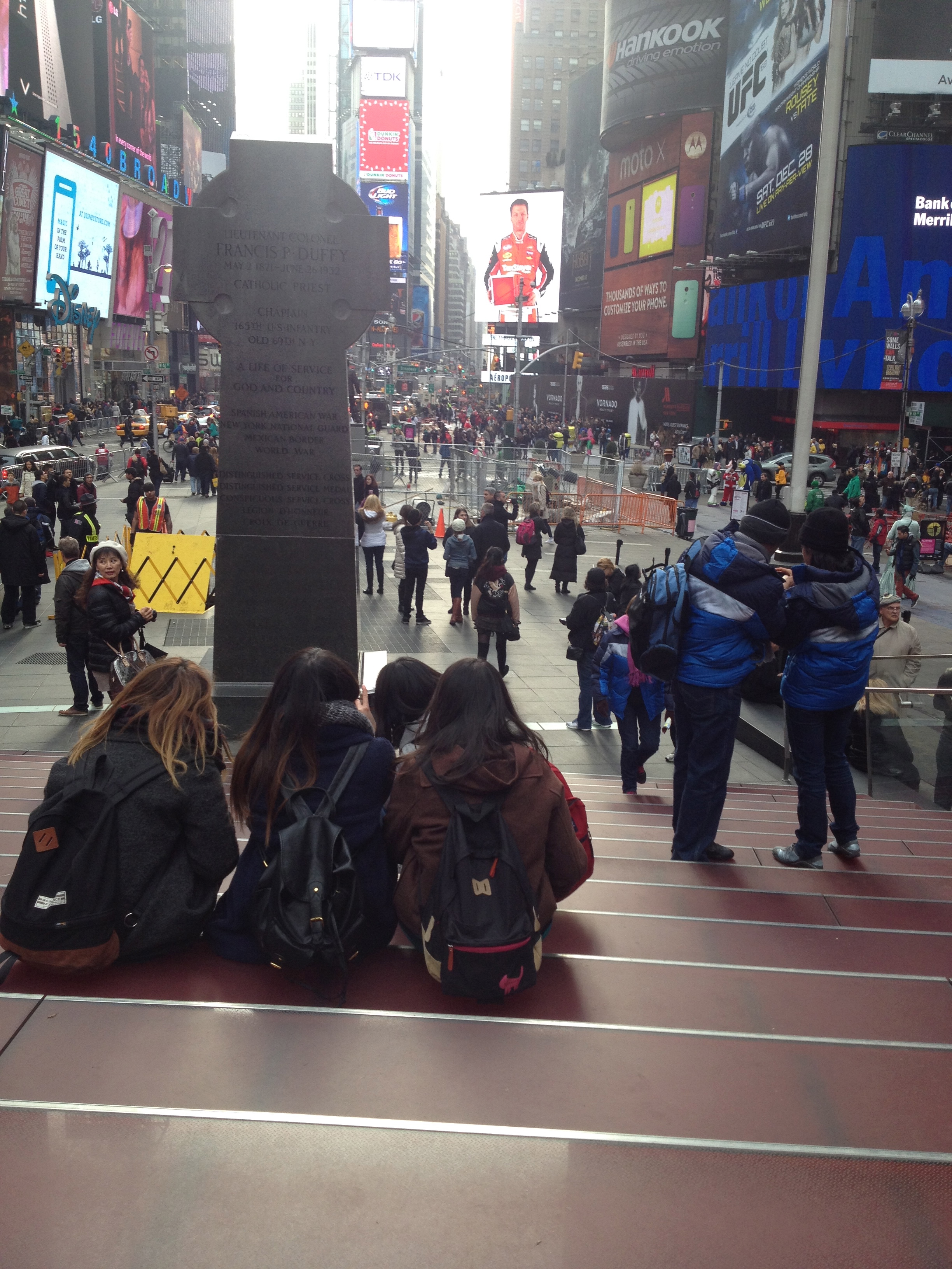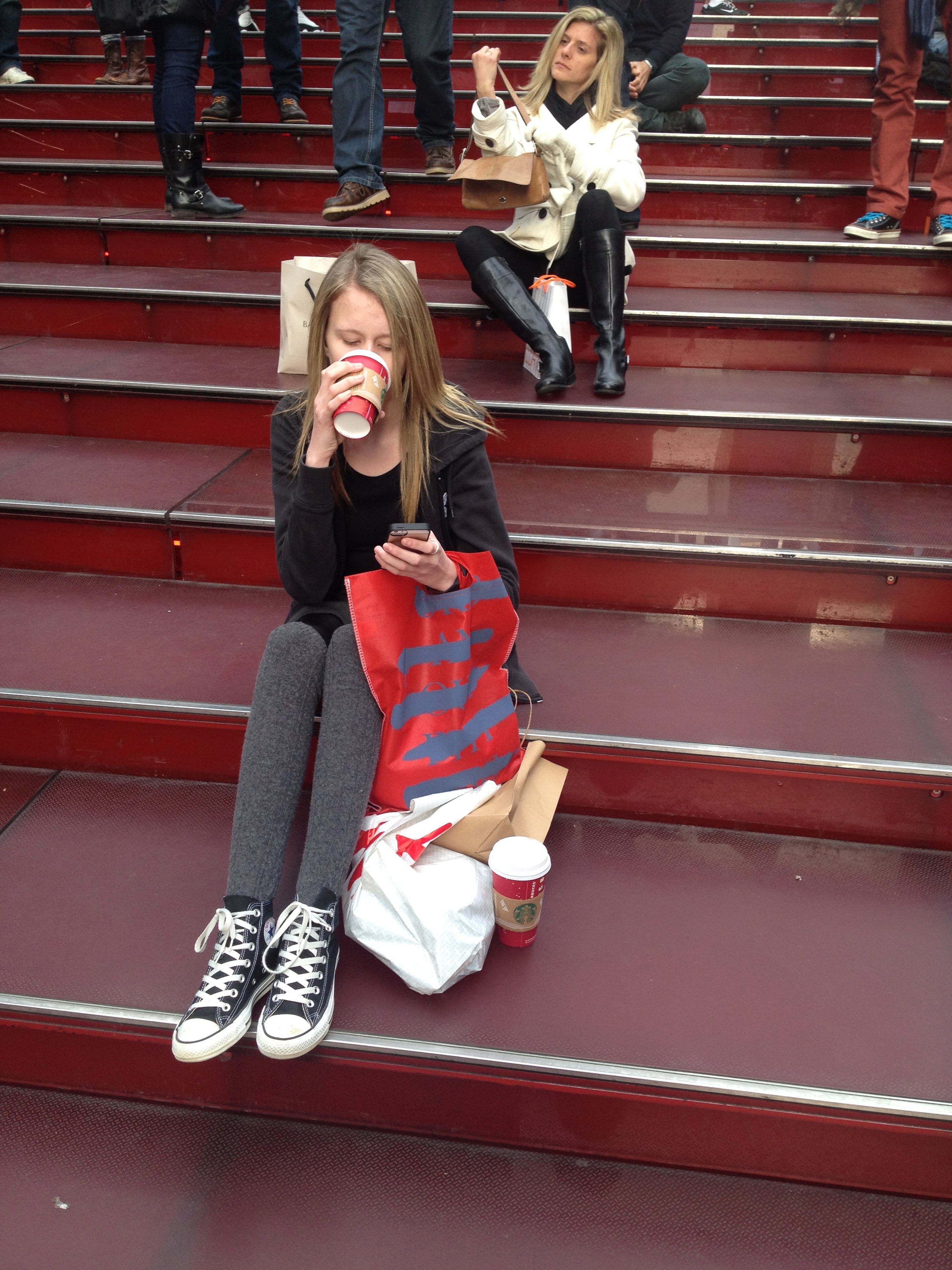 När vi var i New York förra sommaren hade jag och Tess planerat att vi skulle sitta i den berömda röda trappan vid Times Square och titta på folkvimlet, men precis när vi satte oss den gången så öppnade sig himlen och det fullkomligt öste ner och åskade och blixtrade, så det var bara att springa sig till räddning. Men nu äntligen fick vi sitta där, vi hade en otrolig tur med vädret hela helgen. Temperaturen höll sig mellan 15 och 20 grader och solen sken. Underbart! Vi kunde till och med ta med oss kaffet och sitta i trappan och fika: