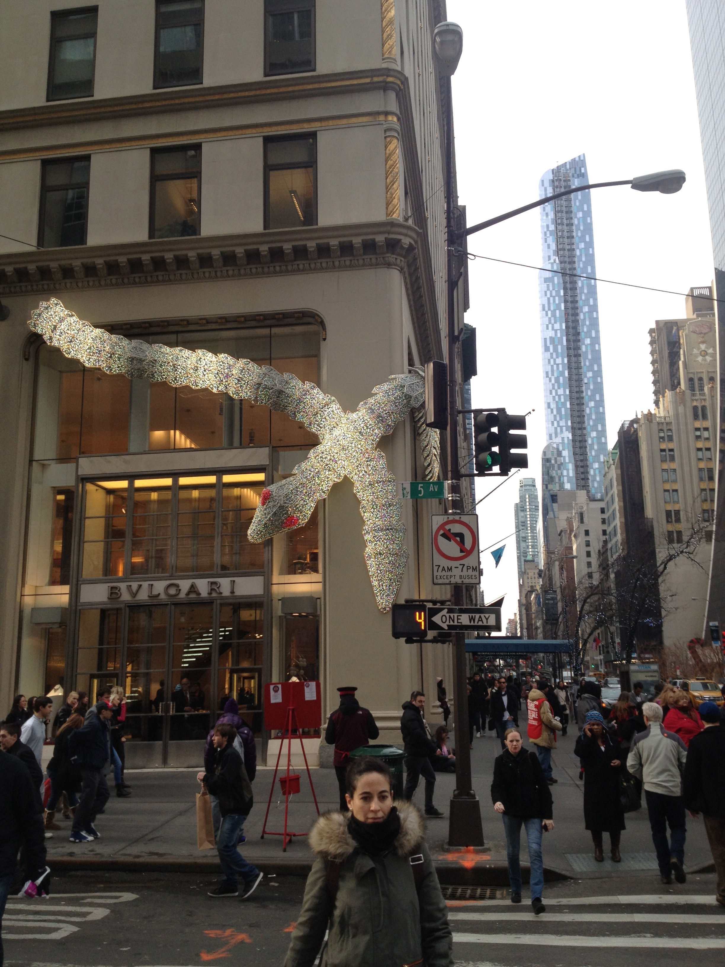 Vi trodde att det skulle vara fullt med juldekorationer över hela gatorna, girlander och ljus högt och lågt, men där blev vi besvikna. Göteborg har betydligt mer i den stilen än New York! Detta var en av få prydnader vi såg hänga över gatan: