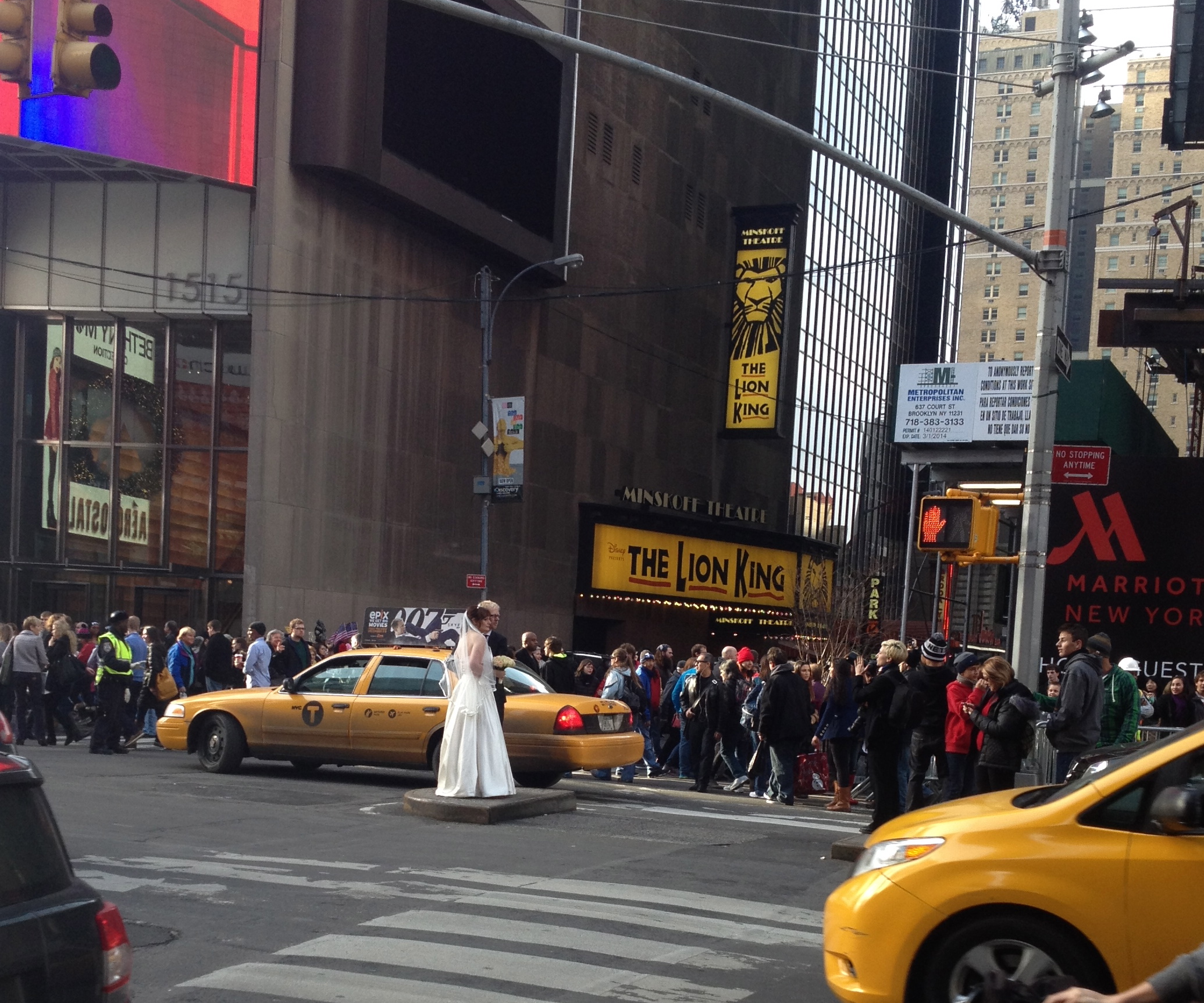 Mitt i folkvimlet och kaoset vid Times Square såg vi ett brudpar som tog sina bröllopskort: