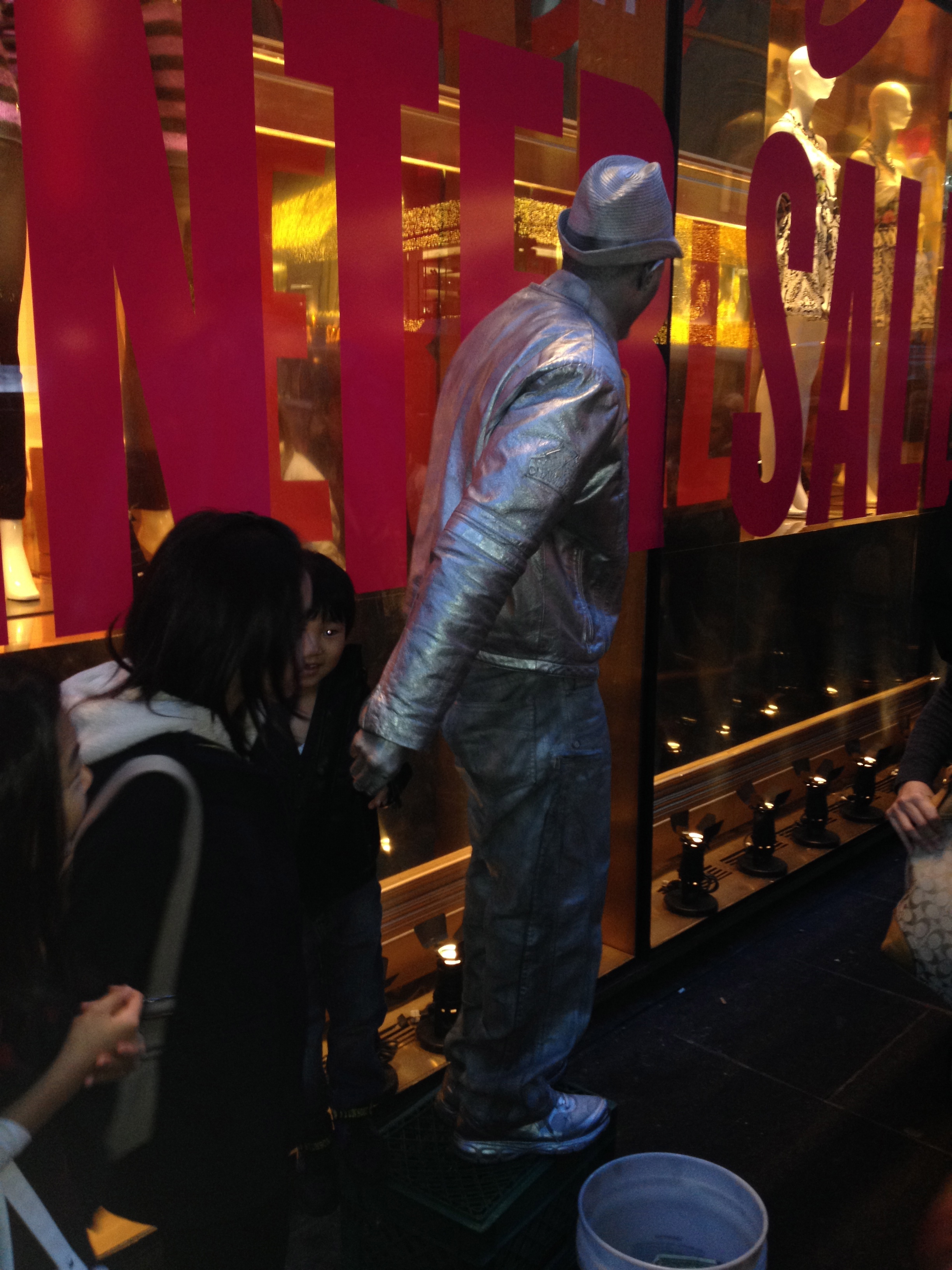 Just vid Times Square finns det hur många utklädda figurer som helst. Jag har alltid tyckt att det är lite kul, men denna gången blev det mest jobbigt till slut. Vet inte om det är för att det snart är jul så att alla vill ha in extra mycket pengar, men det enda det gick ut på var att tigga pengar av alla som gick förbi, och särskilt om man tog kort på dem förstås. När jag tog kort på Tess och Kakmonstret dök de andra två upp som gubben i lådan och ville absolut vara med på kortet, och sen kom alla tre och tryckte upp sina påsar i ansiktet på mig och ville ha ”tips” som betalning för kortet. Jag hade ingen lust att betala hur mycket som helst för att ta ett kort med min egen kamera, så jag gav dem en näve mynt var och det såg de inte direkt tacksamma ut för… Dan efter träffade vi på en silverfärgad figur (lite som Plåtmannen i Trollkarlen från Oz), och kom precis när en mamma lagt en dollar i hans påse för att fotografera honom ihop med sitt barn. Jag drog fram mobilen och ville ta kort på dem jag också, men då vände han sig blixtsnabbt om så att jag inte skulle hinna göra det eftersom jag inte betalat…
