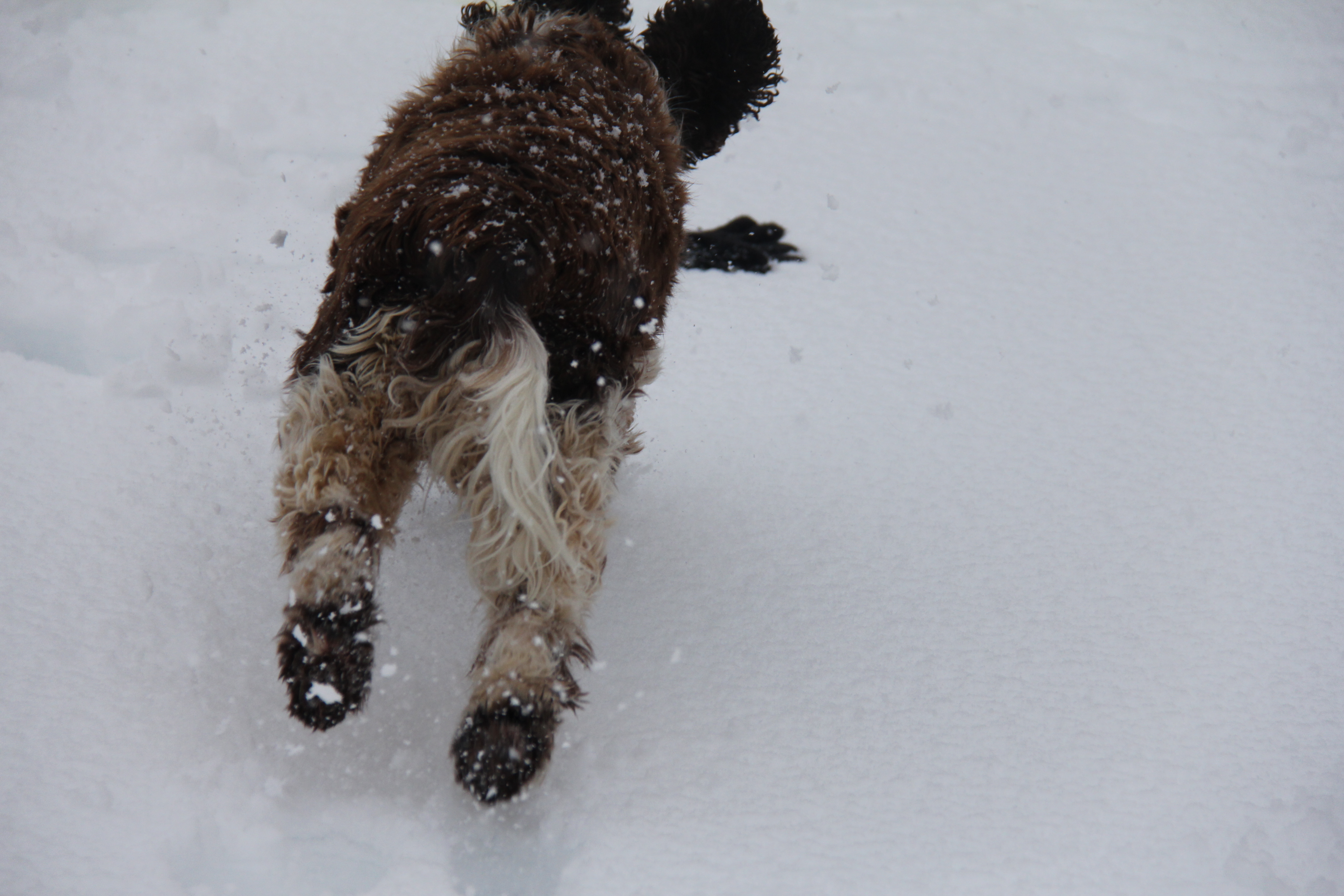 Det kom 6 inches (ca 15 cm)  snö igår, och fortsatte snöa under natten. Frampå morgonen gick det över till underkylt regn så att det la sig som en skorpa över snön. Så här såg det ut när jag var ute med hundarna på förmiddagen, inte en snöplog så långt ögat kunde nå förstås. Inget salt eller sand på vägarna heller…