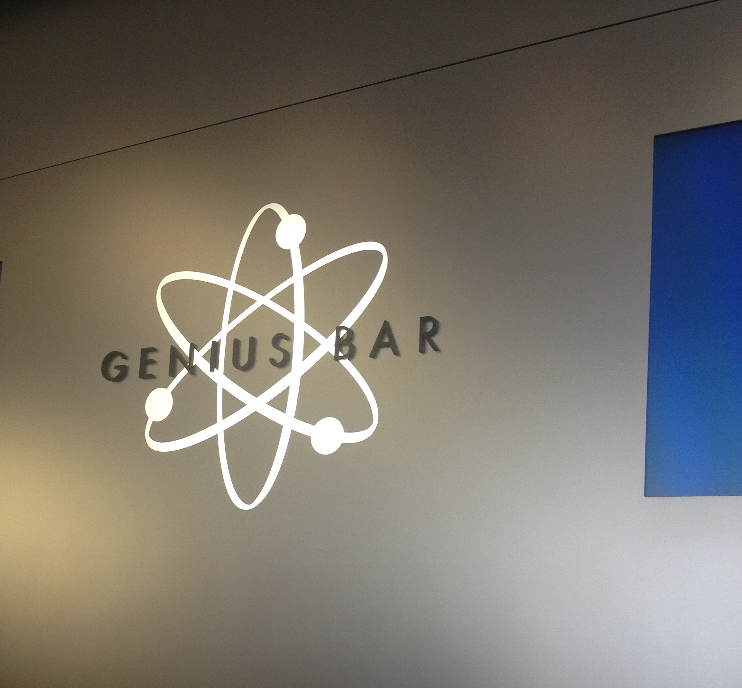 Teknikerna som jobbar med support och som fixar trasiga datorer hittar man längst in i affären, i ”Genius Bar”. Undrar hur det känns att vara anställd som geni? Måste se snyggt ut på visitkortet i alla fall!