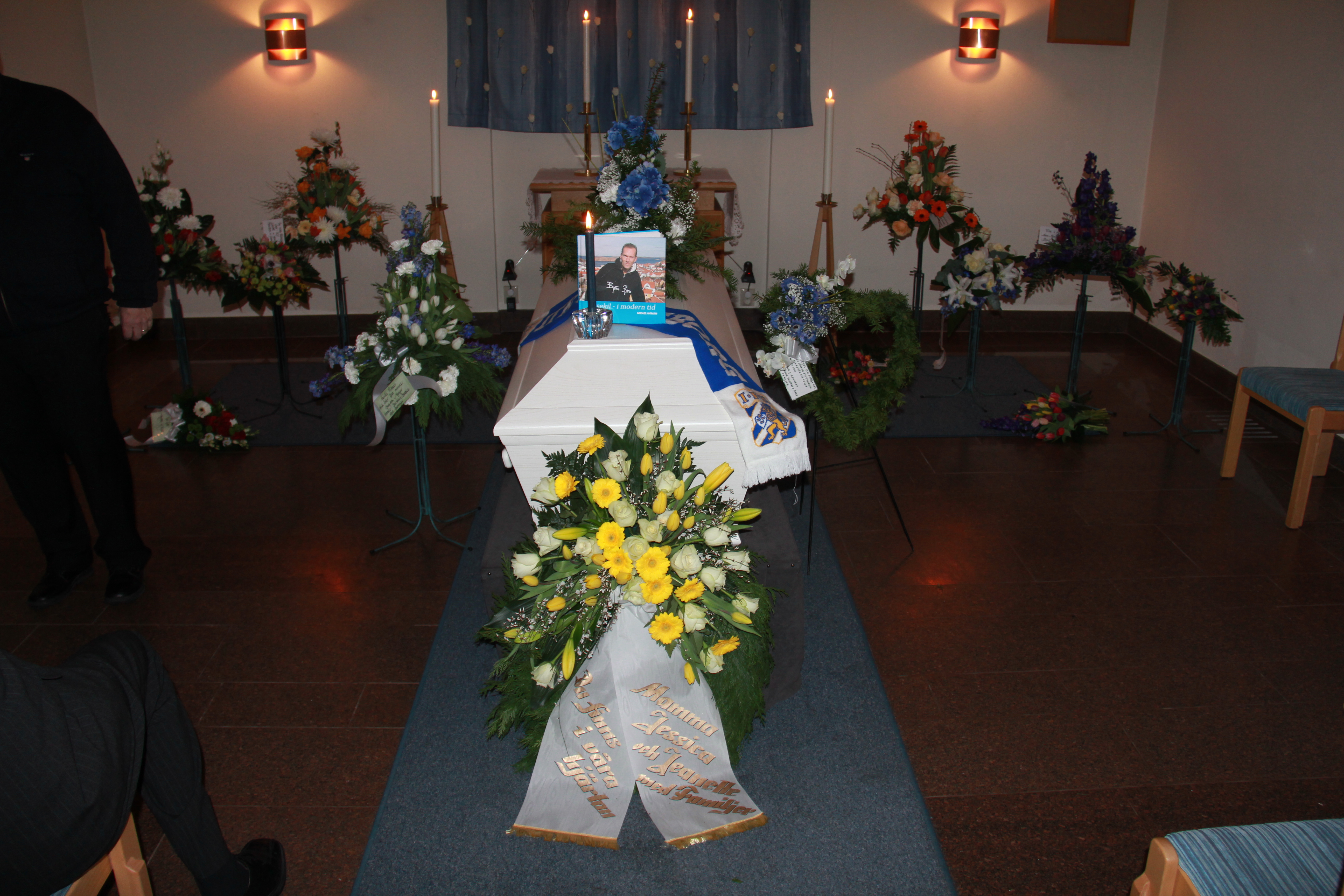 Hans kista var prydd med blåvita blommor, förstås, och en supporterhalsduk från IFK Göteborg. Väldigt fint arrangerat av faster Mona. Mamma lyckades hålla ett långt tal till Mikael där hon berättade om de ljusa och fina minnen hon har av honom.