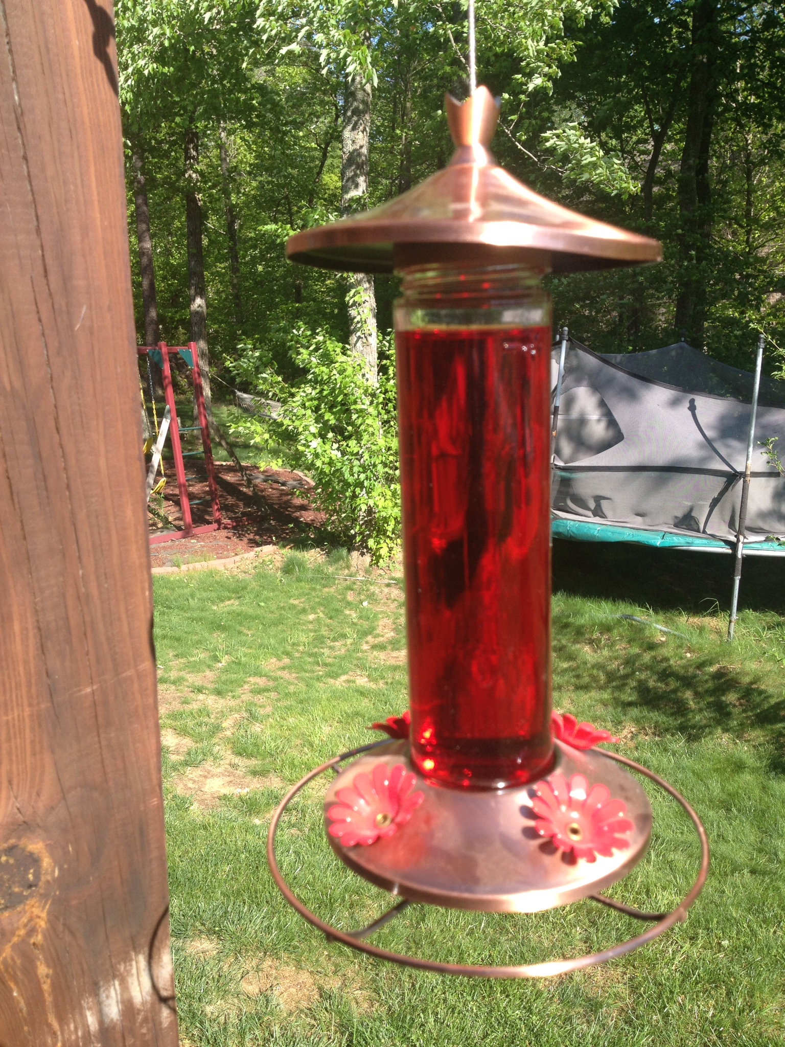 Visst är den fin? 🙂 Den gamla i plast var inte särskilt fräsch längre efter att ha hängt ute i två år så det var dags för en nyinvestering. Denna ska förhoppningsvis hålla sig snyggare, väldigt fin är den i riktigt glas och koppar istället för plast. Första kolibrin såg vi redan för en vecka sen men den gav sig av rätt fort igen när vi inte hade någon mat att bjuda på, hoppas den hittar hit snart igen nu när det finns mat i massor!