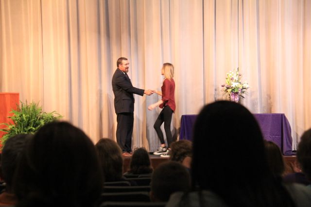 Sen var det dags för award ceremonin. Det är en stor skola med många elever, och många ämnen. Vissa lärare hade nominerat flera elever, och även om det även fanns lärare som inte nominerat någon alls så blev det ändå en himla massa awards. Matte var det sista ämnet, så efter 1,5 timmas väntan var det äntligen dags för Tess att ta emot sitt diplom! Här får hon först skaka hand med rektorn: