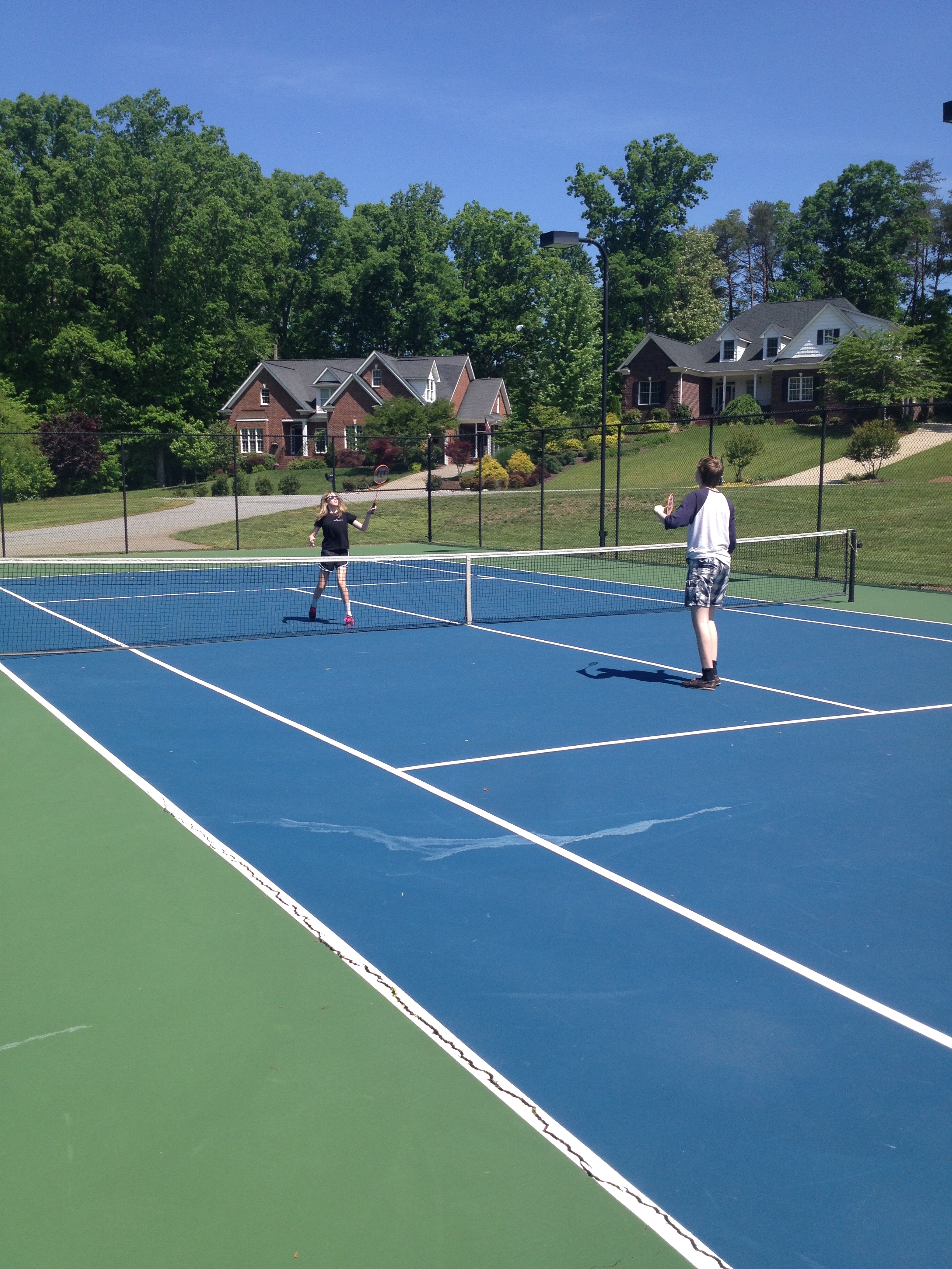 Tennisbanan är egentligen två banor bredvid varann, så vi kunde dela upp oss så att två spelade tennis och två badminton. Jättekul! Men oj så jobbigt… Det var ”bara” 25 grader varmt visserligen, men hög luftfuktighet så det tog på krafterna. Men helt klart behöver man jobba lite på kondisen… 🙂