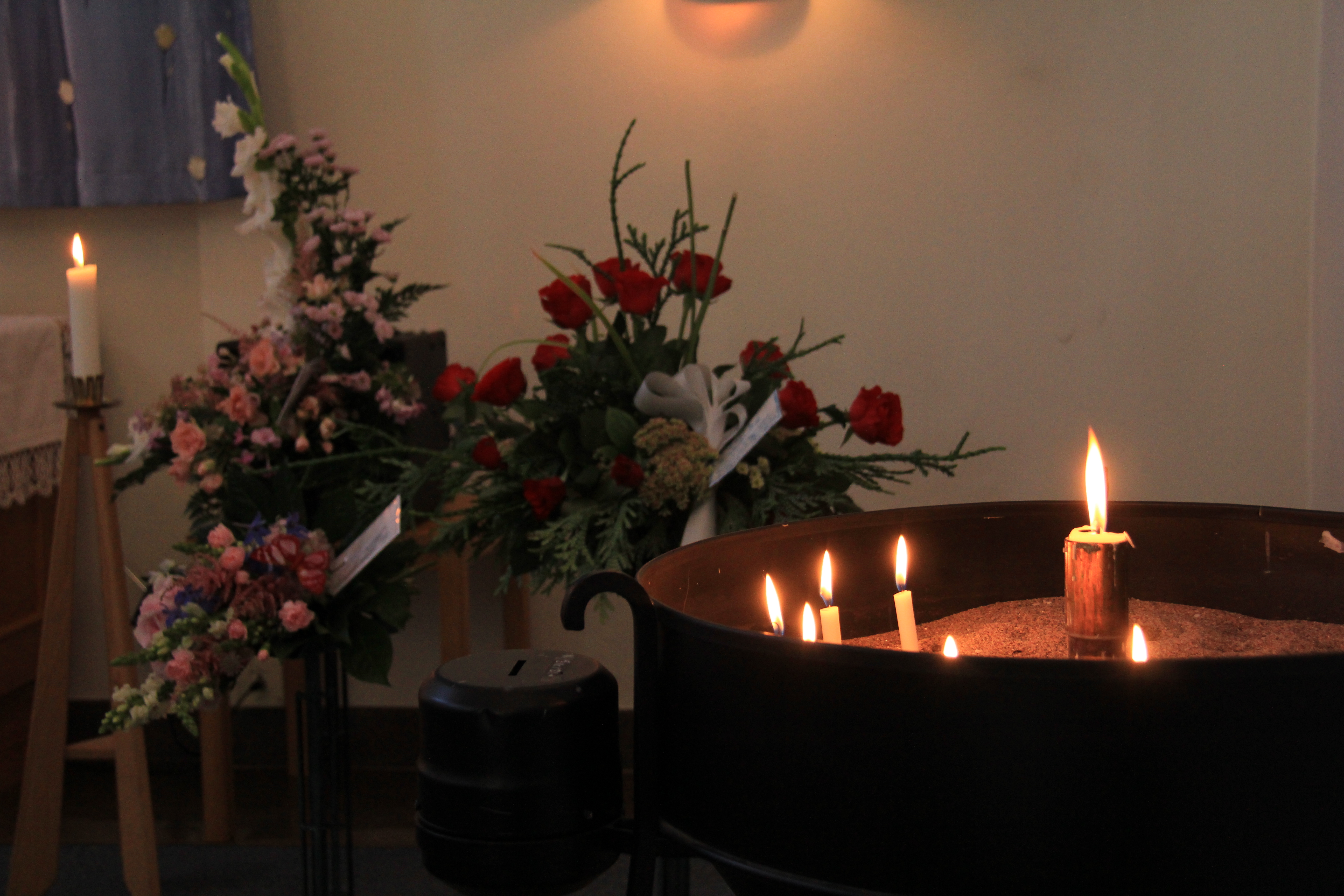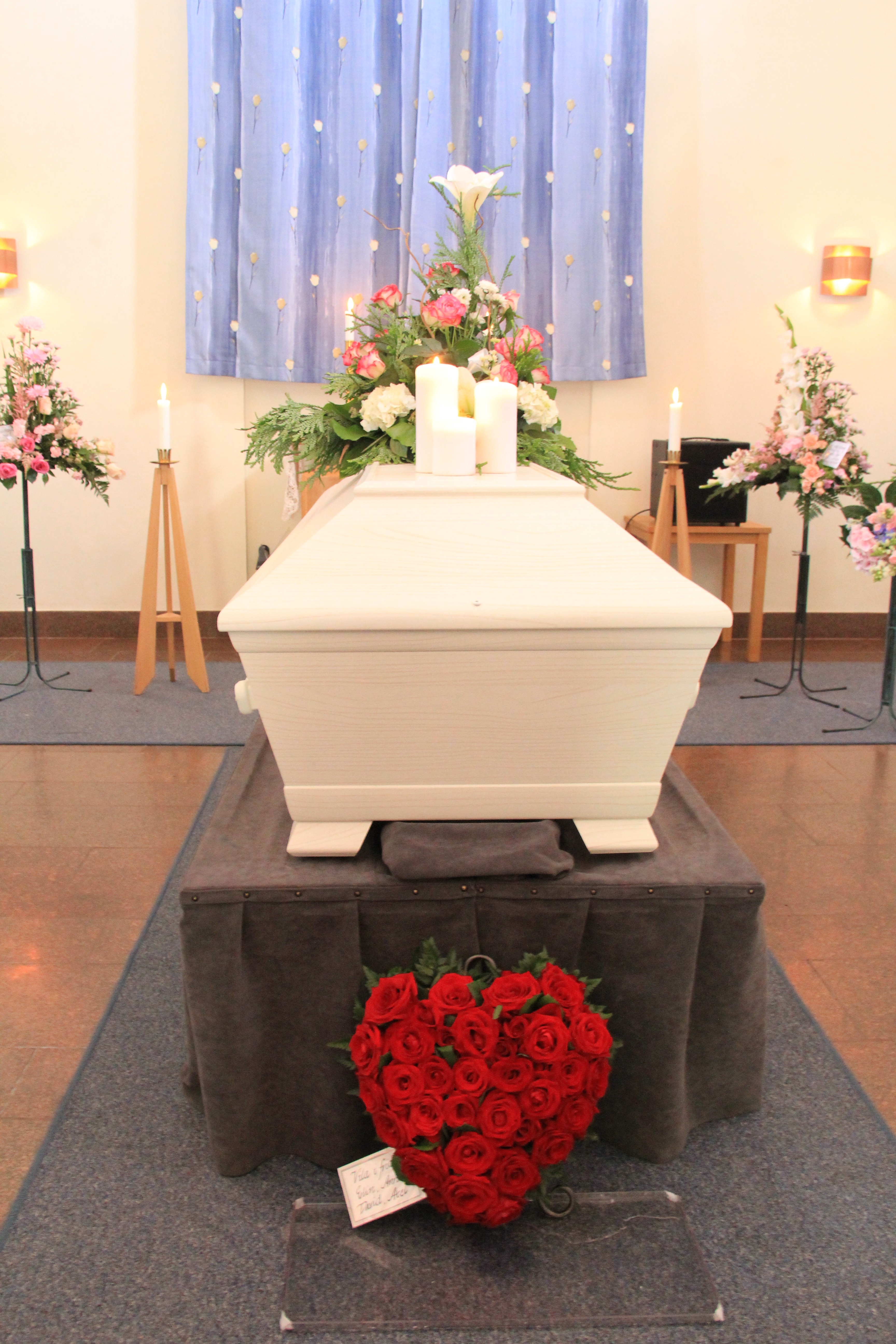 De tre ljusen på kistan representerar mamma, pappa och Mikael. Vår faster Mona gjorde kistdekorationen, precis som hon gjorde de tidigare dekorationerna. Jättefint och personligt.