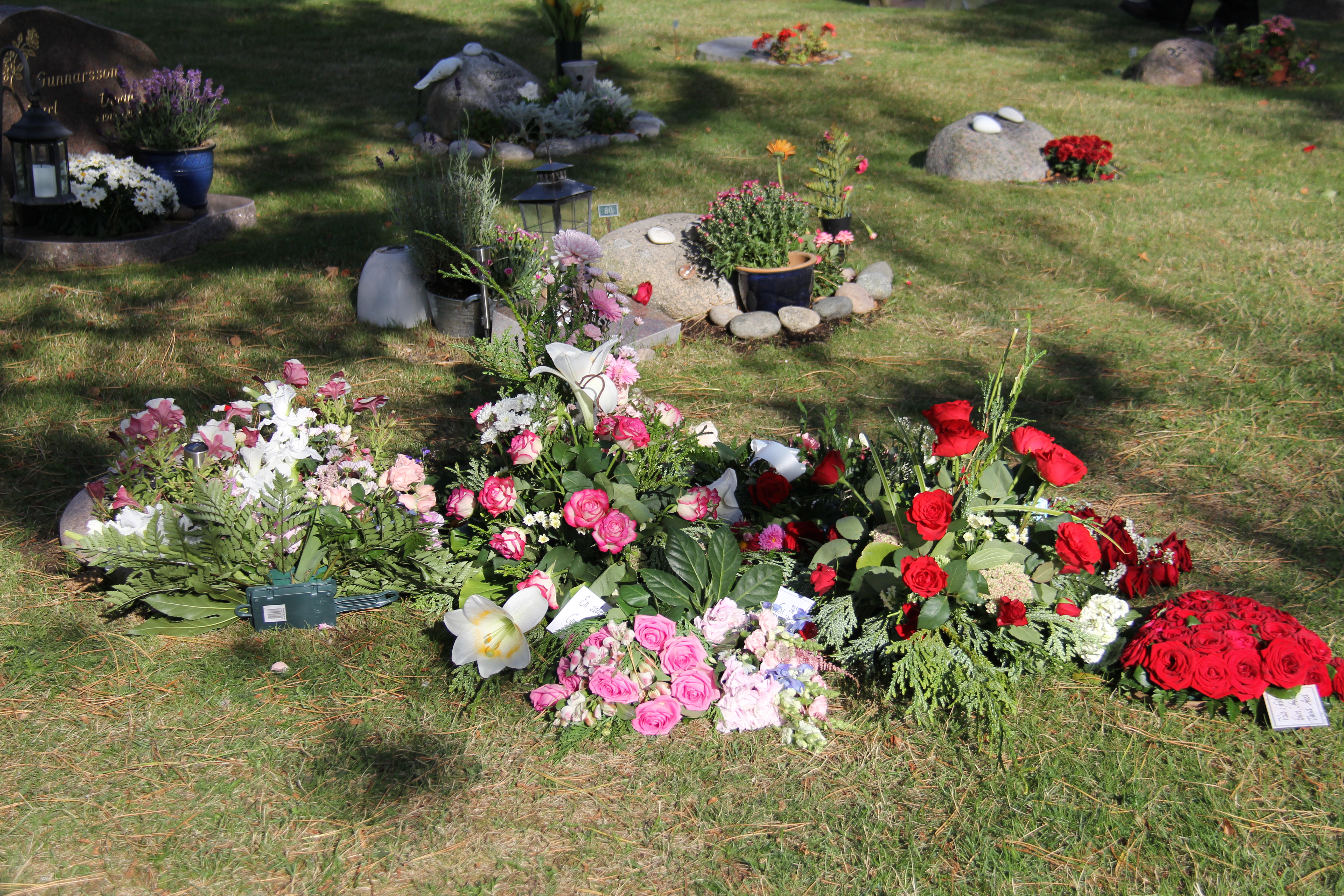 Senare åkte vi upp och tittade på graven, när de flyttat dit alla blommor. Mammas och pappas grav närmast, och precis bredvid ligger Mikael och hans son Johan. Nu är de samlade alla fyra, och kan ta hand om varandra.