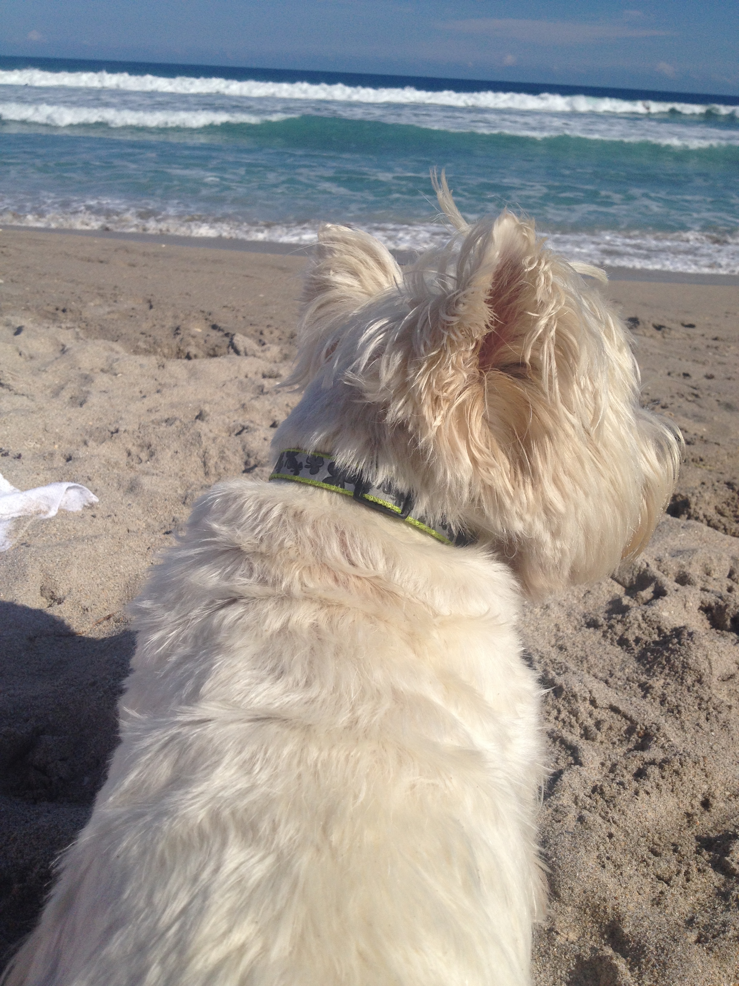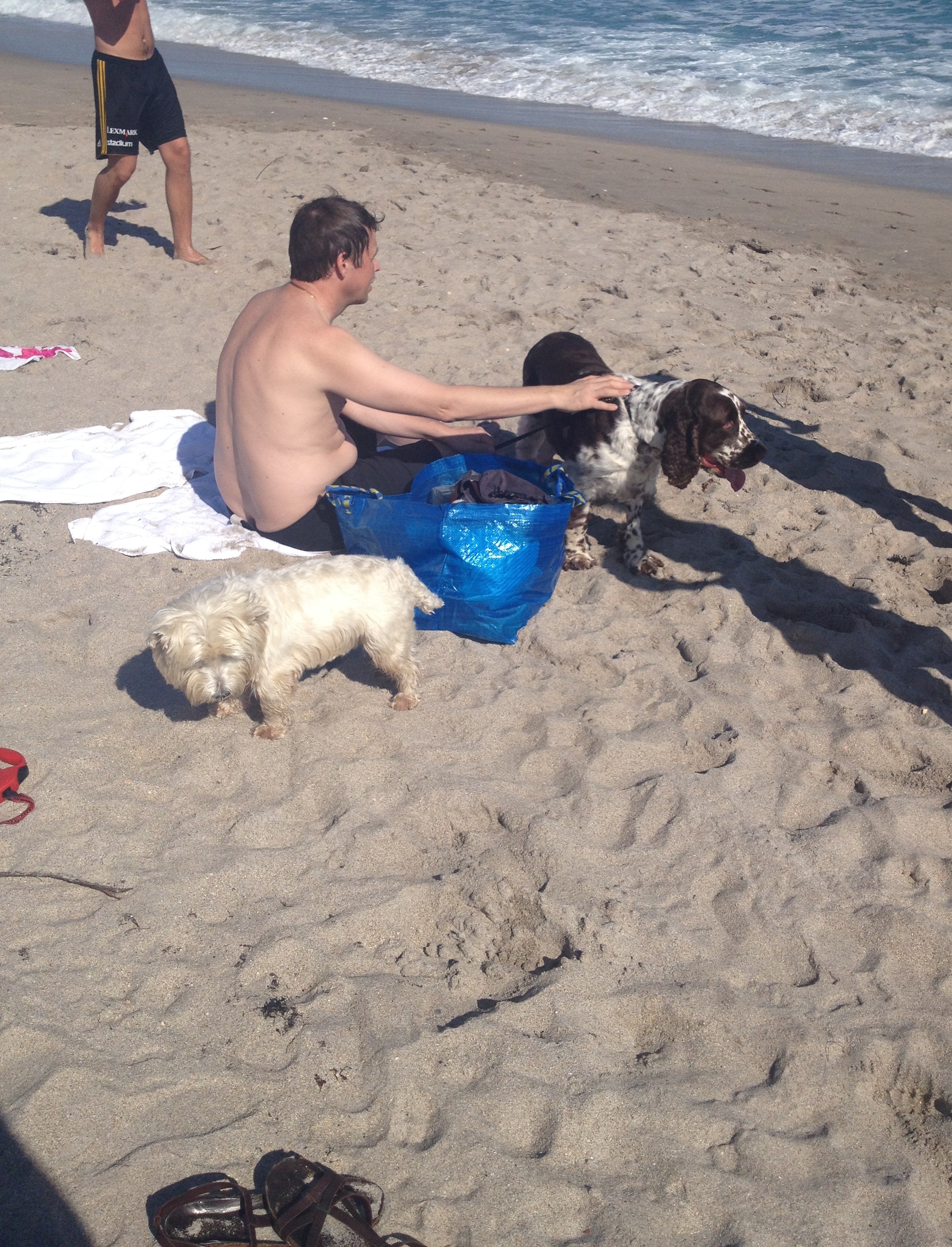 De två återstående dagarna var vi på ”hundstranden”, Walton Rock Beach, båda dagarna. En underbar strand, vi fick verkligen vårt lystmäte av sol och bad. Vågorna var jättehöga, särskilt första dagen, och det var gott om surfare en bit ut där vågorna var som högst. Strömmen var rejält stark så jag vågade mig inte på att simma, men Max simmade ut en bra bit (som tur var såg jag det aldrig annars hade jag nog fått lite panik…). Hundarna, i alla fall Morris, var i sjunde himlen. De flesta hundar sprang lösa på stranden så det fick Morris också göra och han hade fullt upp med att hälsa på alla andra hundar som gick förbi. Java med sitt gips fick finna sig i att sitta kopplad bredvid oss vilket väl inte var helt populärt men inte mycket att göra åt.