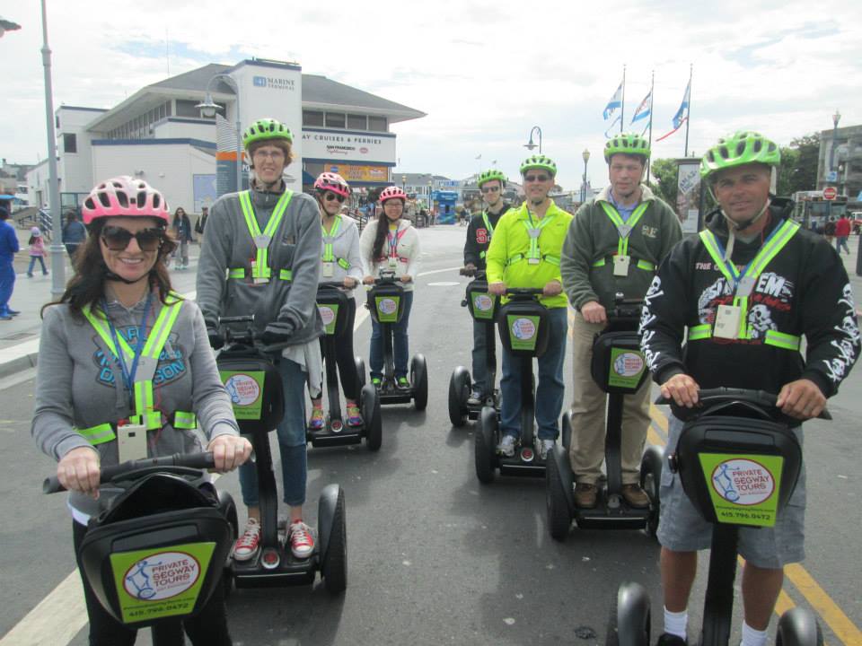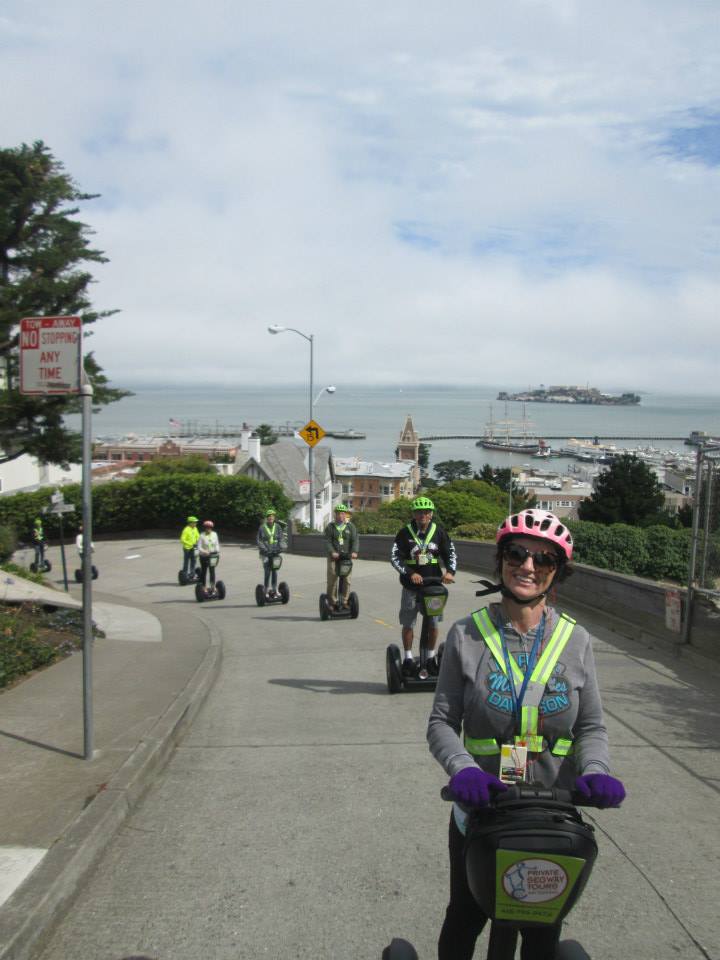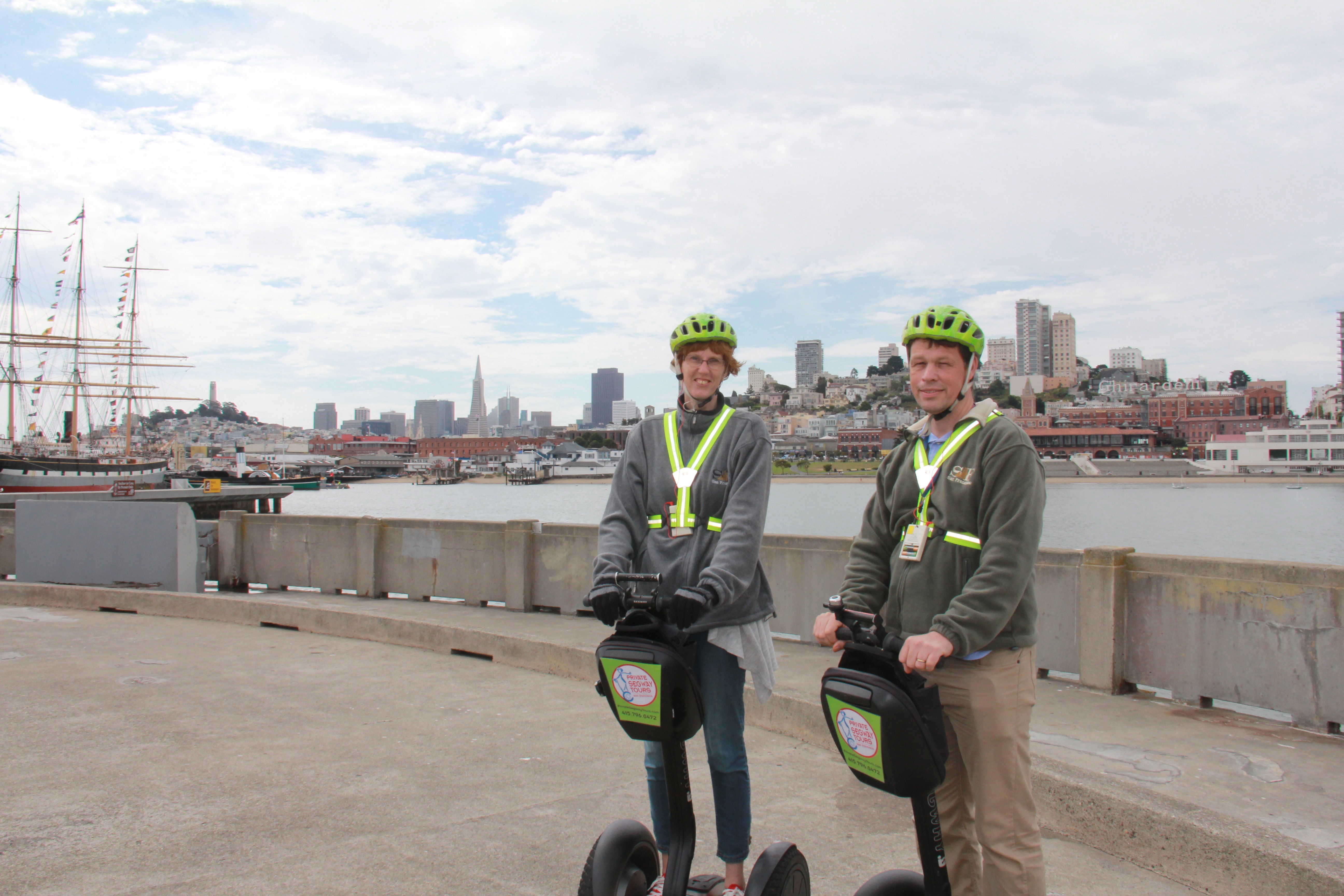 Dag två i San Fransisco var det dags för det vi sett fram emot mest – vi skulle på en rundtur med segway! Turen utgick från Fisherman’s Wharf, så vid 8 på morgonen tog vi en cable car ner till hamnen. Jag, som alltid packar ner kläder för alla fyra årstider om vi så bara ska göra en dagstur, har uppenbarligen blivit bortskämd med att det alltid är varmt i North Carolina på sommaren. Följaktligen hade vi bara packat sommarkläder och inte så mycket som en regnjacka ens en gång, utan vi tog för givet att vädret skulle vara bra. Men denna morgon var det knappt 15 grader varmt och blåste nere vid hamnen så vi kände att det nog skulle bli bra kallt att åka runt på en segway. Som tur var hittade vi en souveniraffär som öppnat tidigt så vi hoppade in där och hittade varsin rejäl fleecejacka. Nu var vi bättre rustade!