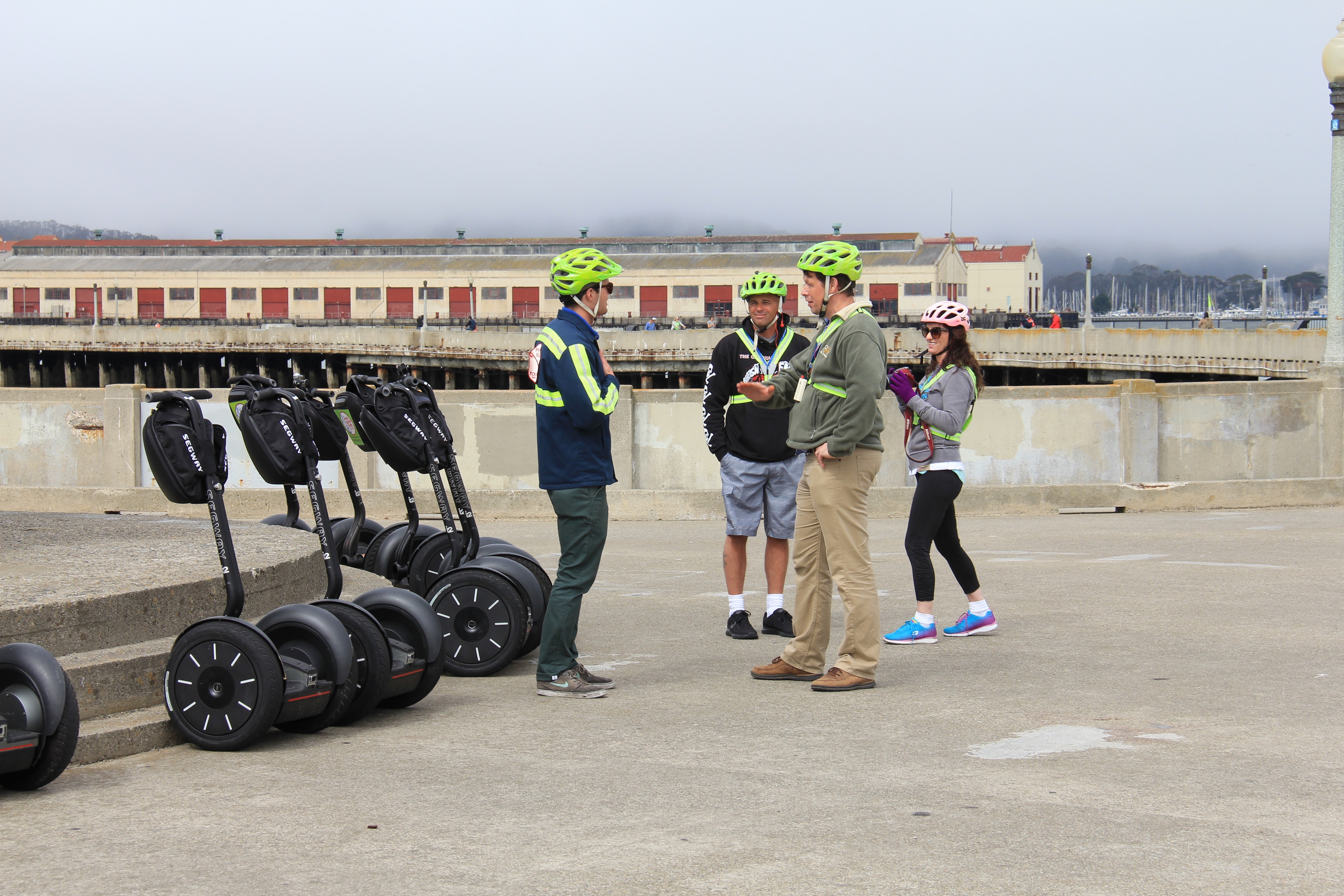 Lite vingligt kändes det först och svårt att få kläm på hur man tvärbromsar (om det skulle behövas) inne i den lilla lokalen men det kändes som om man hyfsat snabbt skulle få in känslan. Så efter bara ett par minuters ”övningskörning” per skalle så gav vi oss ut på San Fransiscos gator! Först längs med kajen och ner mot strandremsan där Björn och jag varit dan innan, där finns en pir man kan åka ut på där man har fin utsikt både in över stan och ut mot Alcatraz. Där parkerade vi våra segways och tog lite kort, och vi passade även på att köra fram och tillbaka på den nästan tomma piren så att vi fick träna oss lite.