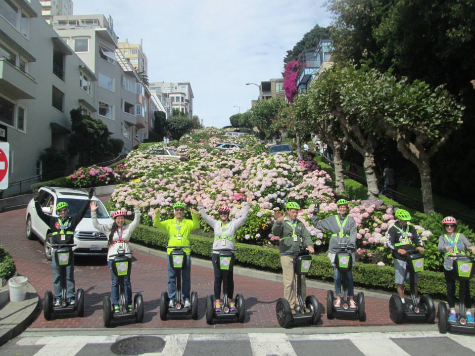 Sen ner igen och runt i kvarteren North Beach (som även kallas Little Italy) och Russian Hill. Ner från Russian Hill går en jättebrant backe som heter Lombard Street, och som är såpass brant att gatan går som en serpentin hela vägen ner. Ner där skulle alltså vi… Jag var kallsvettig av nervositet ska jag säga, jag gillar inte höga höjder alls och absolut inte att störta nerför i 100 km/h eller så som det kändes som att jag skulle göra… Men det gick jättebra, jag fick bra kläm på hur man skulle bromsa sig ner och hade inga problem alls. Såhär fint såg det ut när vi tog oss ner allihop!