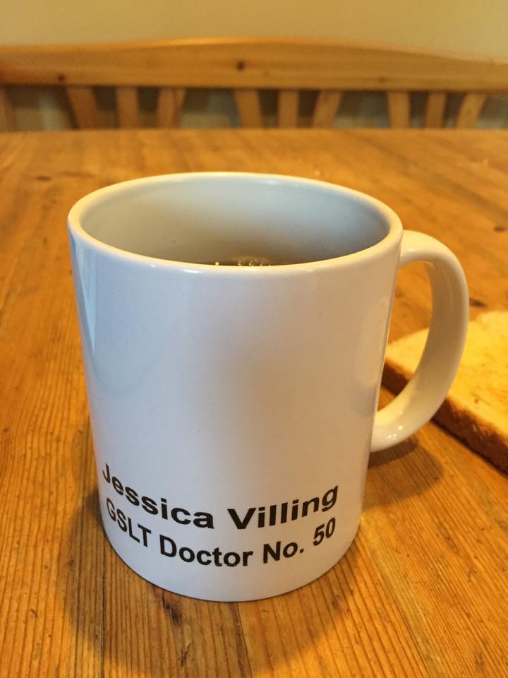 En present visste jag om att jag skulle få, och den är speciell för alla oss doktorander som gått på forskarskolan GSLT. Varje nybliven doktor därifrån får nämligen en numrerad mugg, och den där muggen har varit lite som en hägring genom alla år av doktorandstudier. Man har tänkt på hur det kommer att kännas när man äntligen får den, och även undrat över vilket nummer man kommer att få förstås. Här får jag den äntligen, av min fantastiske bihandledare, tillika överhuvud för GSLT, Robin Cooper: