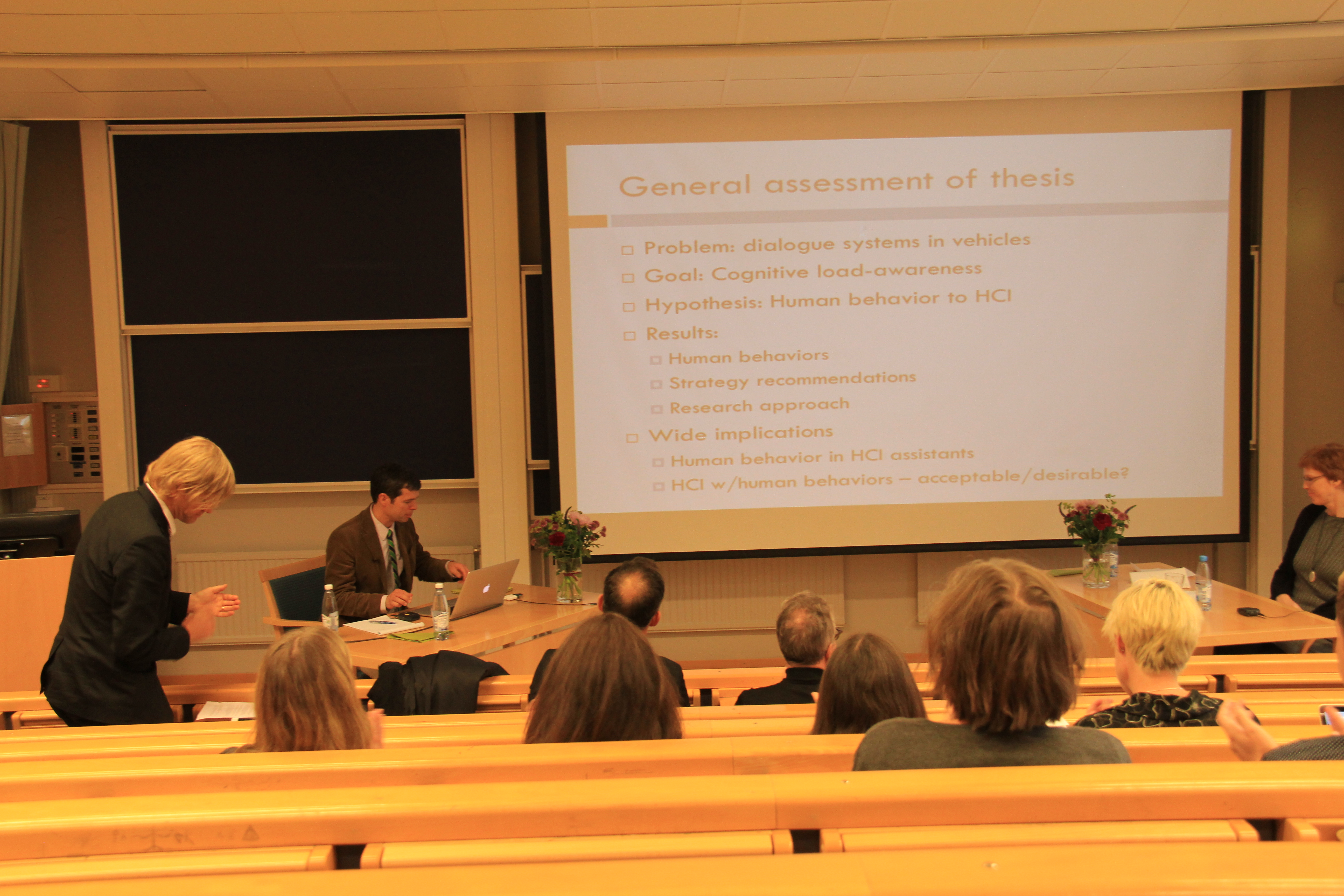 Sen började släkt, vänner och kollegor droppa in, och då kändes det lite bättre. Sen kom ju även min opponent, professor Andrew Kun från universitetet i New Hampshire. Jag hade mött honom på en konferens 2011, och både han och jag har suttit med i review-kommittén för den konferensen alltsedan dess, så jag kände honom ju lite grann åtminstone. Väldigt trevlig, så jag hoppades innerligt att han, i rollen som opponent, inte skulle krossa mig fullständigt! I betygsnämnden satt Ylva Hård af Segerstad, docent på institutionen för tillämpad IT på GU och Chalmers, Mattias Heldner, professor på KTH, och Trent Victor, adjungerad professor på Chalmers. Jag var jättenöjd med min betygsnämnd, det kändes som en bra sammansättning av kunskapsområden!